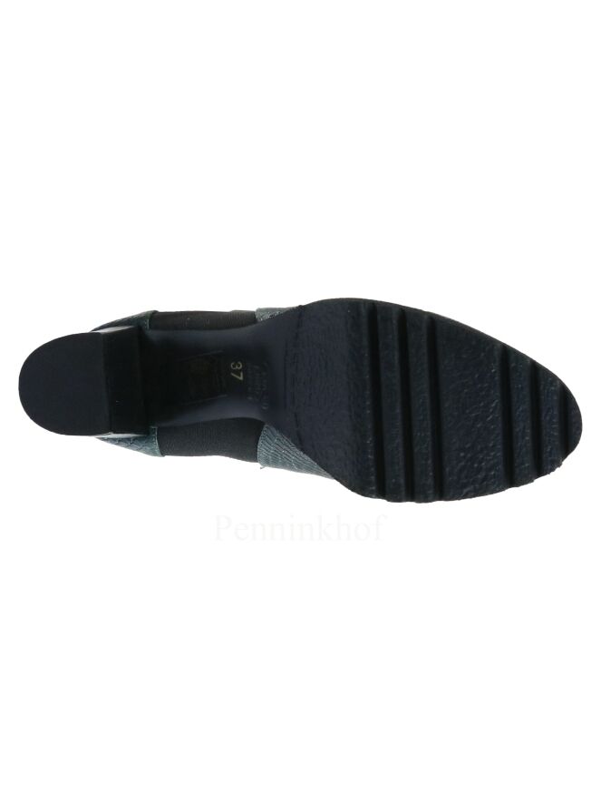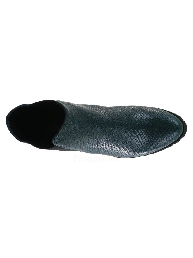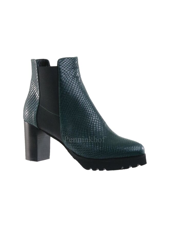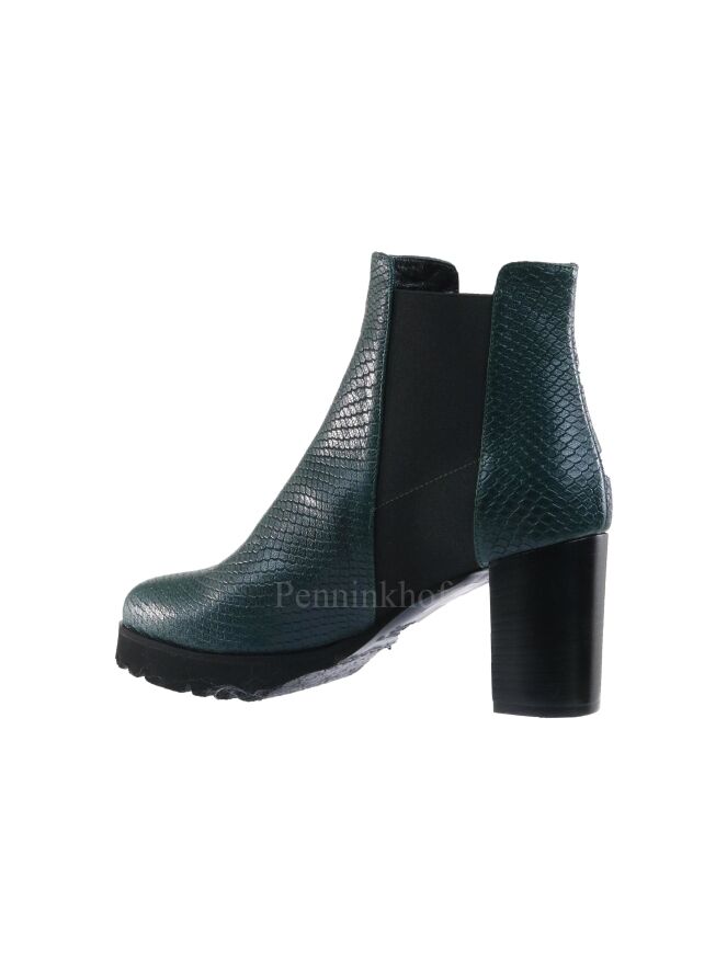 Bottine courte de la marque Cervone, en cuir façon reptile de couleur vert foncé. Elle présente une bande élastique de même couleur de chaque côté de la tige. La semelle crantée est de couleur noire. L'intérieur est doublé de cuir.