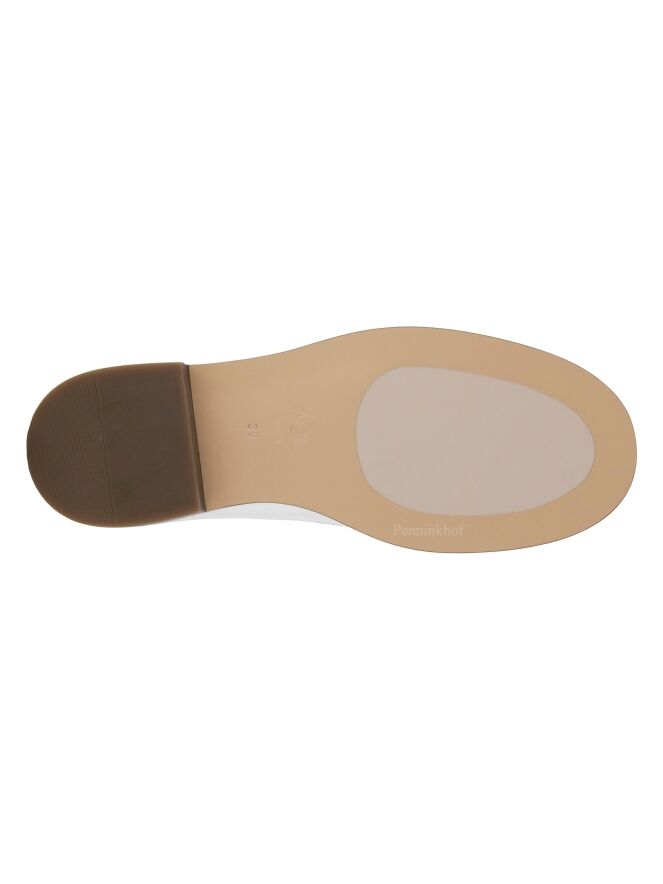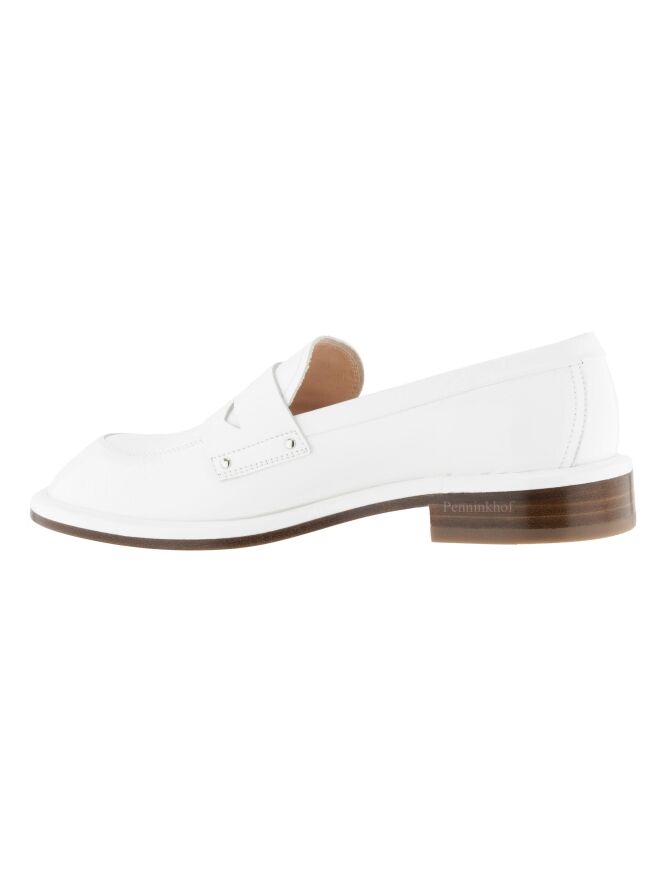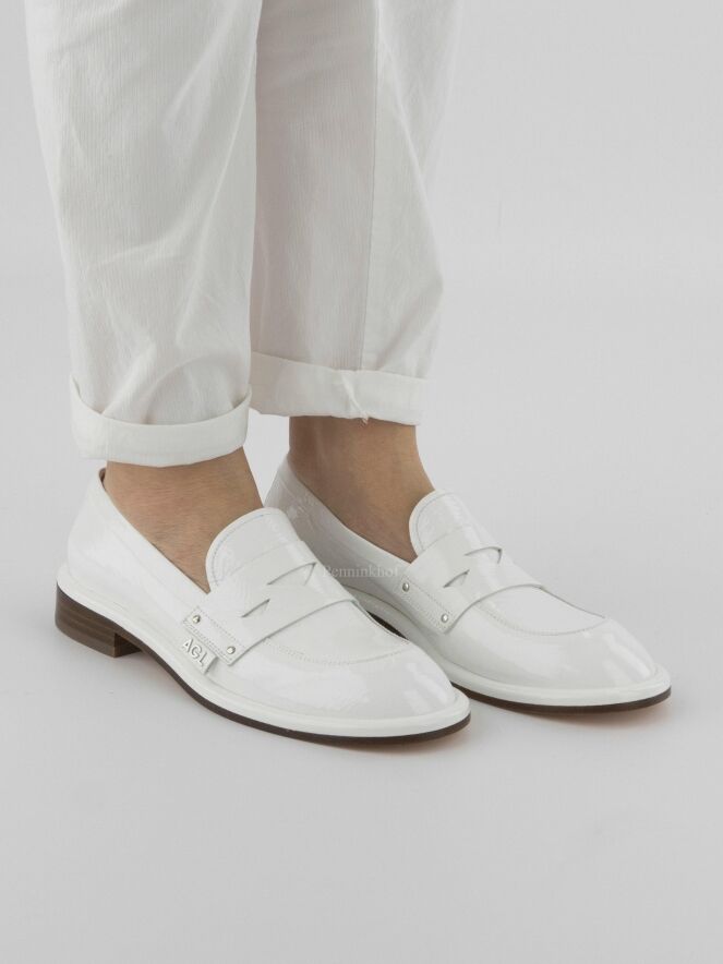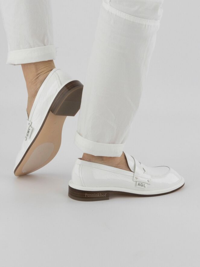 Mocassin design de la marque AGL, en cuir verni blanc crème. Le mocassin présente un nez rond. Une patte en dessin géométrique ciselé habille le haut du coup-de-pied. L'intérieur est doublé de cuir.