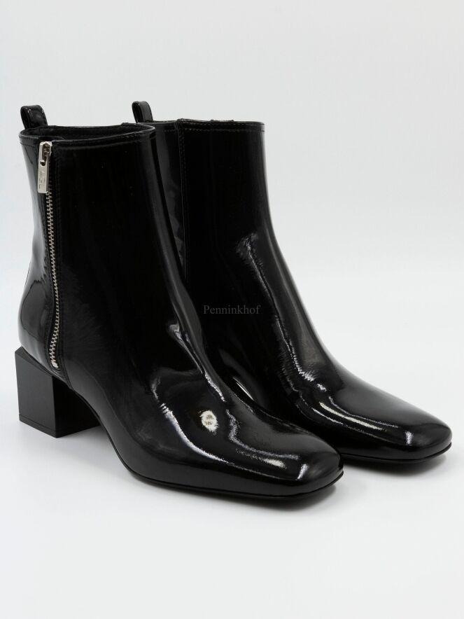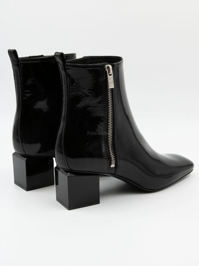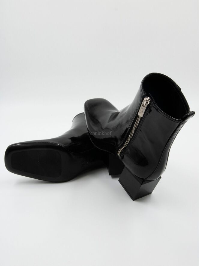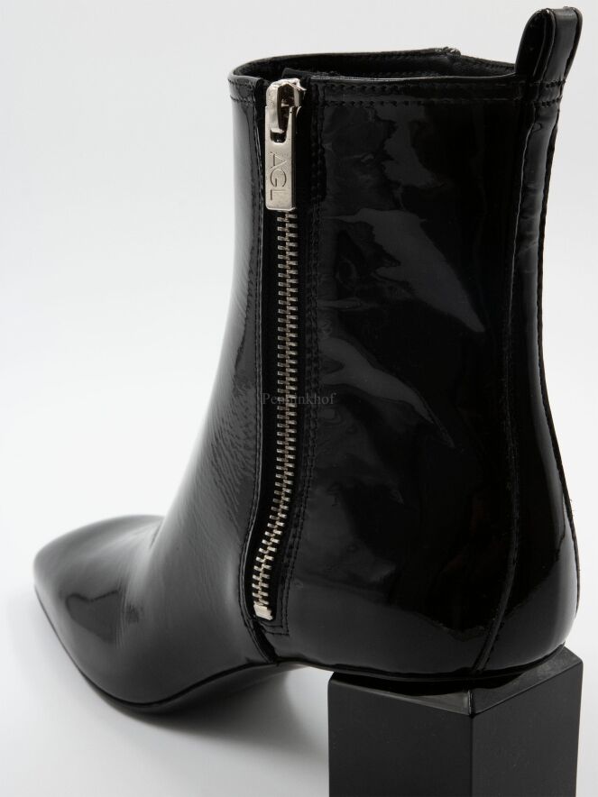 Une botte vernie d'AGL de couleur noire. La botte a un talon carré. Le bout est carré et à l'intérieur se trouve une fermeture éclair de couleur argentée. L'intérieur de la tige est doublé de cuir.
