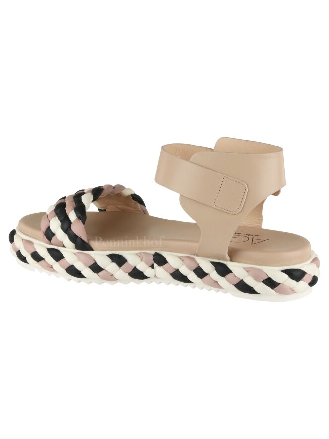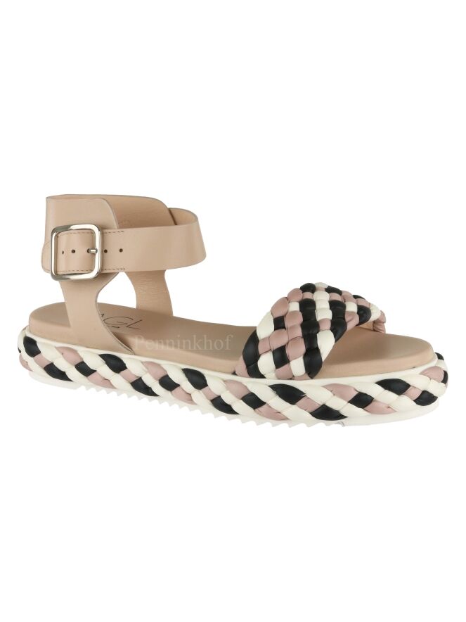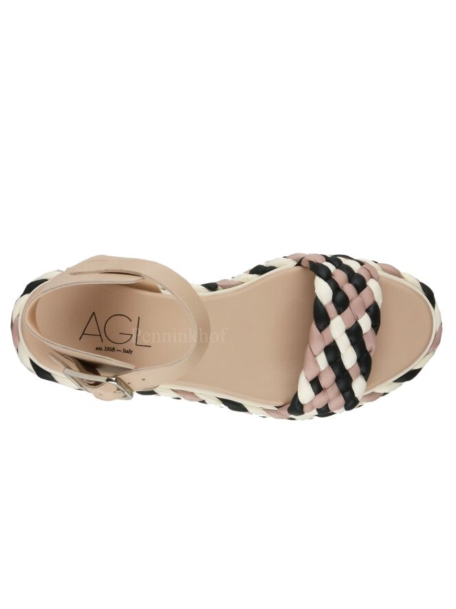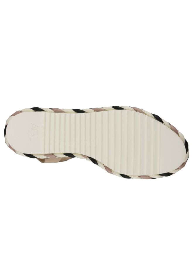 Sandale de la marque AGL de couleur chair. Une bande de tissu tressé de couleurs chair, blanc crème et noir est présente sur l'avant-pied et borde la semelle. Un passepoil décoratif blanc crème orne l'entre semelle intérieure et extérieure. La sandale est équipée d'une bride réglable autour de la cheville.