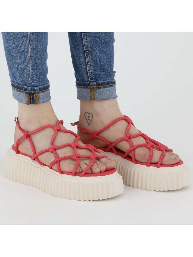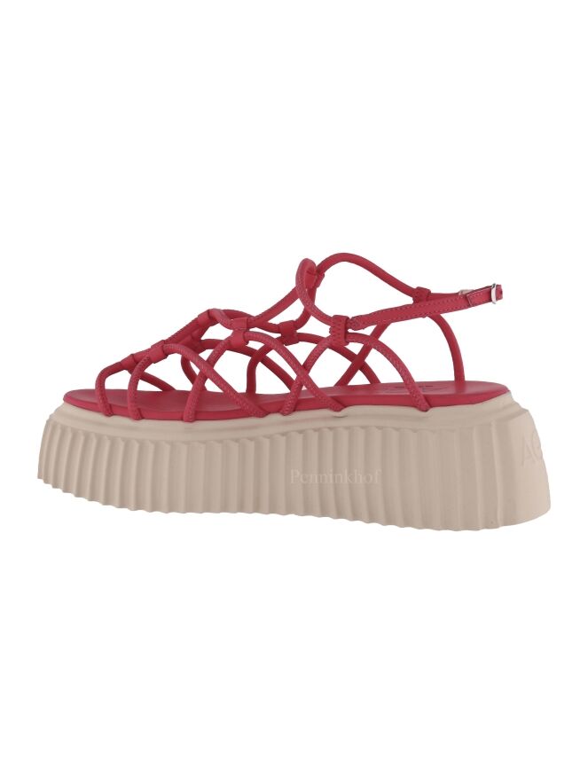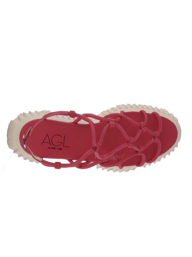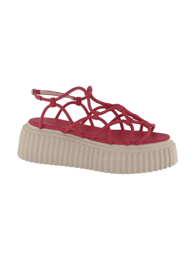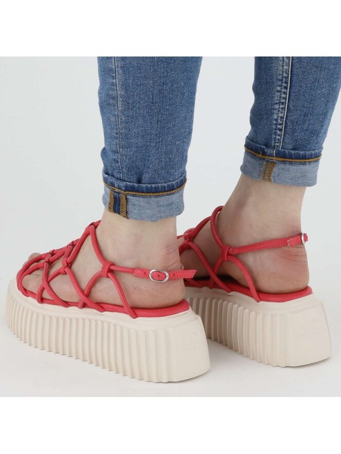 Sandale de la marque AGL, en cuir de couleur rouge framboise, avec de jolis cordons de cuir ondulant sur toute sa longueur. La sangle du talon est réglable. La semelle compensée est à grosses stries verticales.