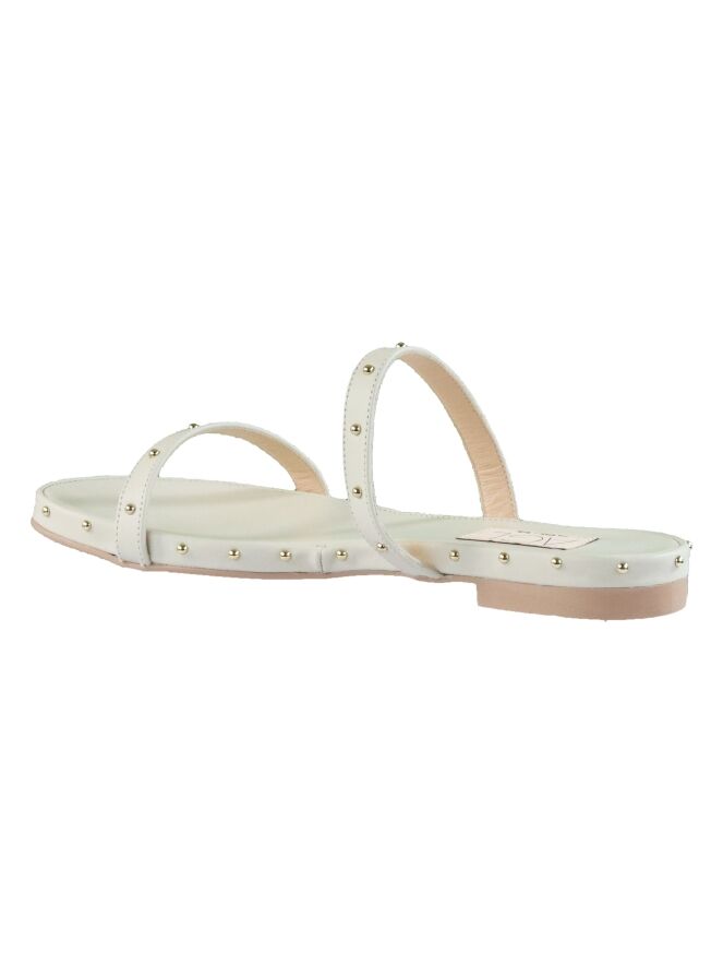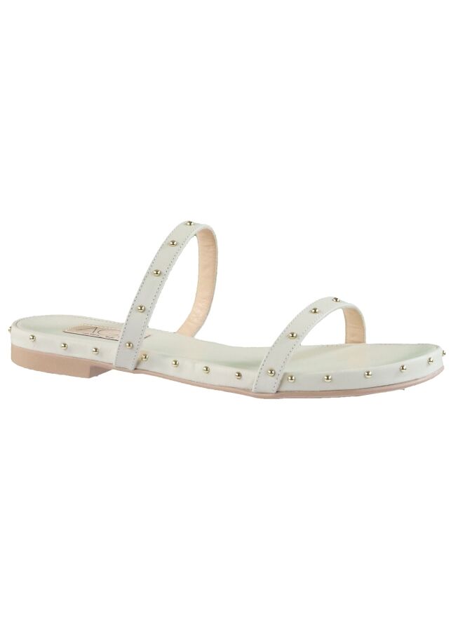 Sandale en cuir de couleur blanc crème, de la marque Attilio Giusti Leombruni. La sandale est composée de 2 lanières en cuir ornées de petits clous dorés sur l'avant-pied. Ces clous décoratifs se retrouvent également le long du bord de la semelle.