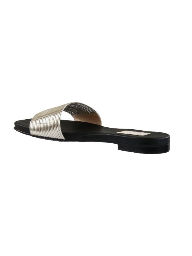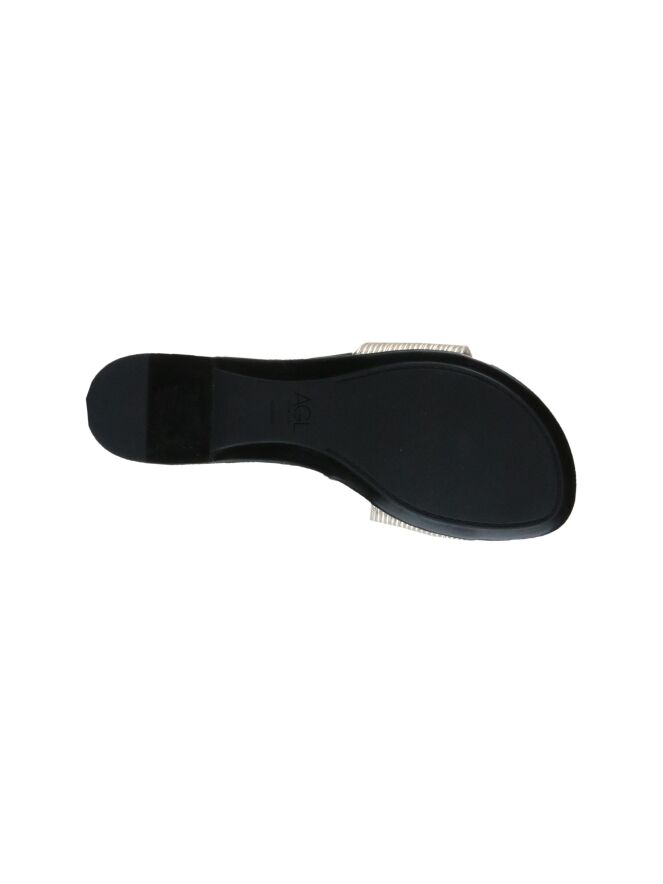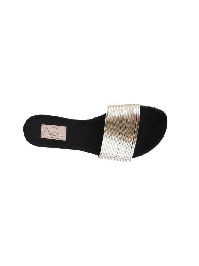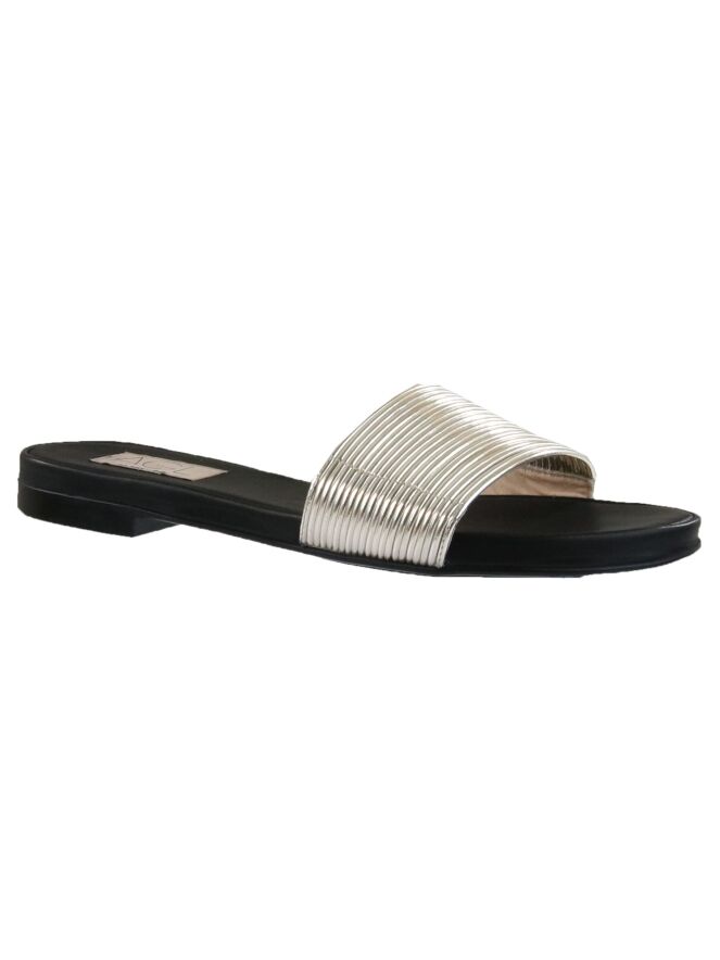 Sandale de la marque Attilio Giusti Leombruni, de couleur platine. L'avant-pied est recouvert de fines cordelettes en cuir assemblées sur une fine semelle noire.