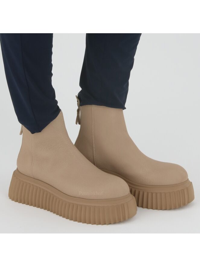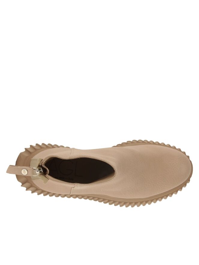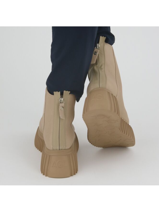 Botte courte de la marque AGL, en cuir de couleur chair. La botte est dotée d'une semelle à plate-forme côtelée beige. Une fermeture à glissière se trouve à l'arrière de la tige. L'intérieur est doublé de cuir.