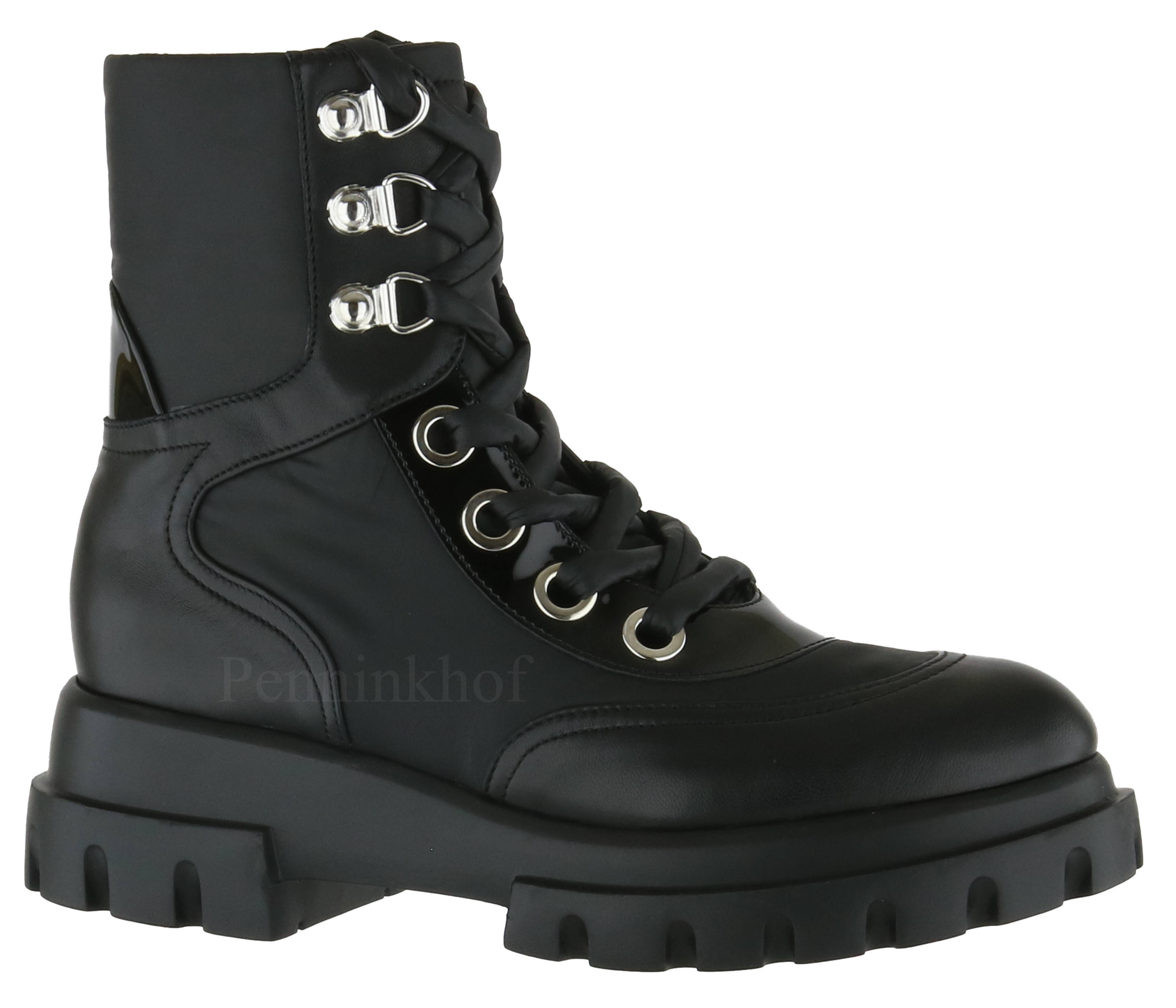 Botte courte de la marque AGL, en cuir de couleur noire. La botte présente une semelle de couleur noire au design sportif. Les côtés, les lacets et l'arrière de la tige sont réalisés dans un tissu de parachute noir mat. Un passepoil en cuir verni noir borde l'attache des lacets. Ces derniers sont accrochés par des anneaux et des œillets métalliques. Intérieur doublé cuir.