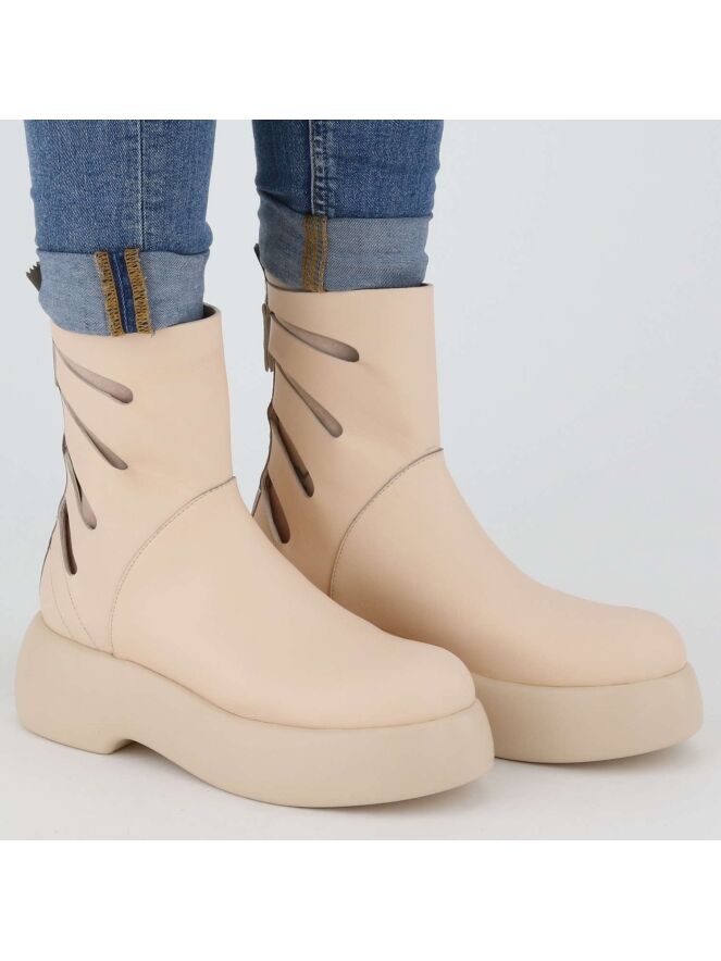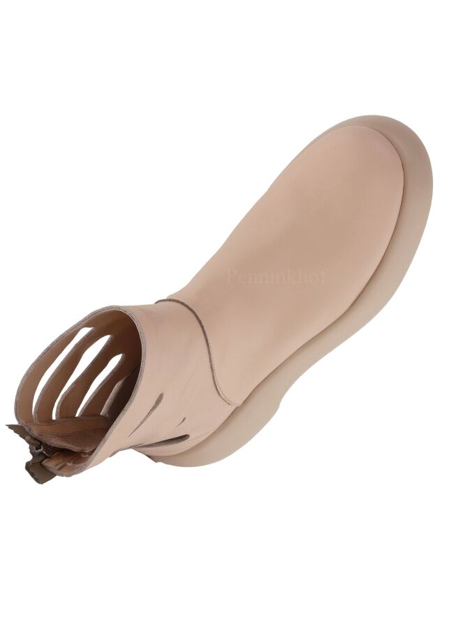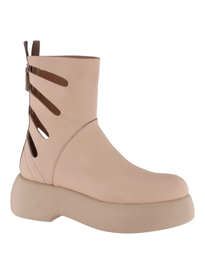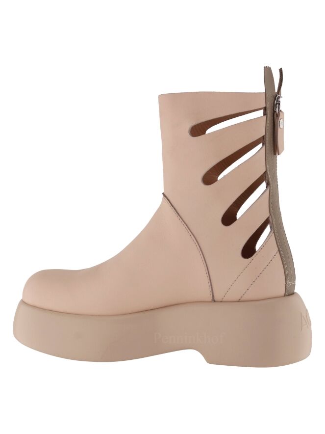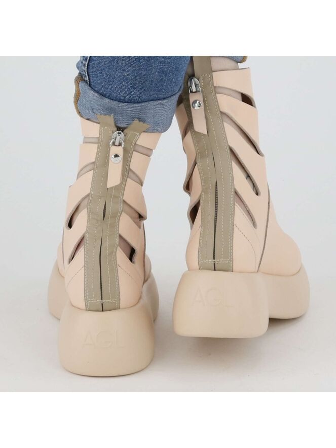 Botte de la marque AGL, de couleur chair. La botte est dotée d'une semelle à plateforme design dans une couleur chair plus claire. Les côtés de l'arbre ont des ouvertures allongées. Une fermeture Eclair beige vient habiller l'arrière de la botte sur toute sa hauteur.