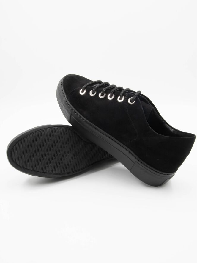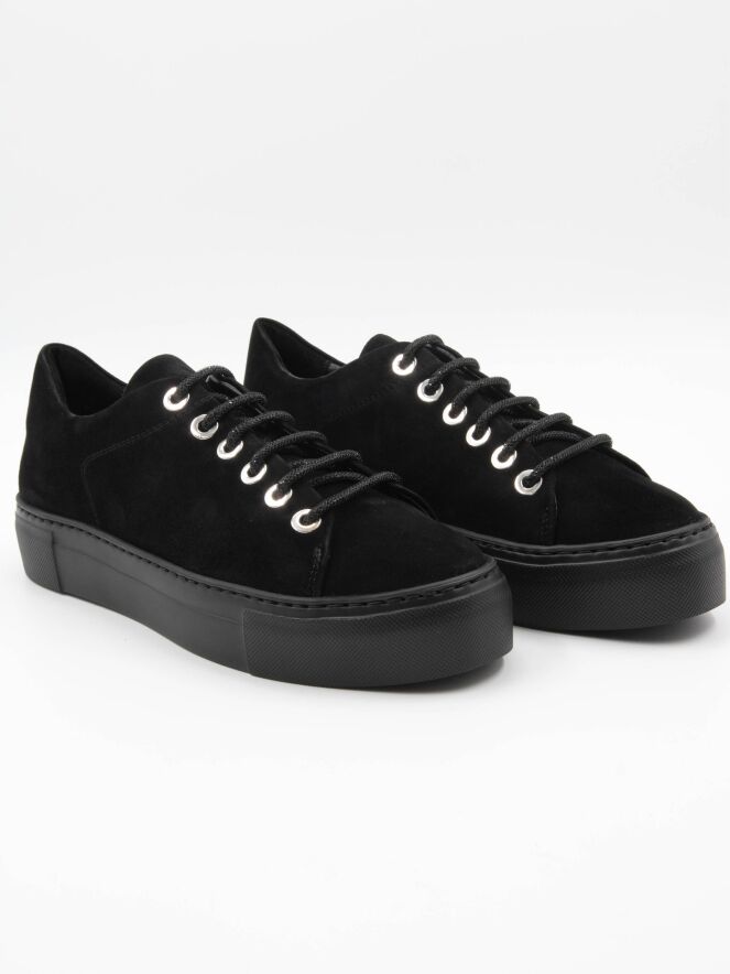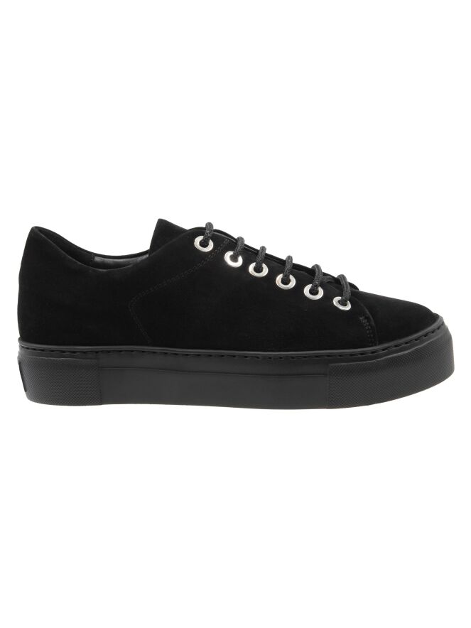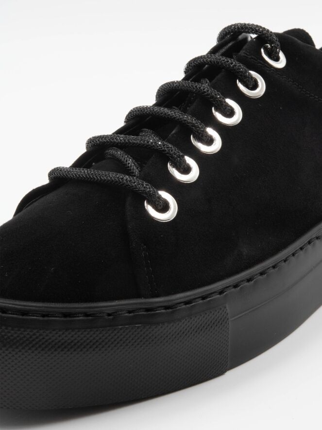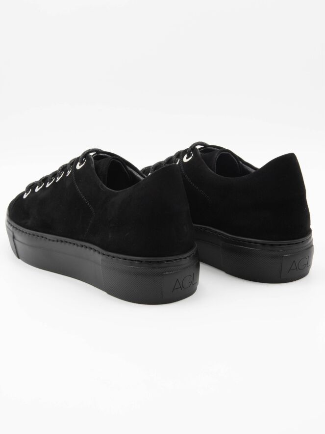 Une sneaker de luxe en nubuck noir de AGL. Les lacets sont fabriqués dans un matériau brillant et les œillets sont en métal argenté. La semelle plateforme est noire. L'intérieur est doublé de cuir.