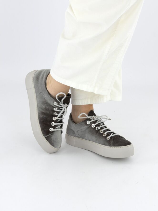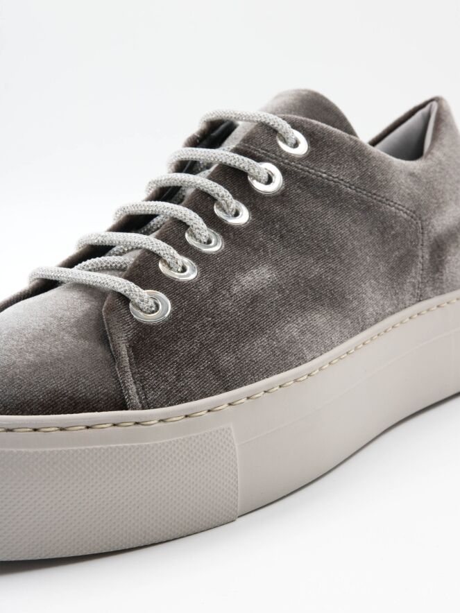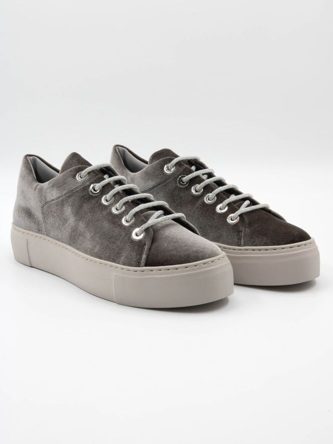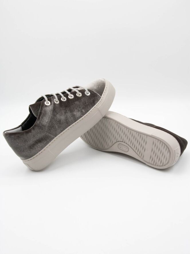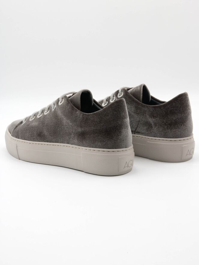 Un sneaker de luxe en velours de AGL en couleur taupe. Les lacets sont fabriqués dans un matériau brillant et les œillets sont en métal argenté. La semelle plateforme est de couleur gris clair. L'intérieur est doublé de cuir.