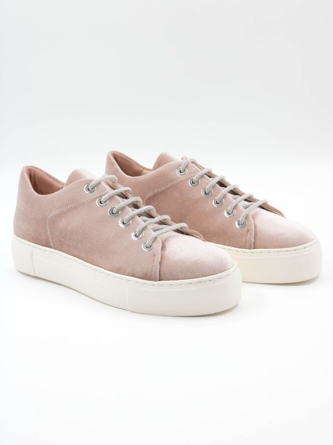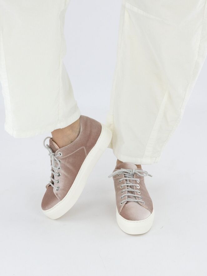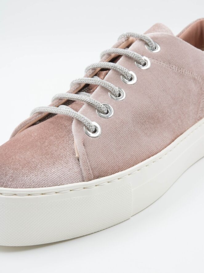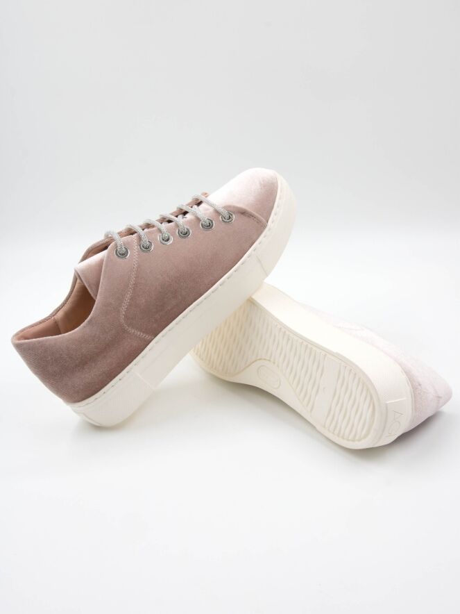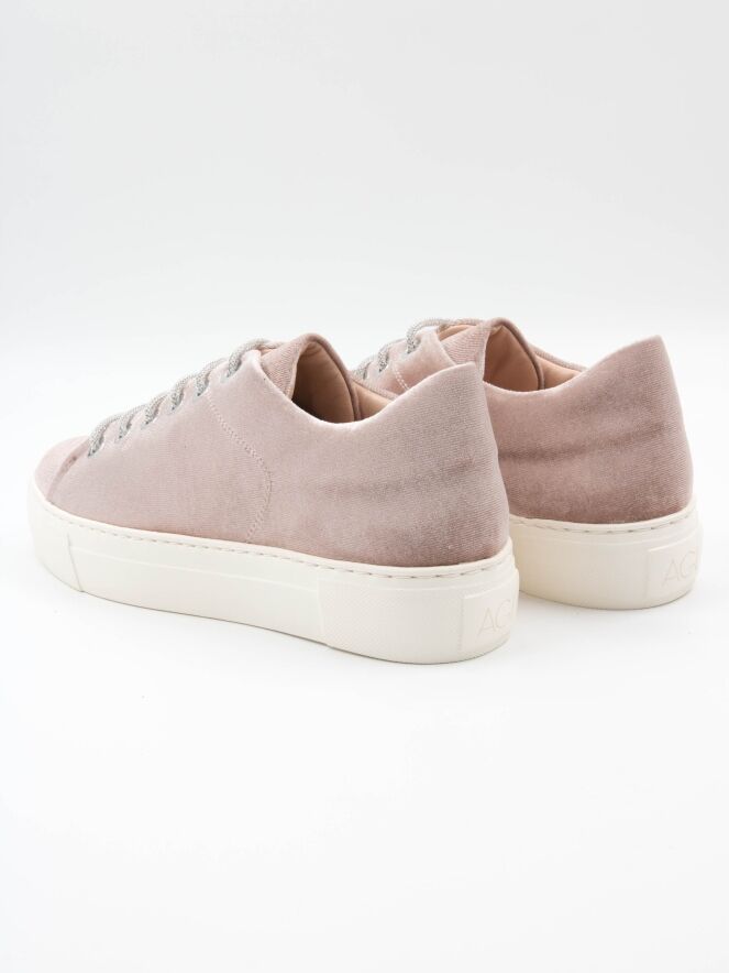 Une sneaker de luxe en velours de AGL en rose. Les lacets sont faits d'un matériel brillant et les œillets sont en métal argenté. La semelle plateforme est de couleur gris clair. L'intérieur est doublé de cuir.