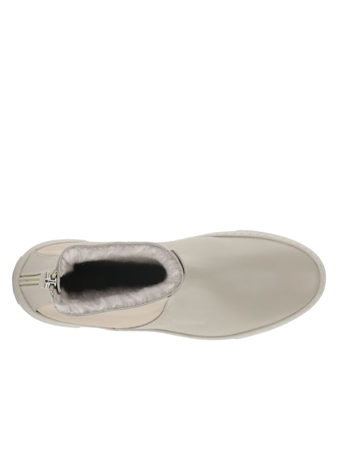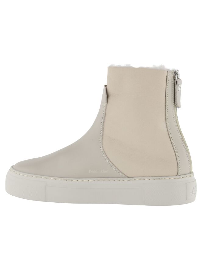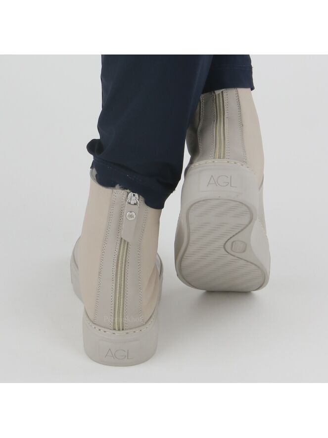Bottines courtes de la marque AGL, en cuir de mouton souple de couleur beige. Le zip de fermeture est situé à l'arrère du talon. Intérieur doublé de fourrure synthétique.