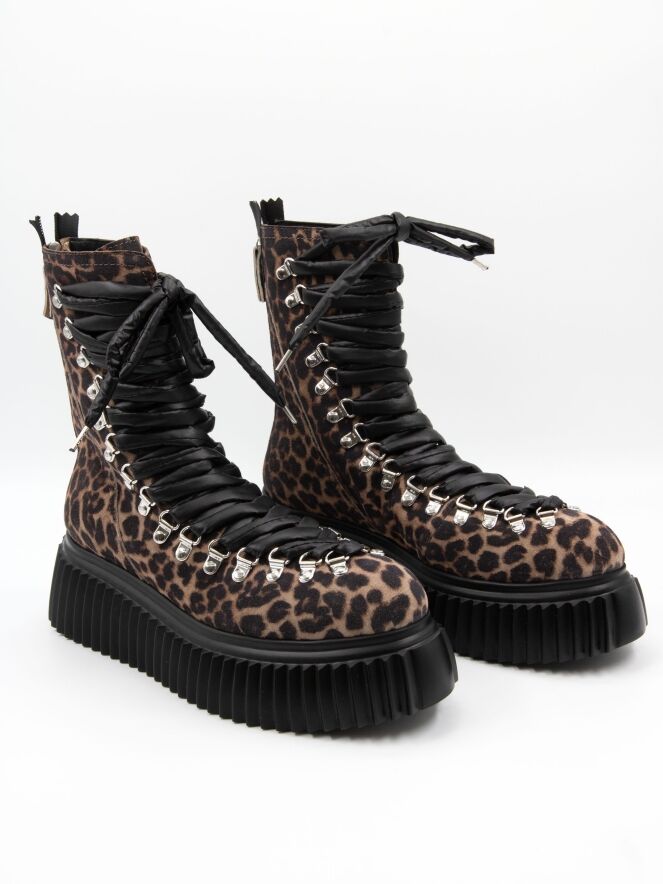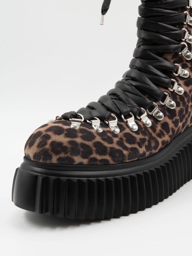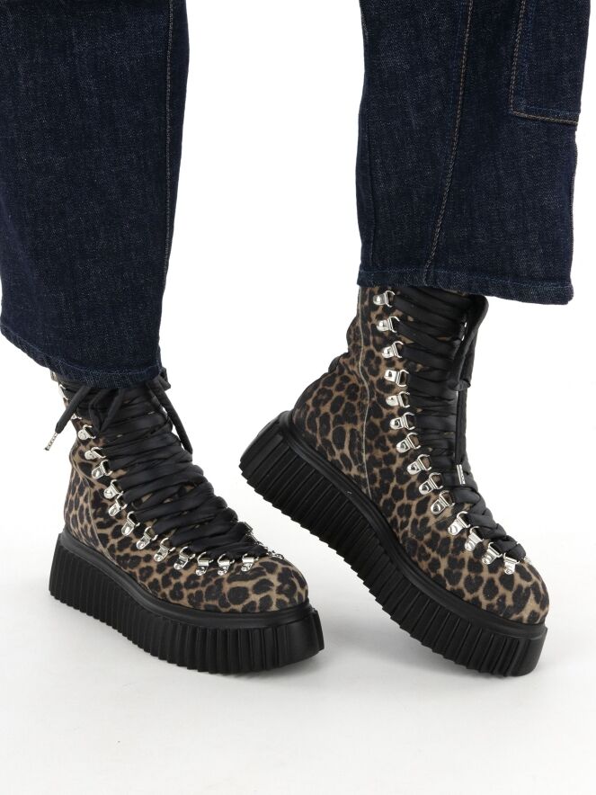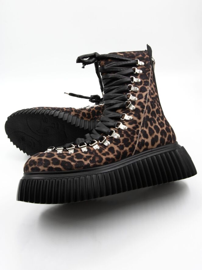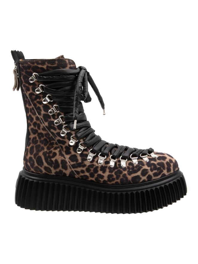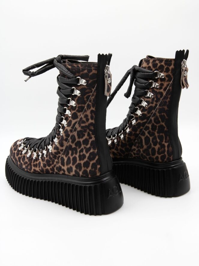 Bottine de AGL à imprimé léopard dans différentes nuances de brun et de noir. Le lacet en tissu parachute passe à travers des œillets métalliques argentés. La semelle design est fortement crantée. Une fermeture éclair se trouve au niveau du talon.