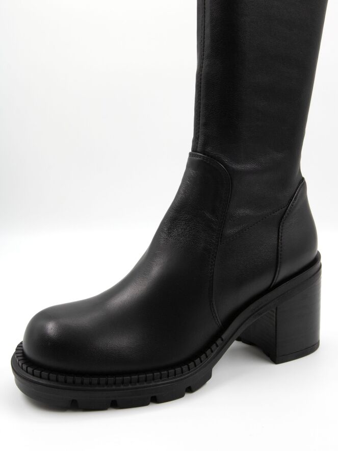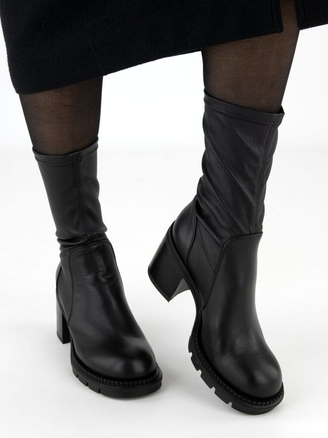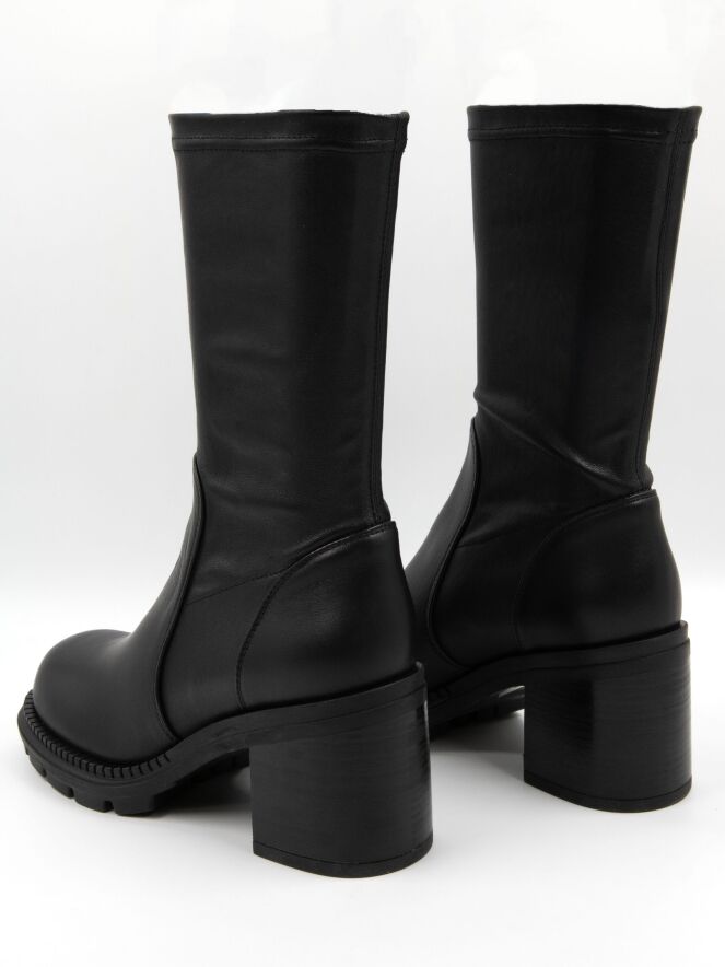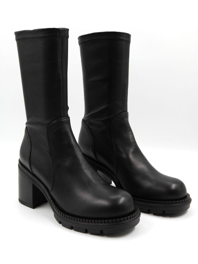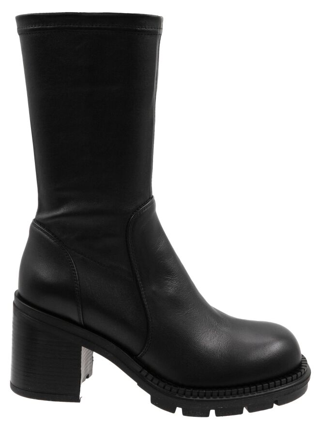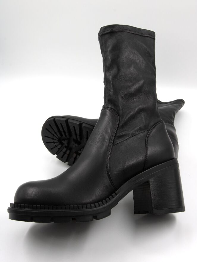 Bottine mi-haute de la marque AGL en noir. La tige est en matière similicuir extensible. La bottine est dotée d’un talon bloc et d’une semelle crantée.
