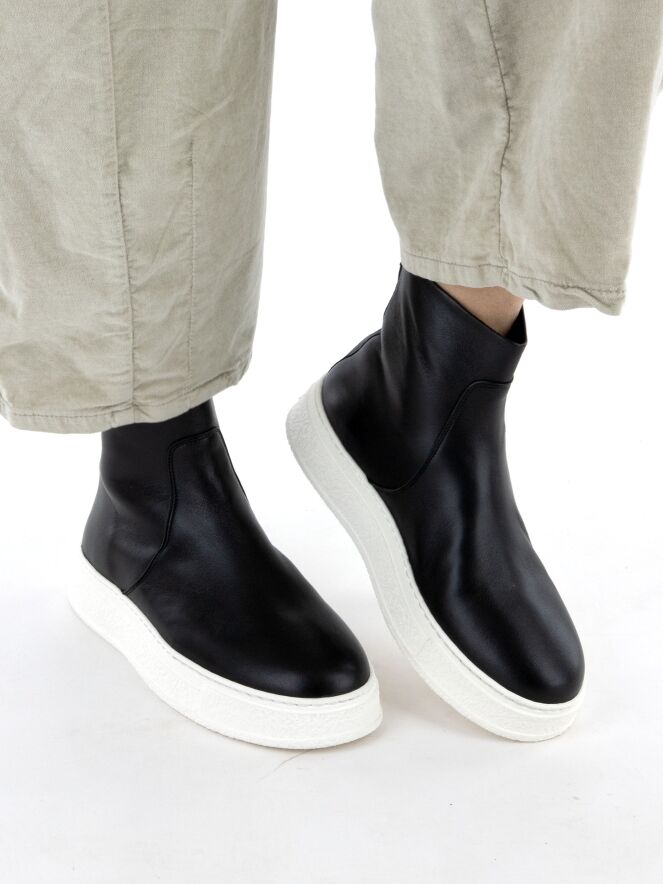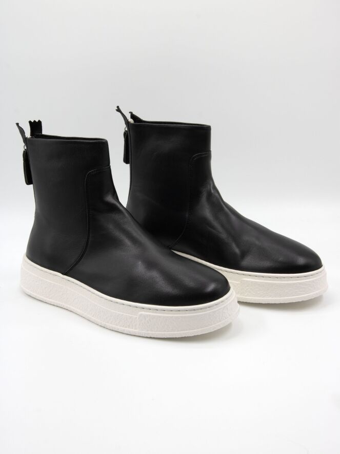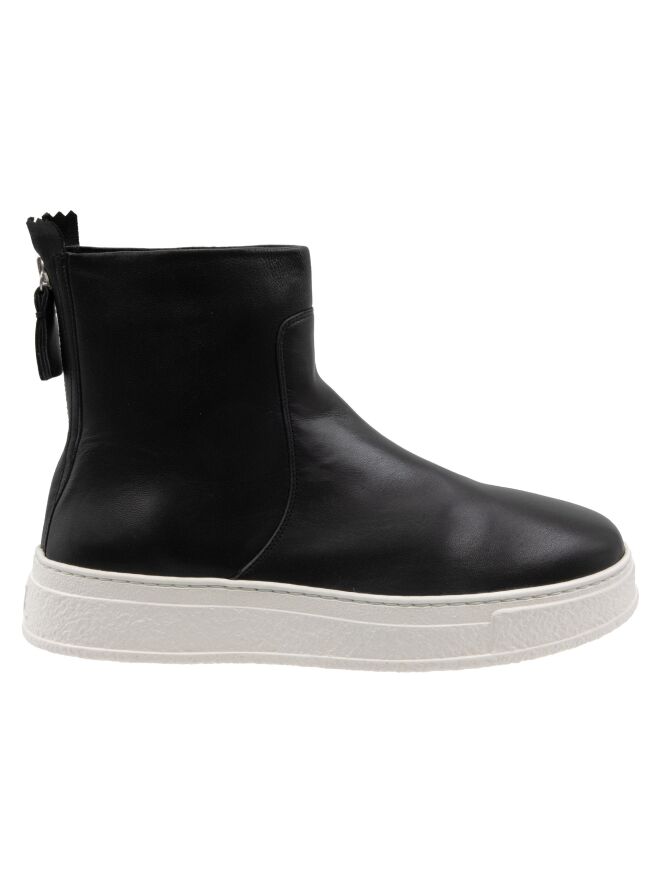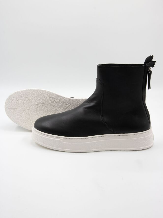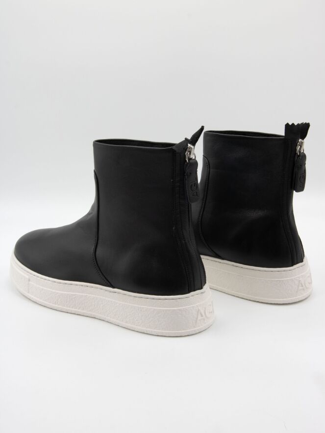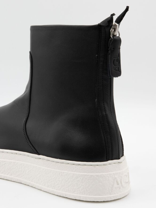 Bottine courte de AGL en noir. La semelle est de couleur blanc cassé. Une fermeture éclair se trouve au niveau du talon. L’intérieur de la tige est doublé de cuir et la semelle intérieure est recouverte de mouton.