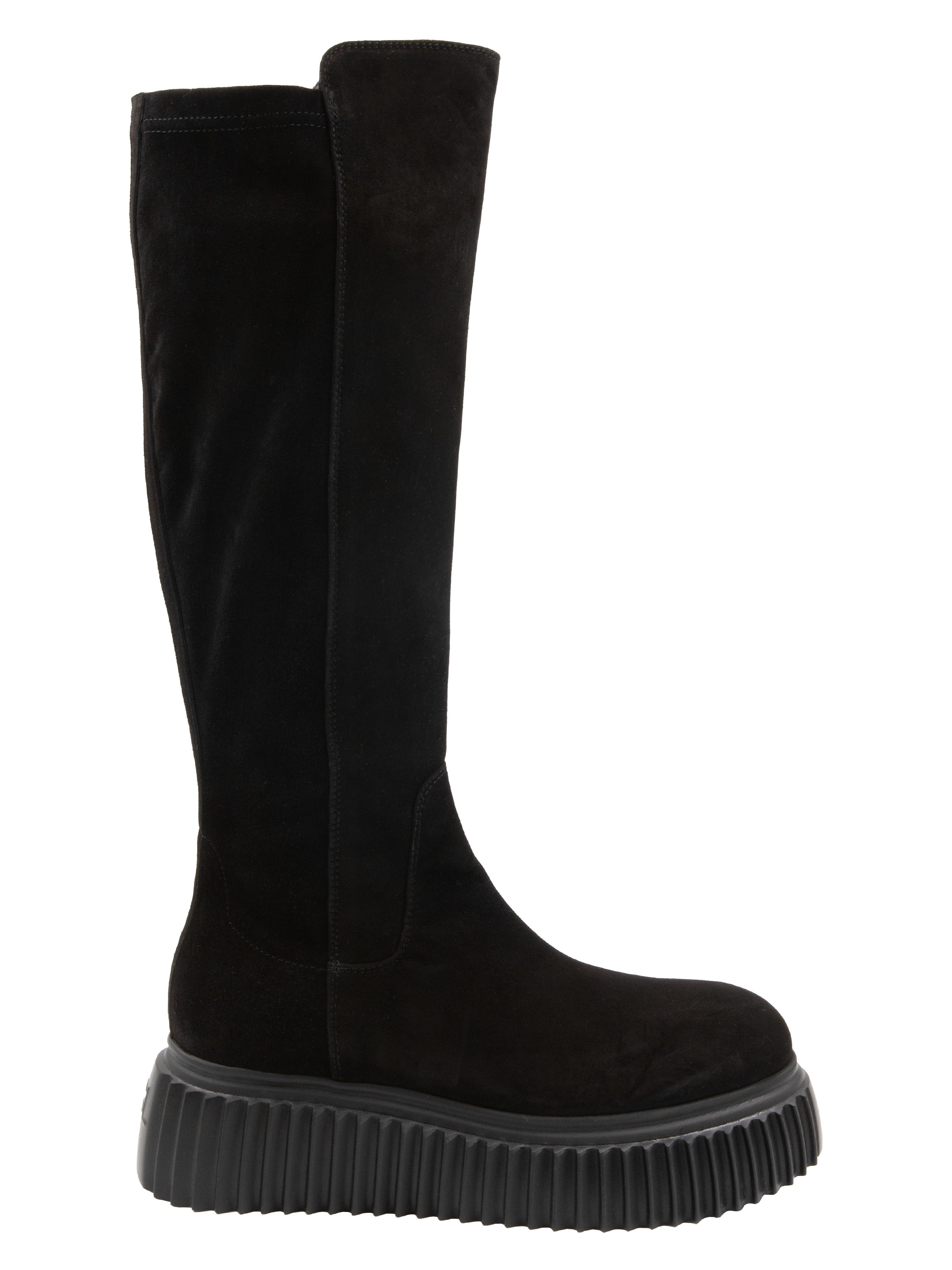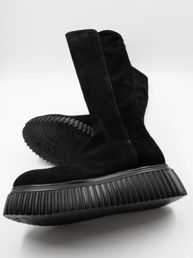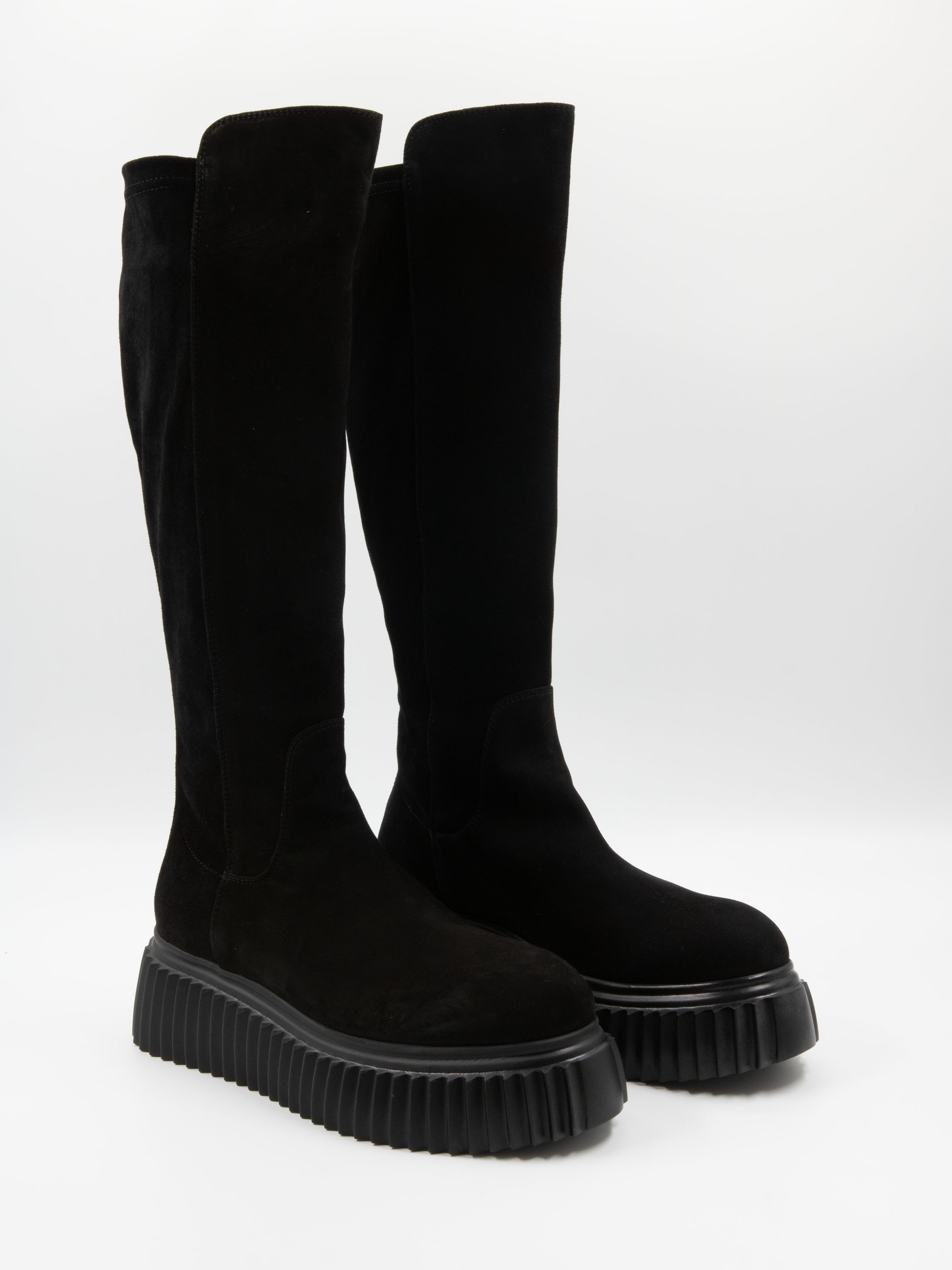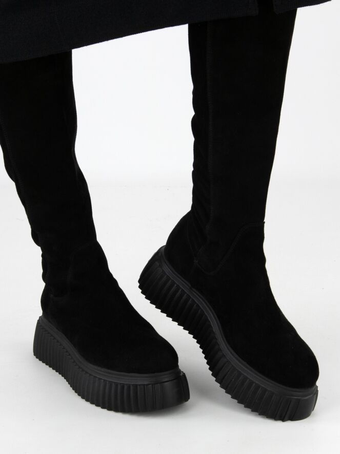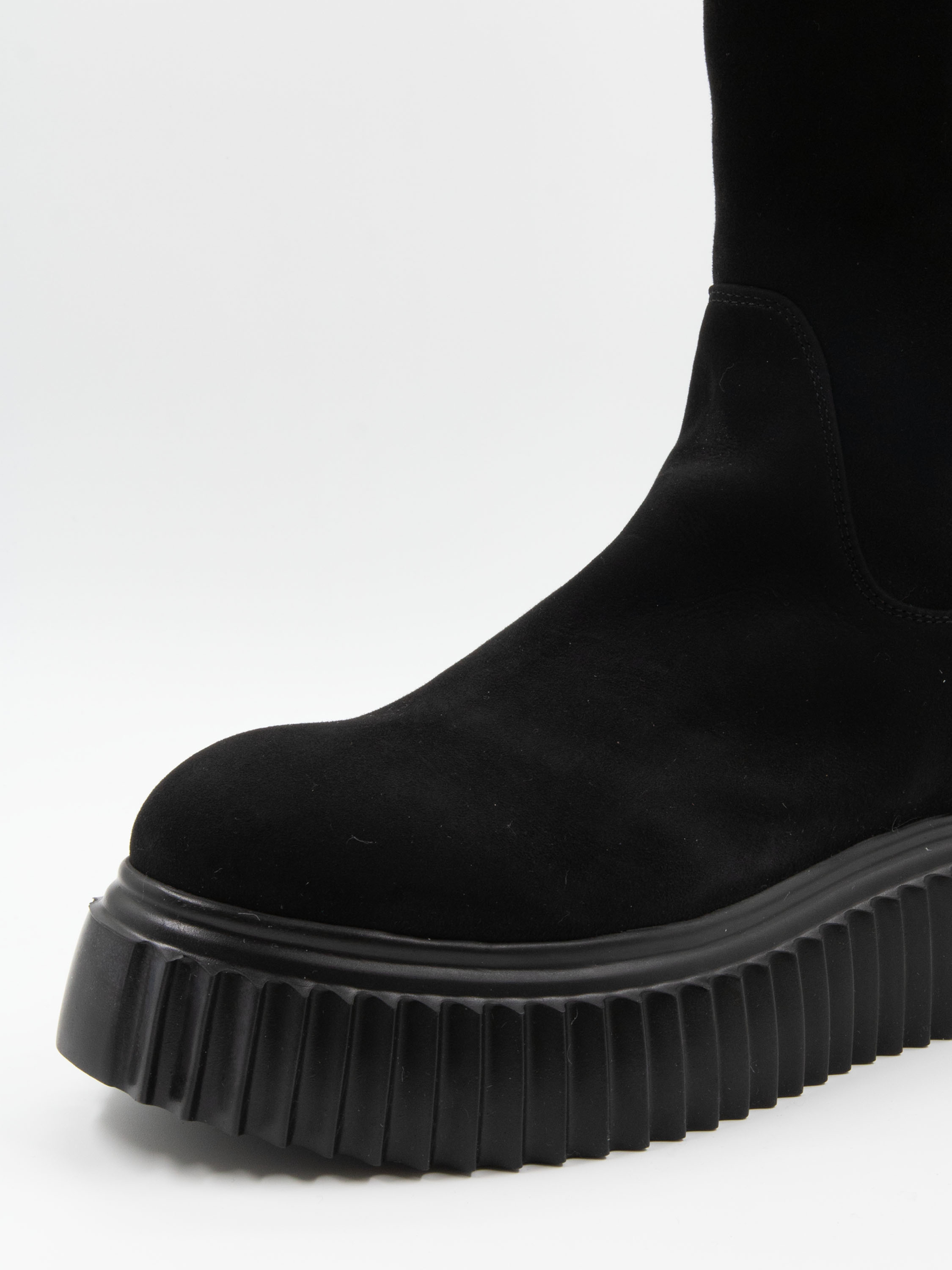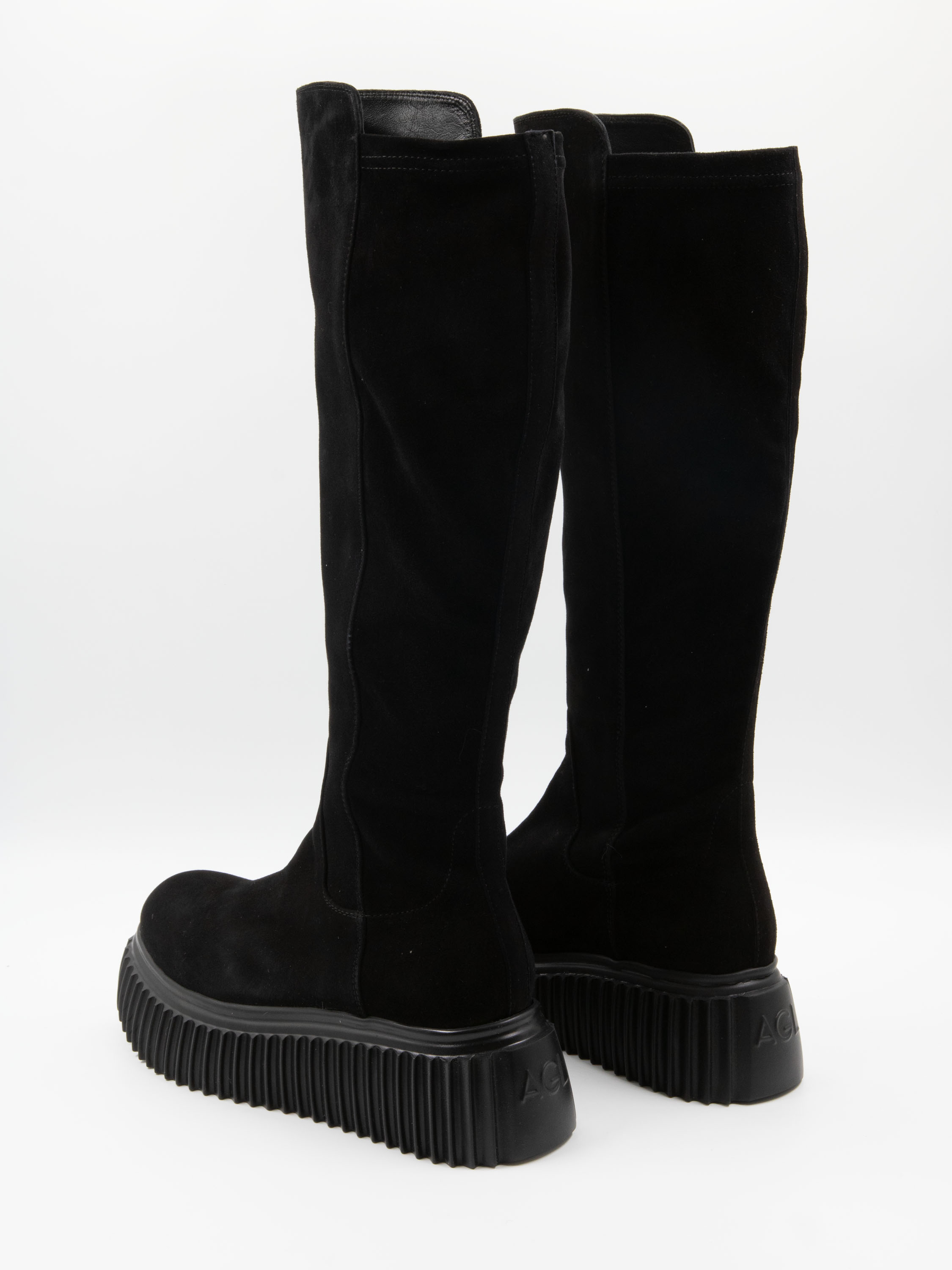 Botte haute AGL en noir. La semelle design présente un motif à rainures. L’avant de la tige et le pied sont en daim camoscio, tandis que l’arrière de la tige est en tissu extensible. L’intérieur est doublé de cuir.