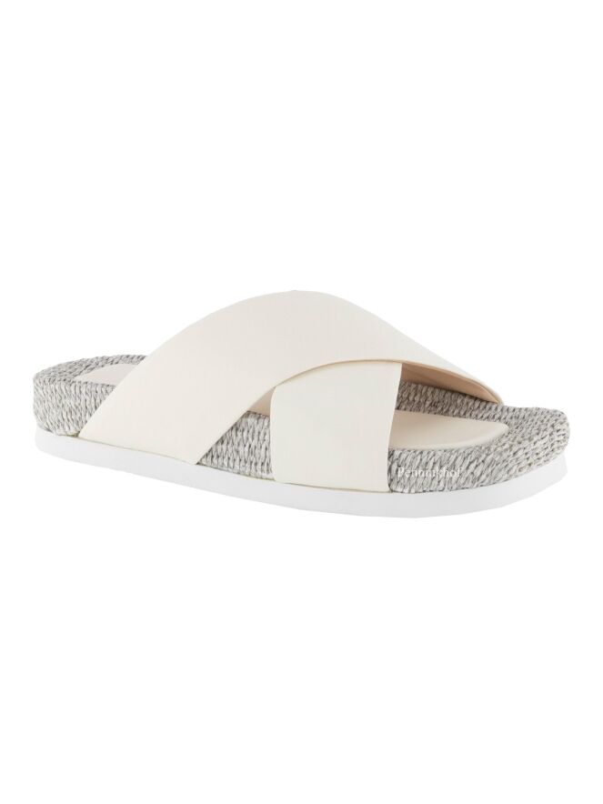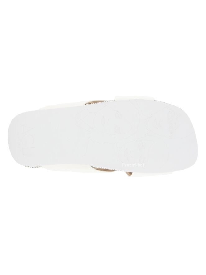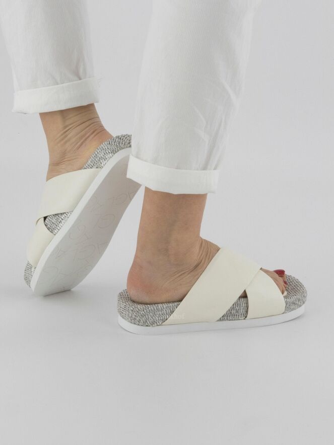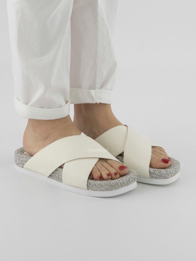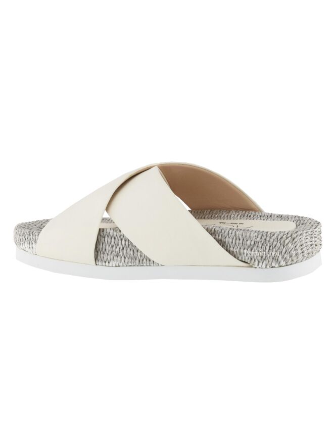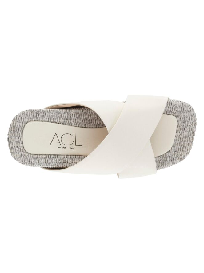 Sandale ouverte de la marque AGL, en cuir croisé de couleur blanc crème sur le dessus de pied. La partie centrale en cuir de la semelle intérieure est entourée d'un cannage tressé.