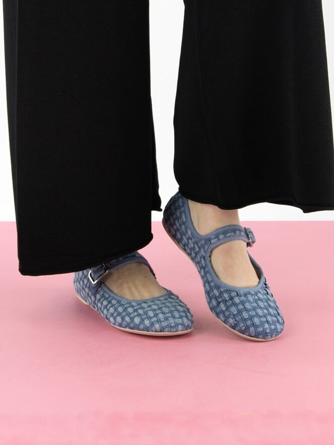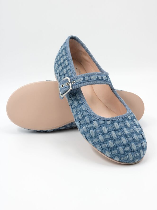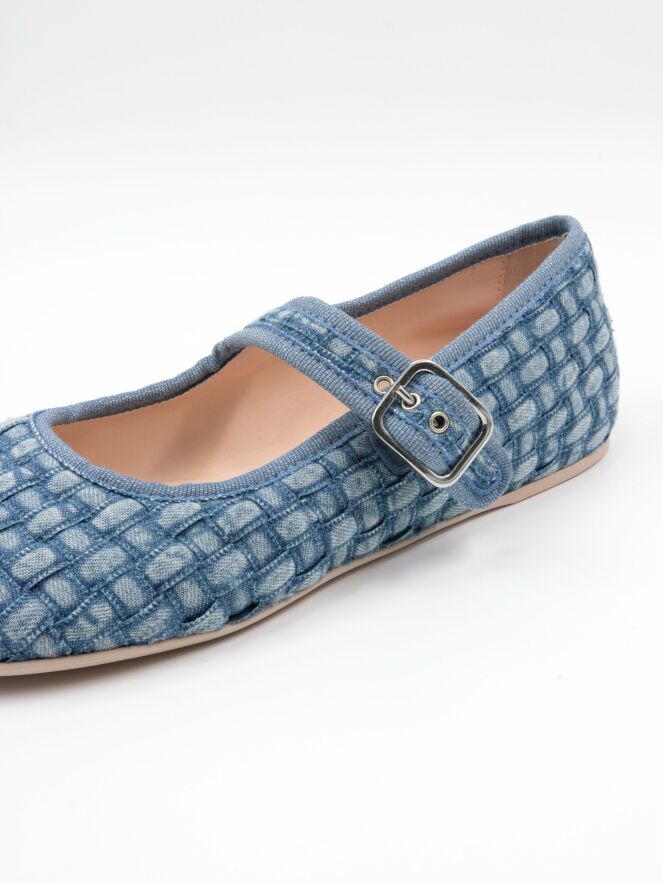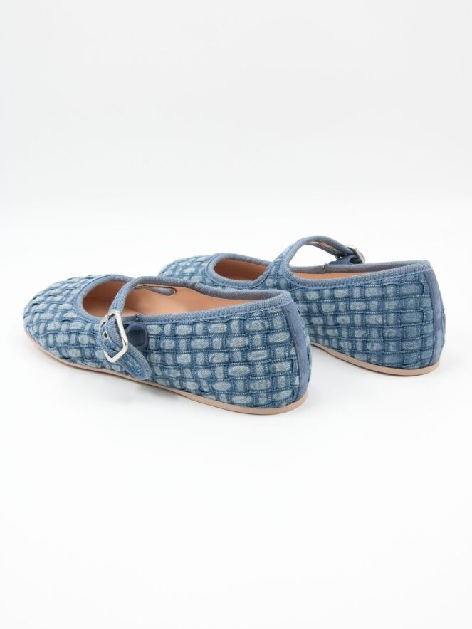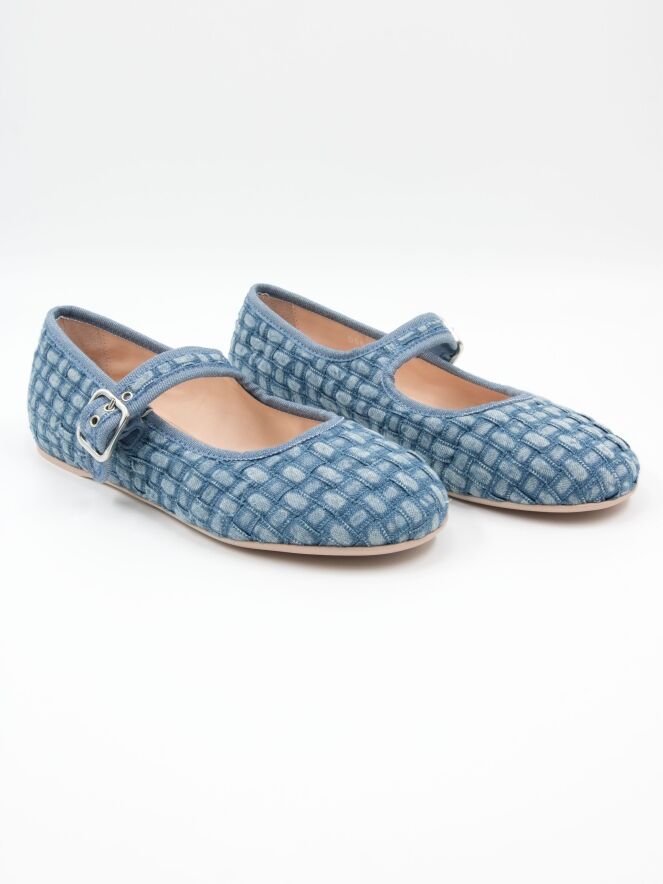 Une ballerine de AGL en tissu denim avec un motif à blocs. Une bride réglable avec une boucle argentée traverse l’avant du pied. L’intérieur est doublé de cuir.