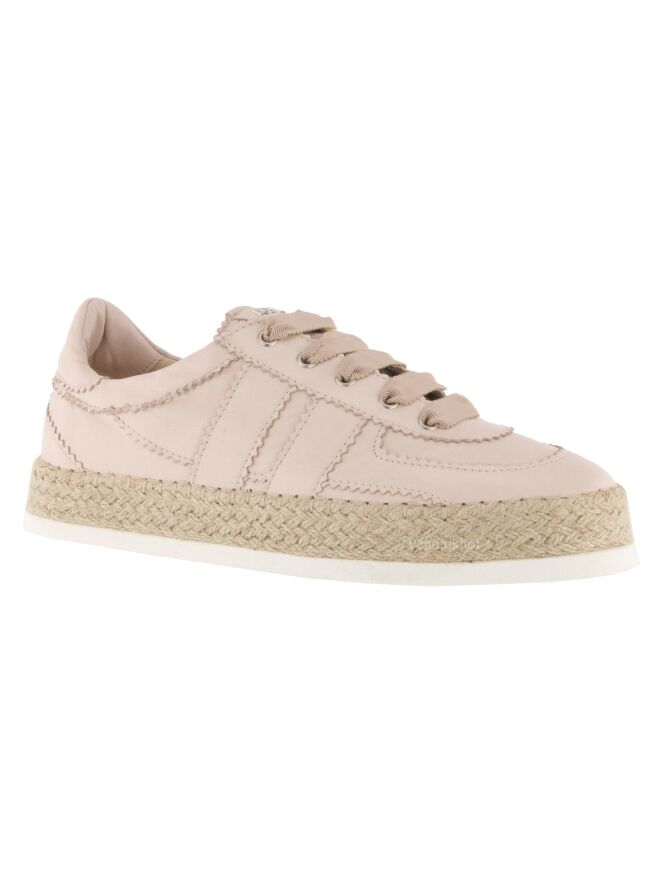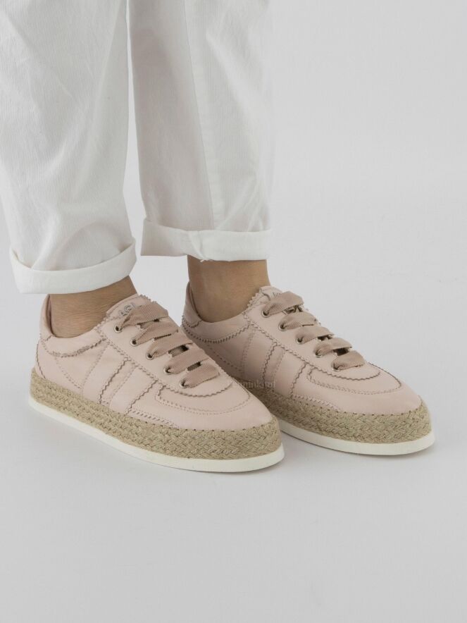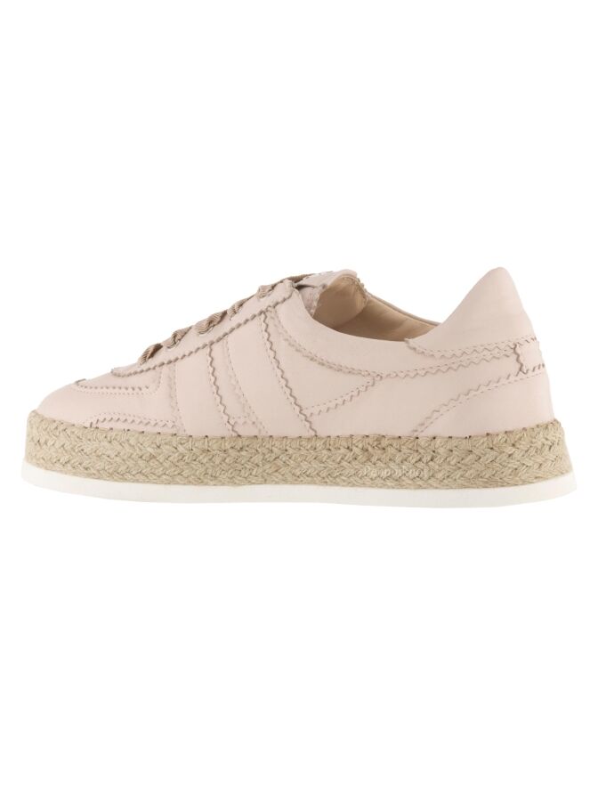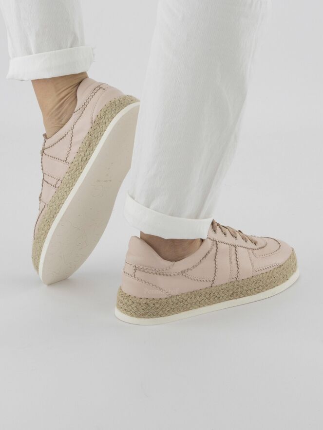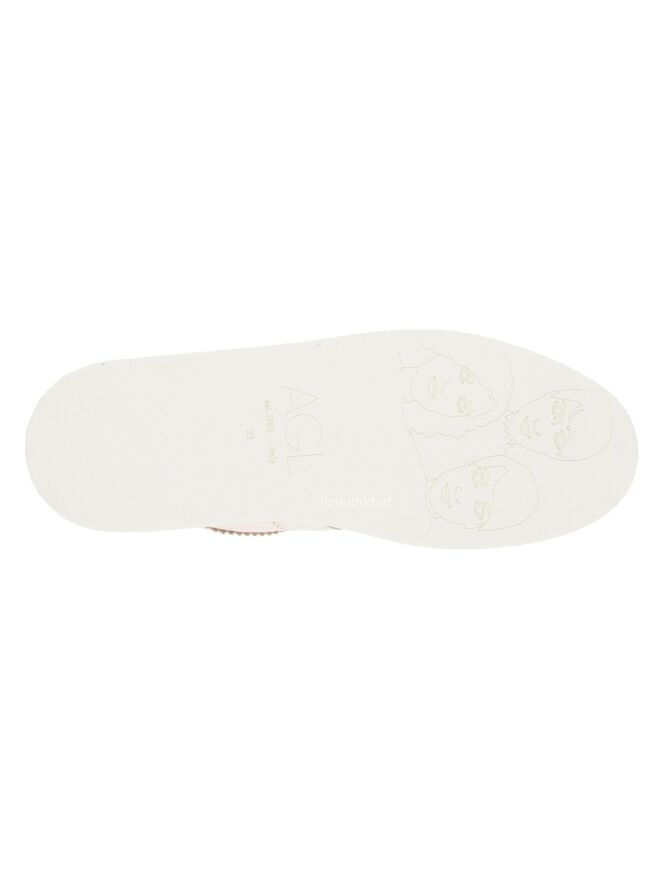 Luxueuse basket de la marque AGL, en cuir de couleur rose tendre. Les coutures sont très finement crantées. Une bordure décorative en corde surplombe la semelle blanc crème. La basket est ornée d'un lacet plat finement côtelé. L'intérieur est doublé de cuir.