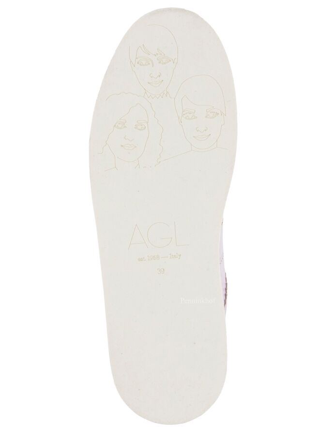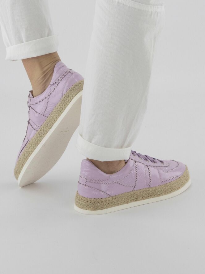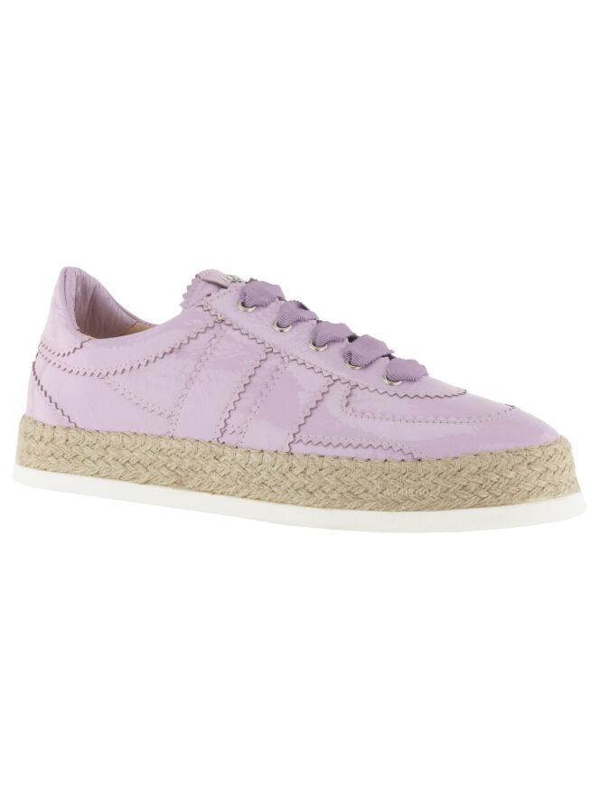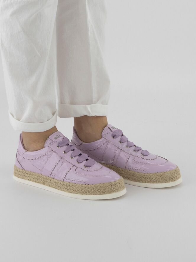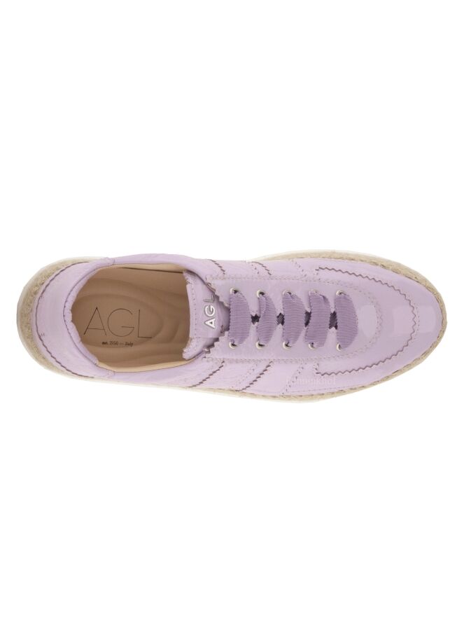 Luxueuse basket de la marque AGL, en cuir de couleur lilas. Les coutures sont très finement crantées. Une bordure décorative en corde surplombe la semelle blanc crème. La basket est ornée d'un lacet plat finement côtelé. L'intérieur est doublé de cuir.