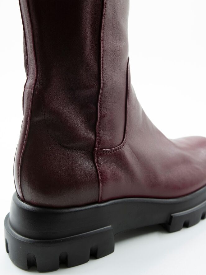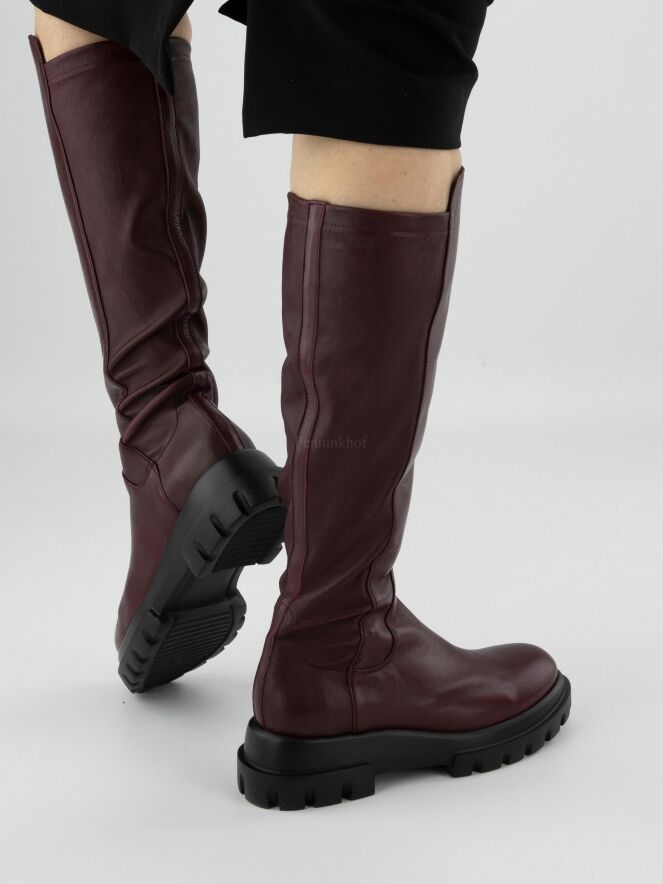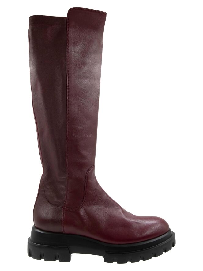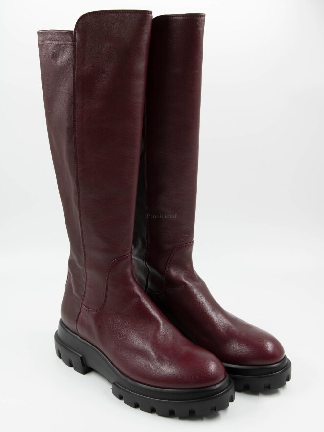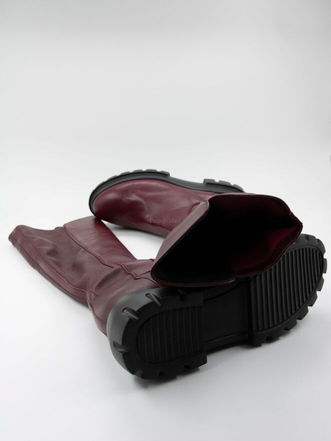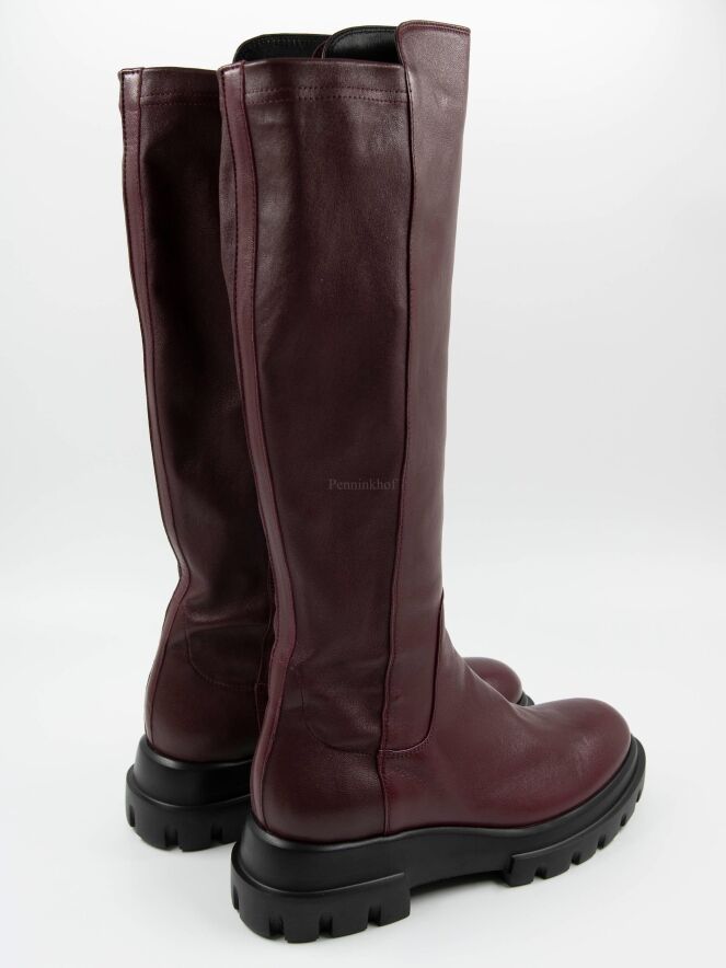 Une botte de AGL de couleur bordeaux. La botte a une semelle rugueuse. L'arrière de la tige est en tissu élastique noir. La semelle noire est crantée. L'intérieur de la tige est partiellement doublé de cuir.