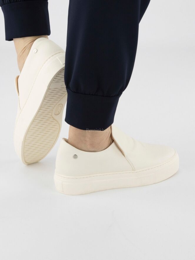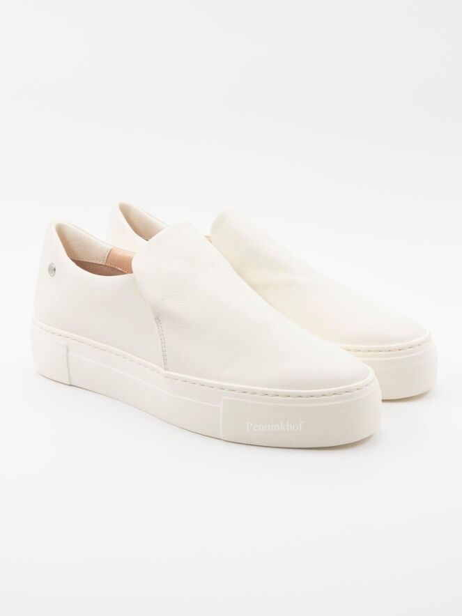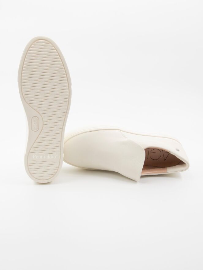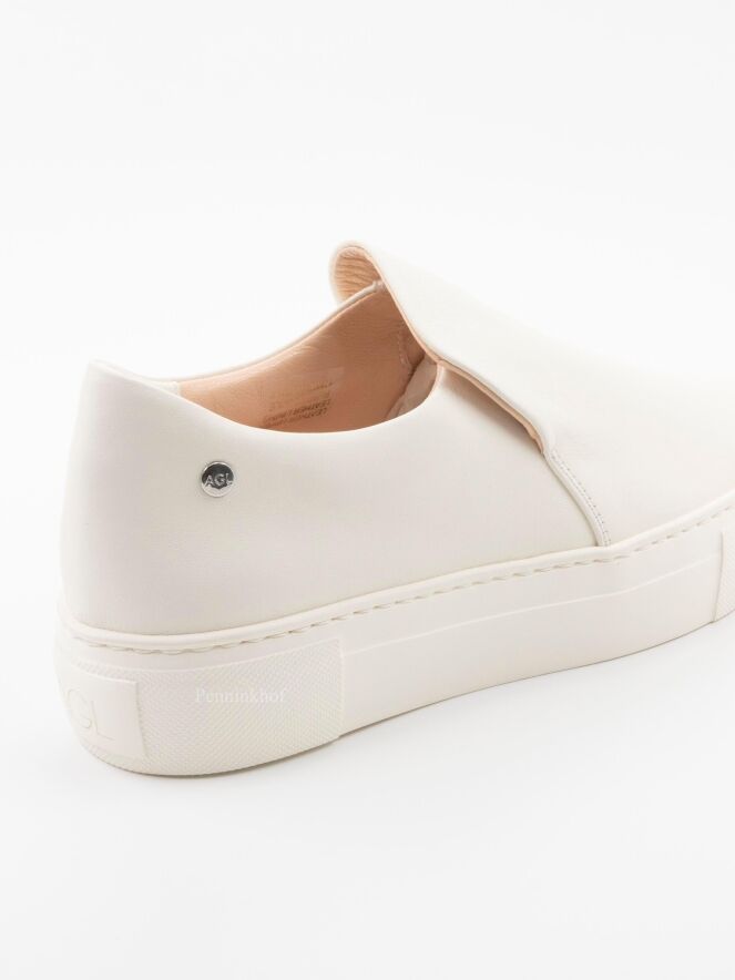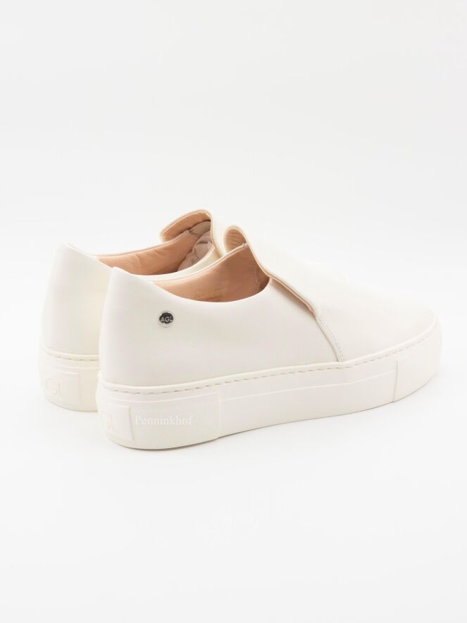 Ces luxueuses chaussures à enfiler d'AGL sont réalisées en cuir souple blanc crème. Le nez de la chaussure est rond. Le chausson est doté d'une semelle compensée de la même couleur que le cuir et l'intérieur est doublé.
