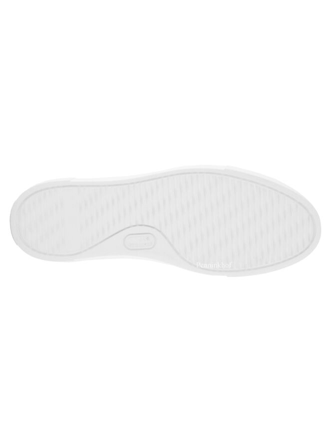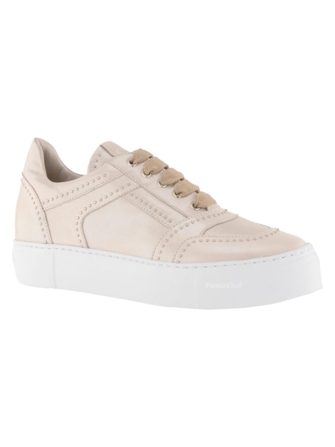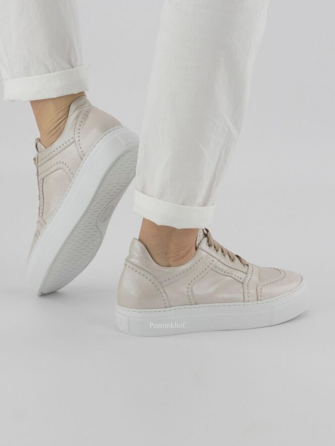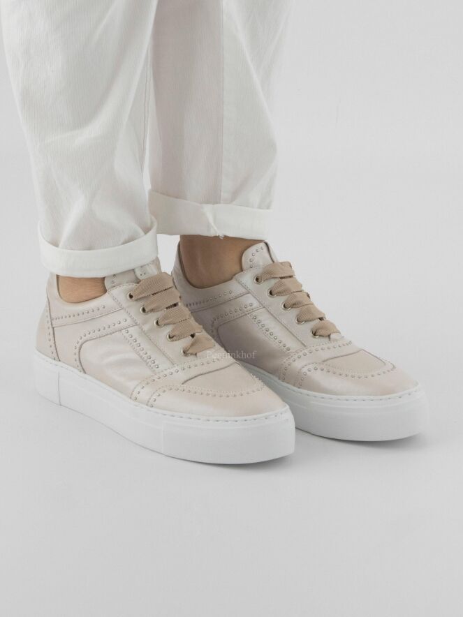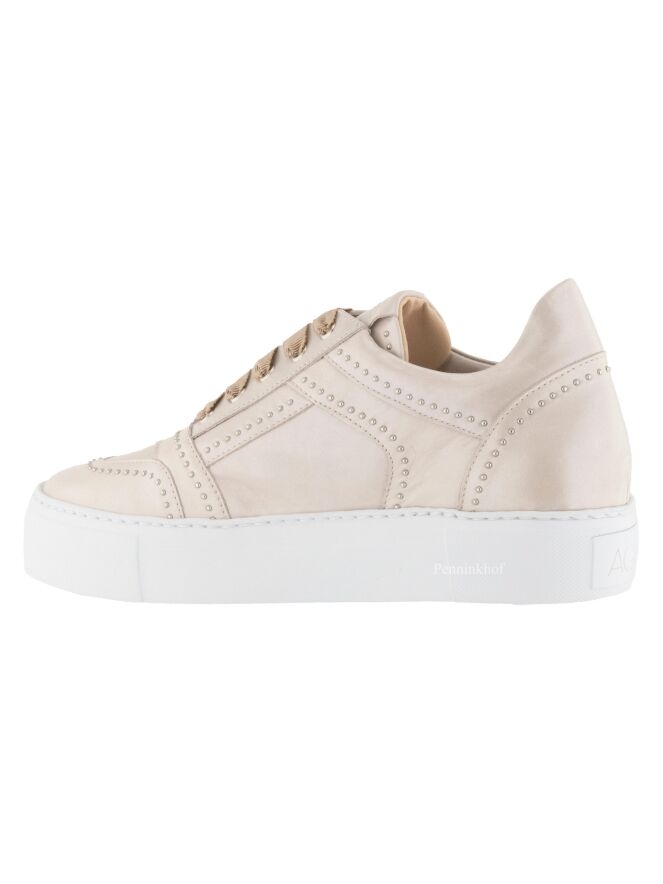 Sneaker de la marque AGL, en cuir de couleur nacrée. Des petits clous décoratifs argentés bordent les coutures. Les lacets décoratifs beiges sont finement côtelés. L'intérieur est doublé de cuir.