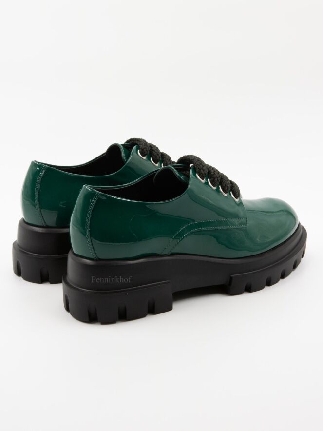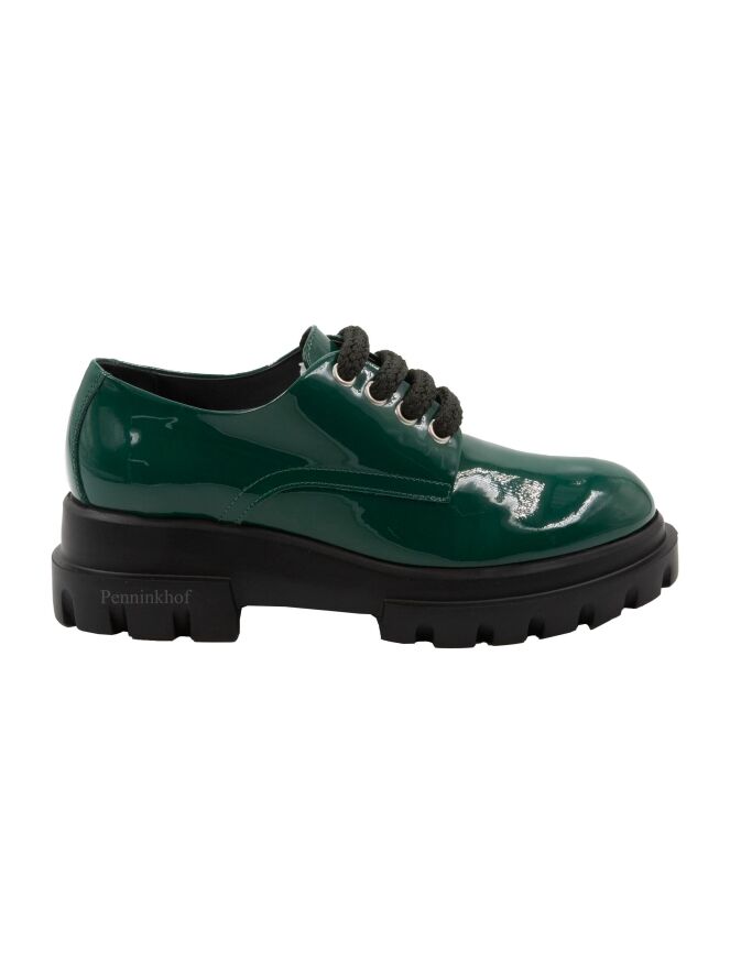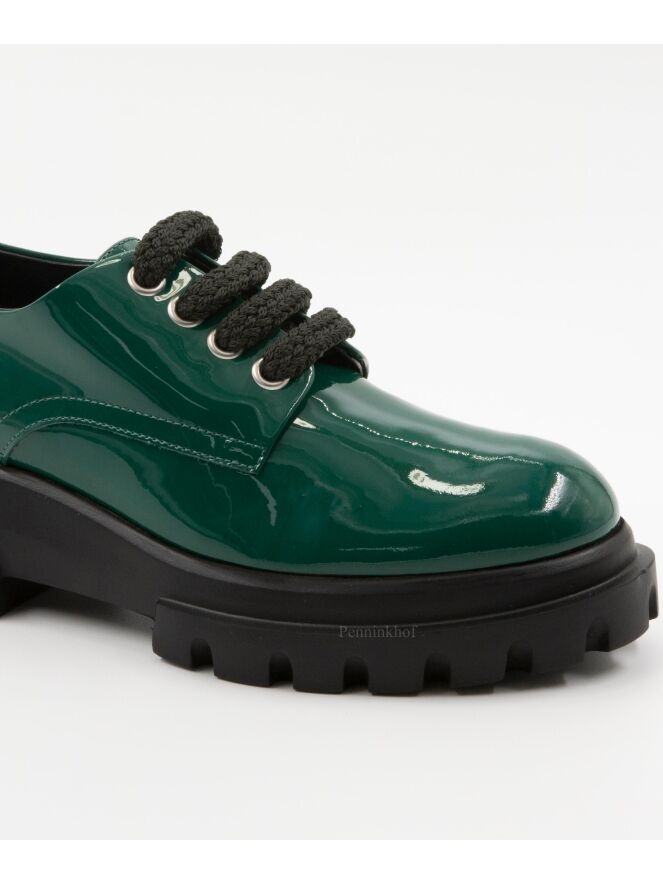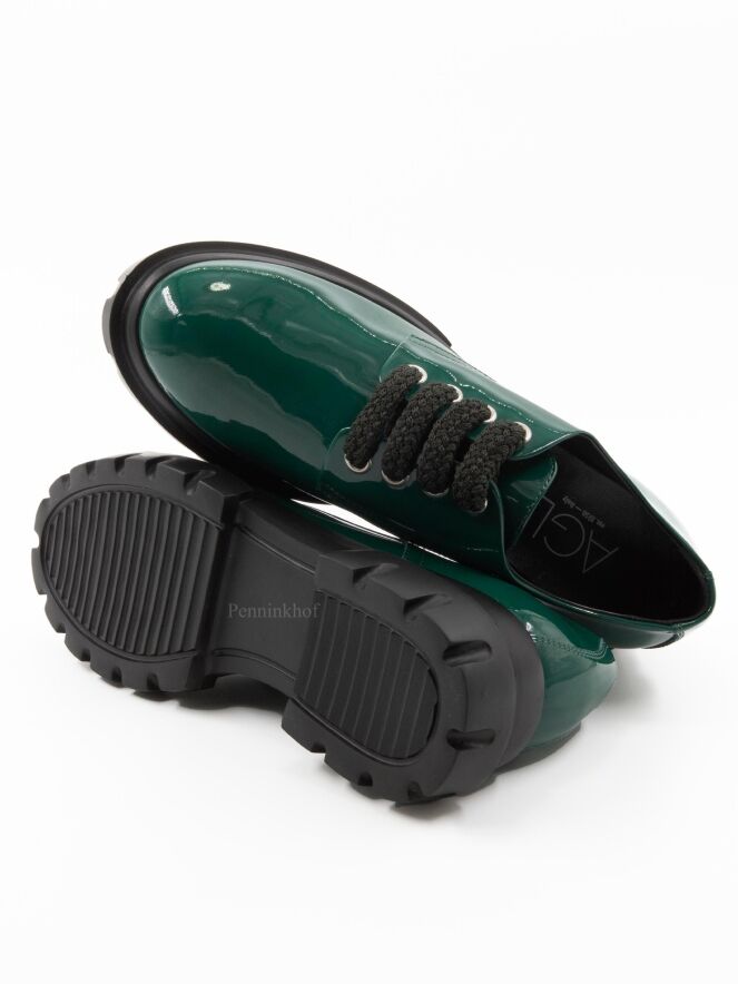 Un escarpin de AGL en cuir verni de couleur verte. La semelle de créateur est de couleur noire. L'intérieur est doublé de cuir.