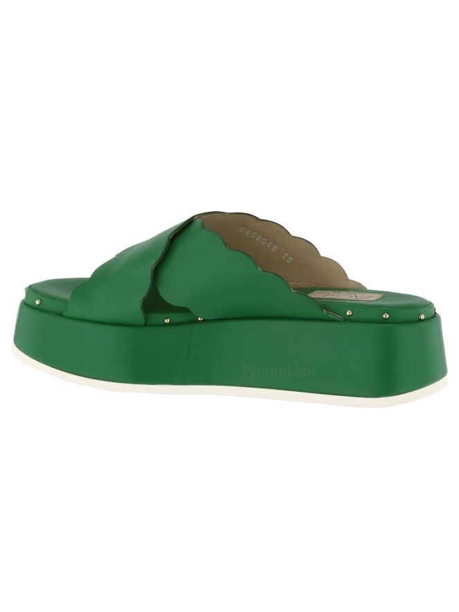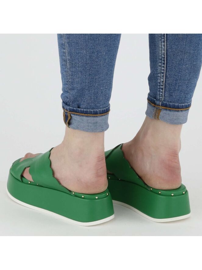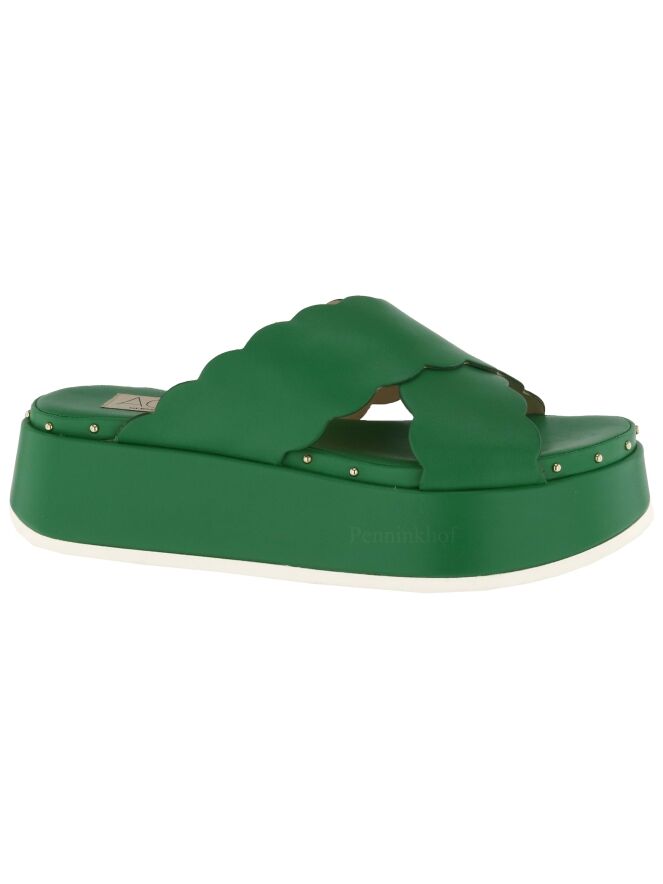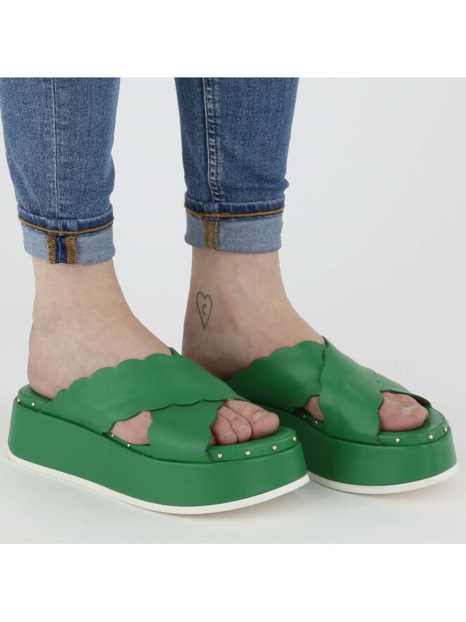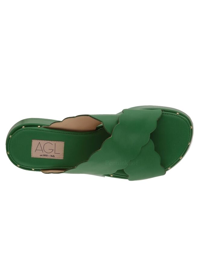 Sandale à semelle compensée de la marque AGL, de couleur verte. La sandale possède deux lanières en cuir croisées à bords festonnés. Le bord de la semelle est orné de petits clous sphériques de couleur laiton.