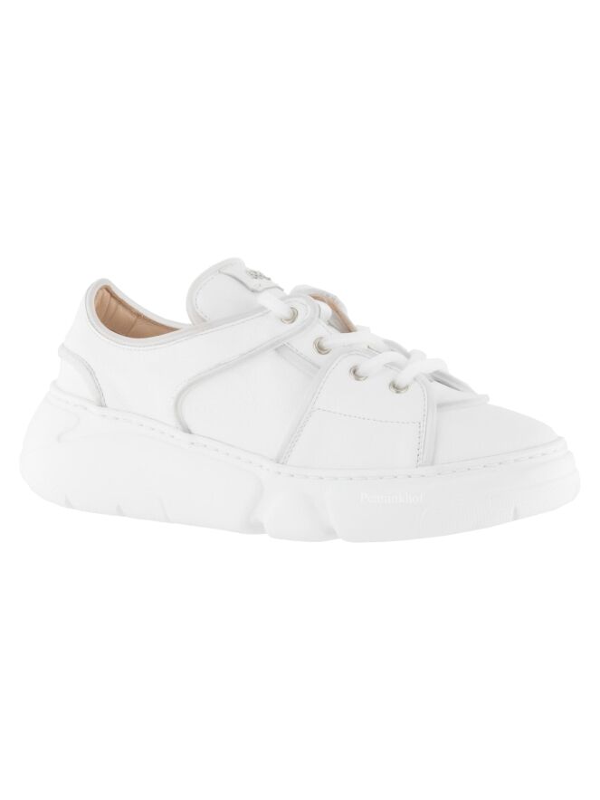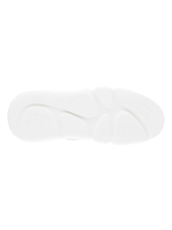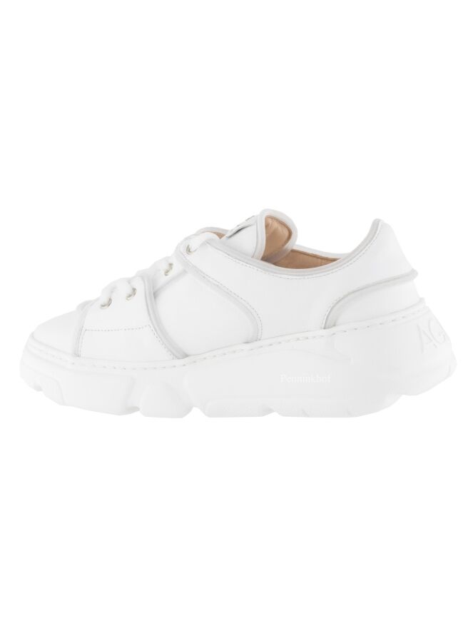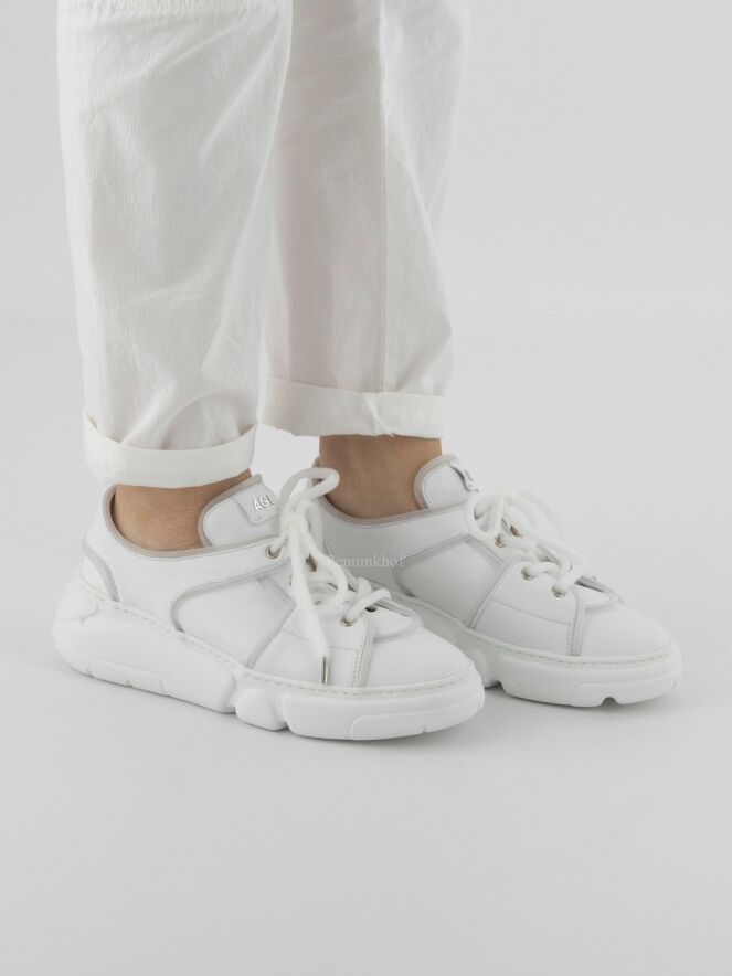 Sneaker de la marque AGL, en cuir de couleur blanche. Un passepoil en plastique mat borde les coutures. Les lacets sont enveloppés dans une maille transparente. L'intérieur est doublé de cuir.