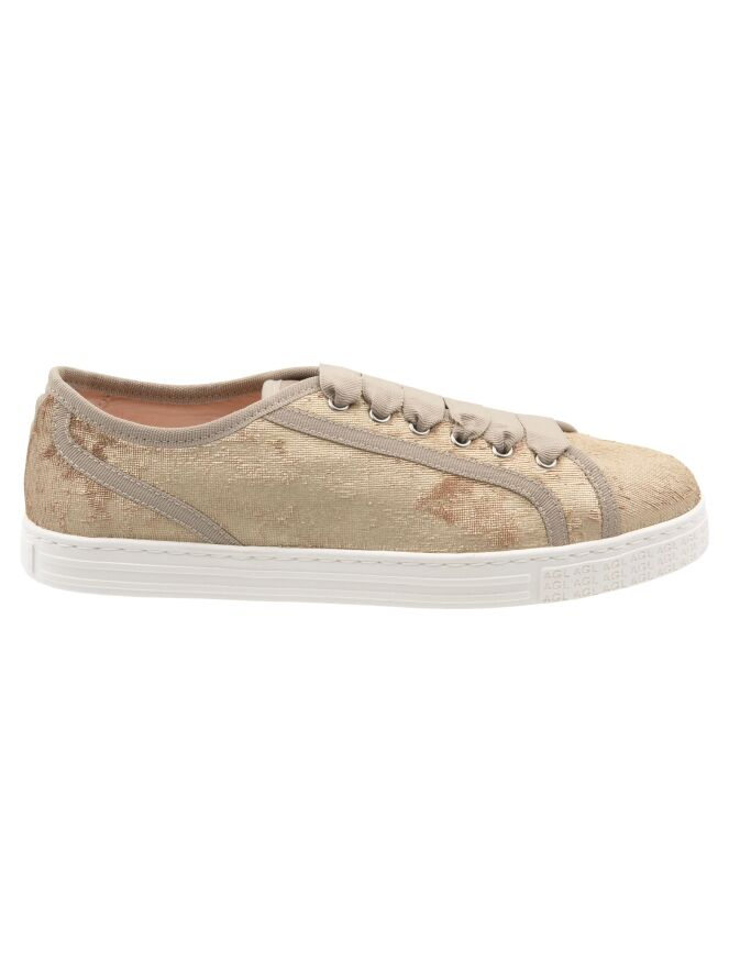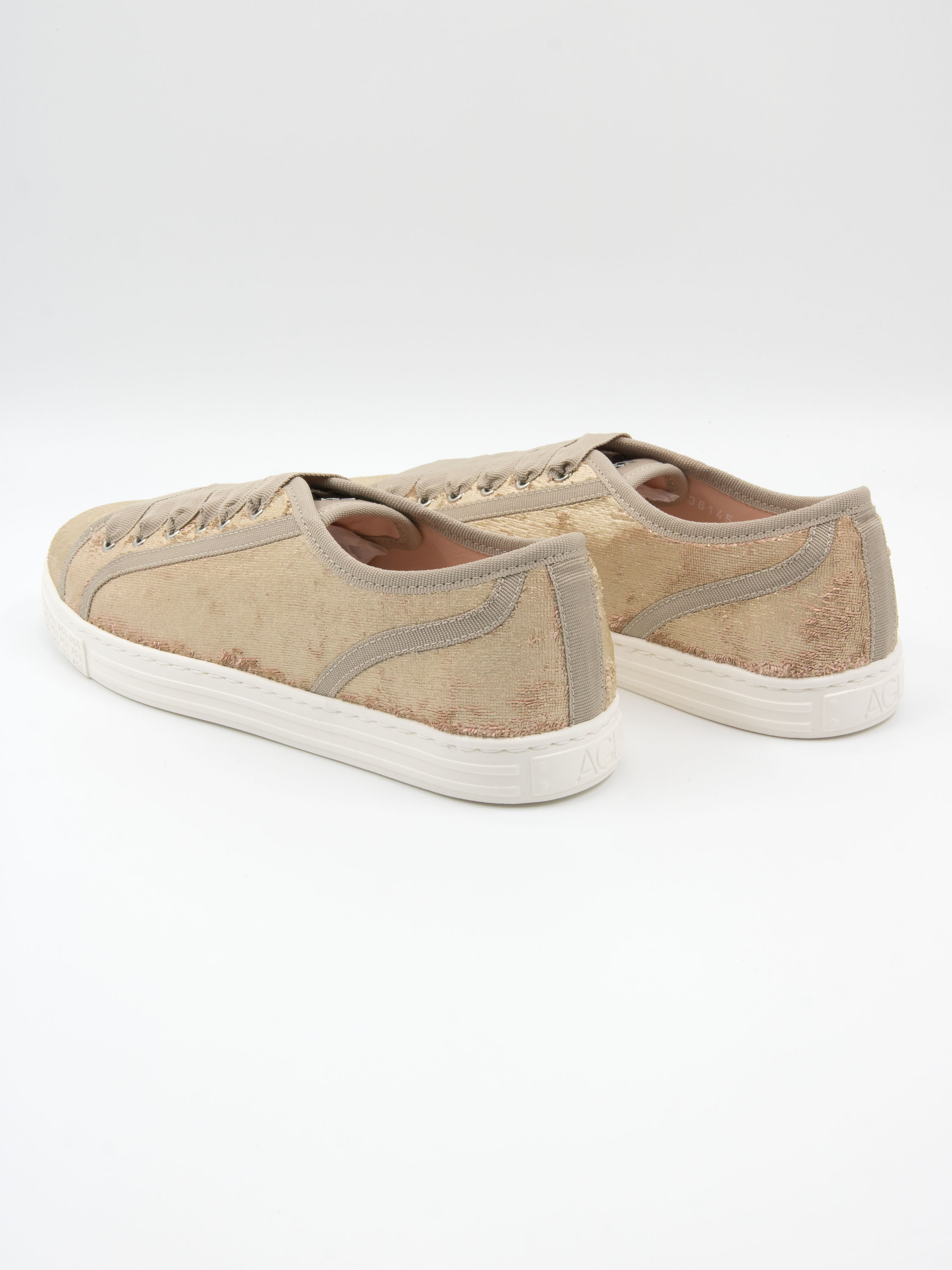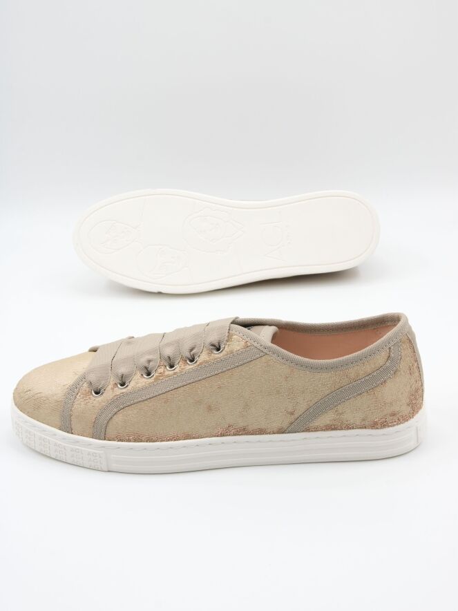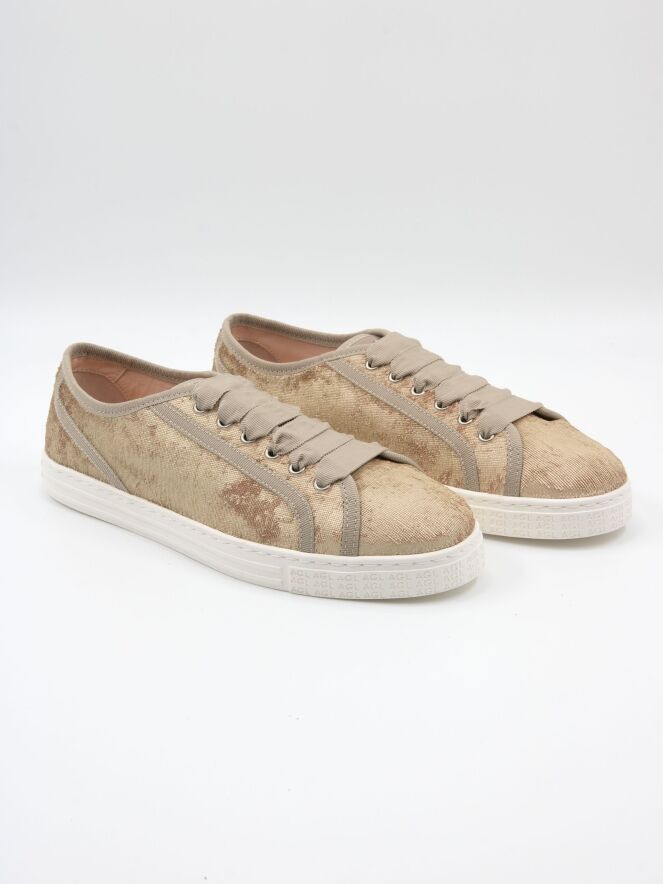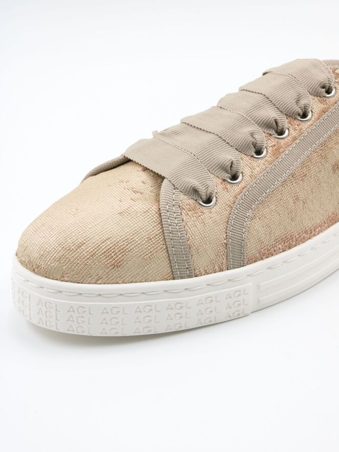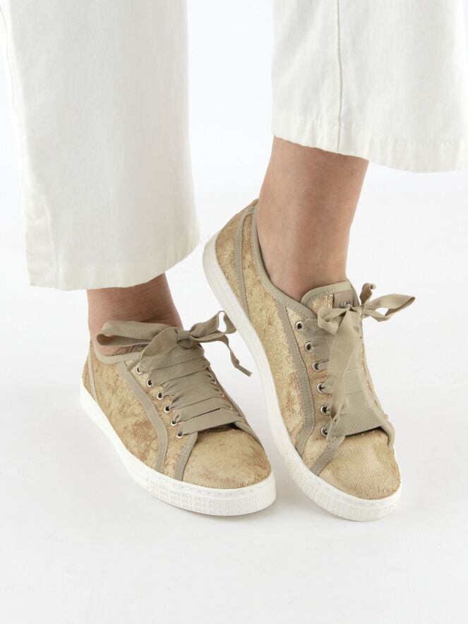 Une sneaker basse de AGL en velours doré. La sneaker est ornée de liserés beiges et dotée d’une semelle blanc cassé. L’intérieur est doublé de cuir.
