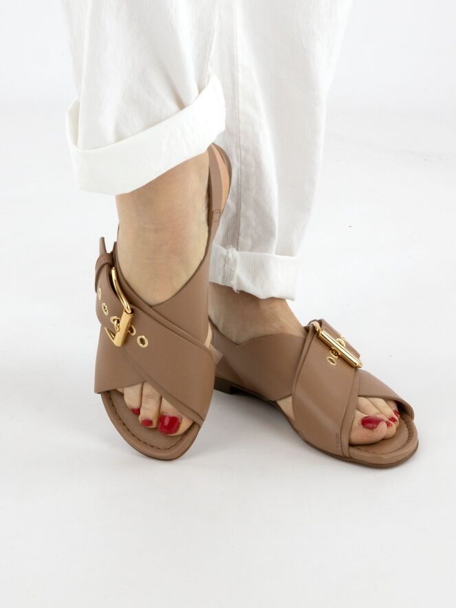 Sandale de AGL (Attilio Giusti Leombruni) dans une chaleureuse teinte brun clair. Le modèle présente des brides croisées, dont la supérieure est sublimée par une grande boucle décorative dorée apportant une touche raffinée. La bride arrière réglable assure un ajustement parfait, tandis que l’intérieur est entièrement doublé de cuir pour un confort et un luxe accrus.