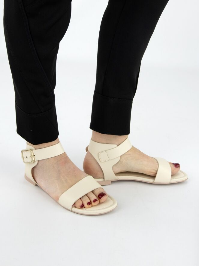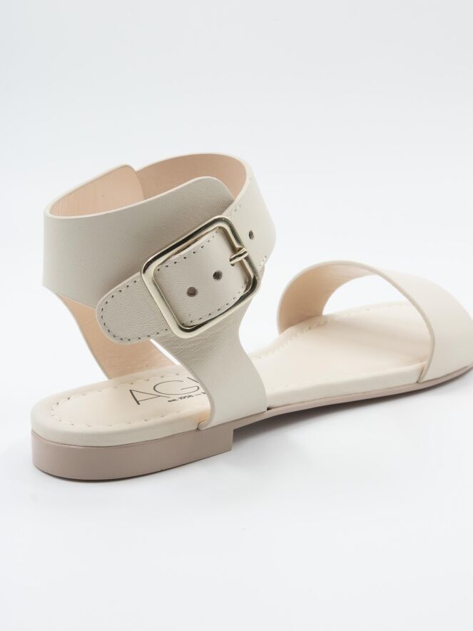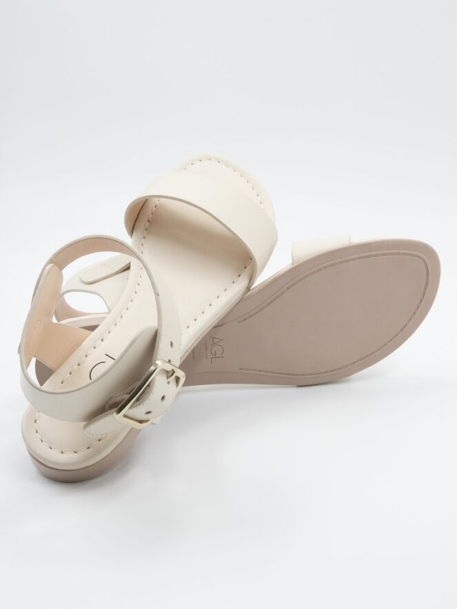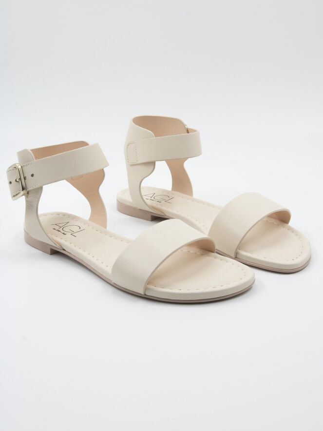 Une sandale d'AGL en couleur blanc crème. Il y a une bande étroite sur l'avant-pied. La sandale a un talon ouvert et la bride du talon est réglable. Le cuir est doublé à l'intérieur.