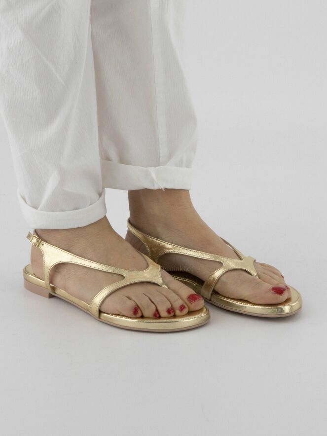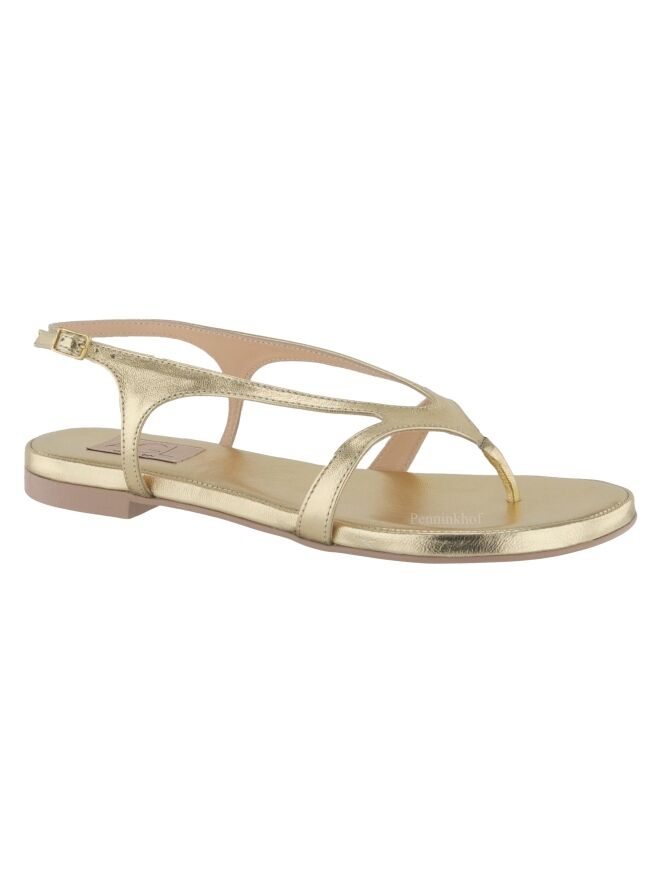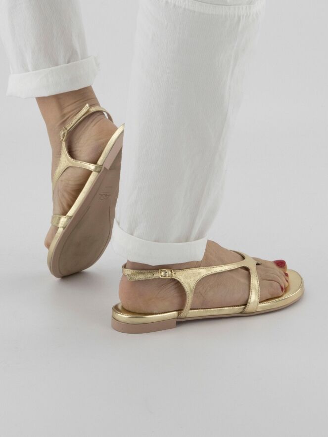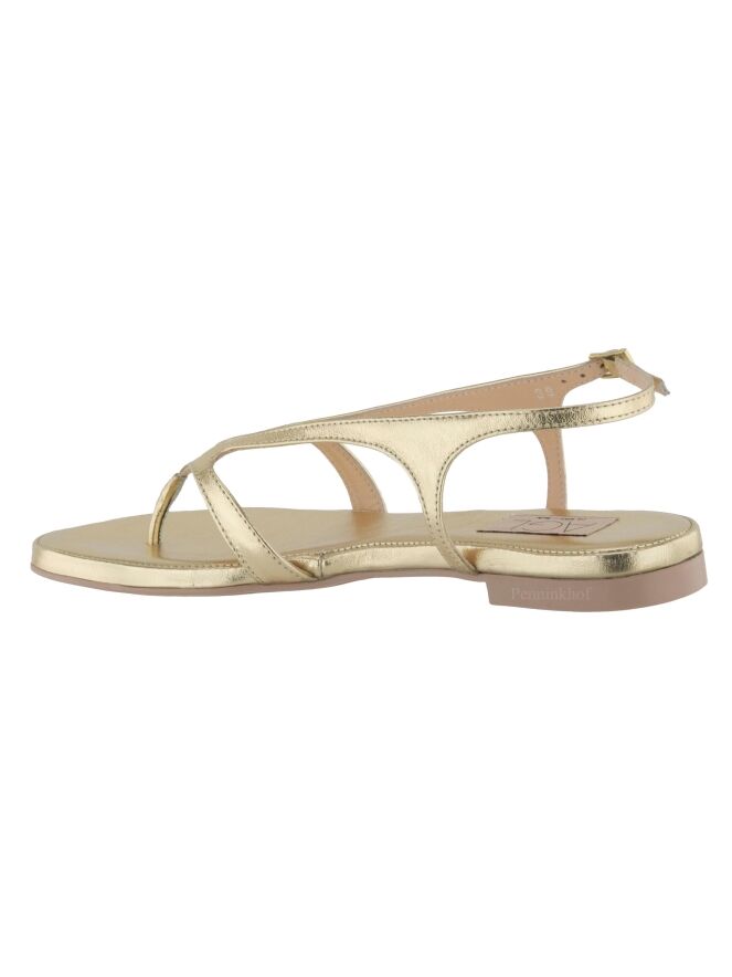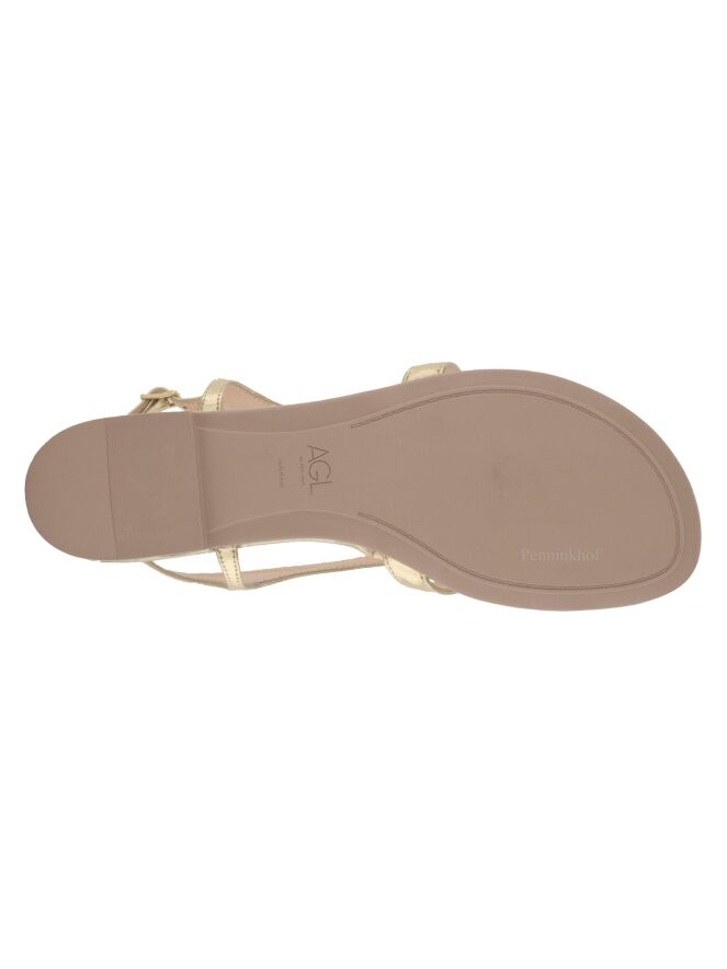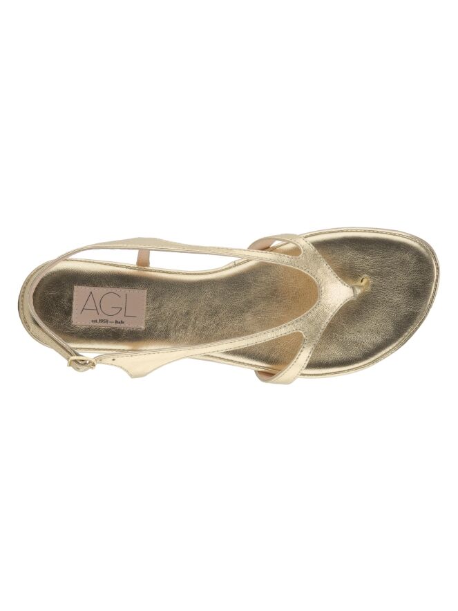 Sandale plate de la marque AGL, en cuir de couleur platine. La bride réglable de fermeture au niveau du talon entoure le pied jusqu'à la pointe à l'orteil.