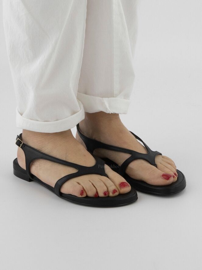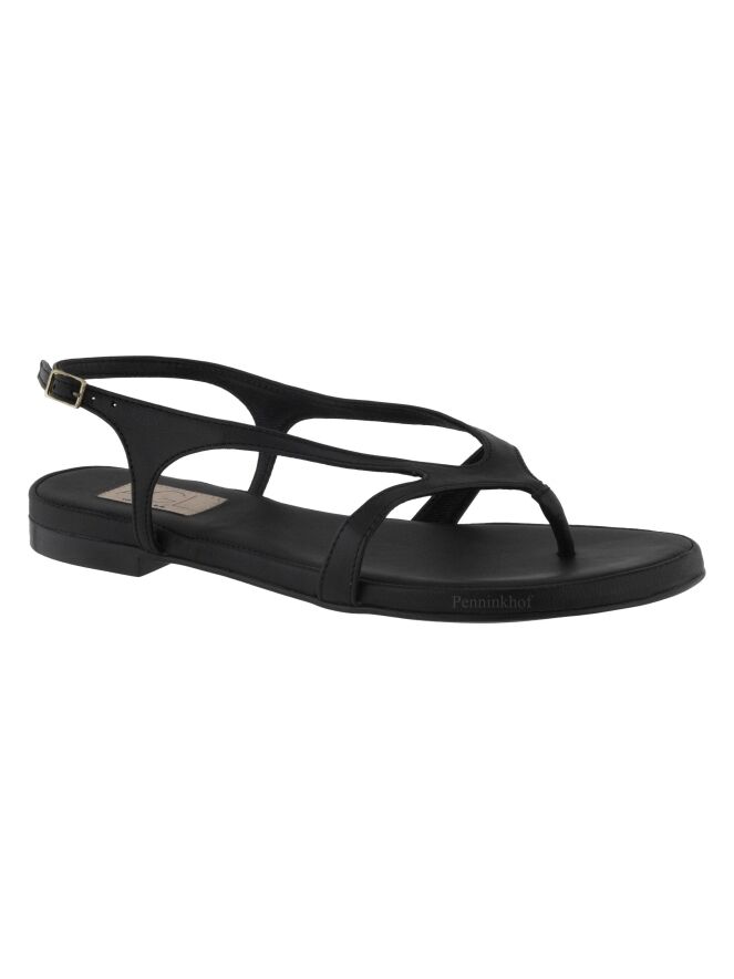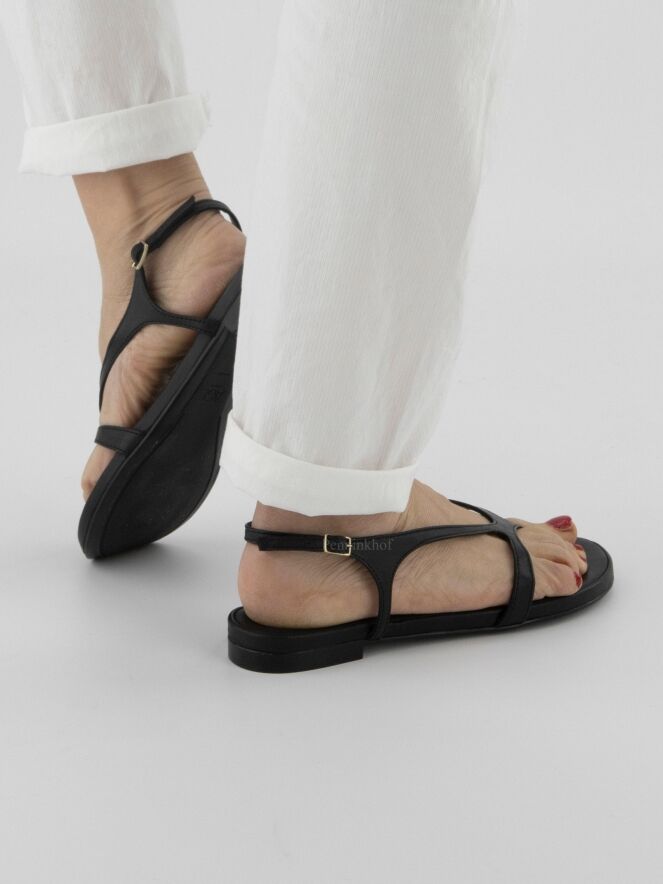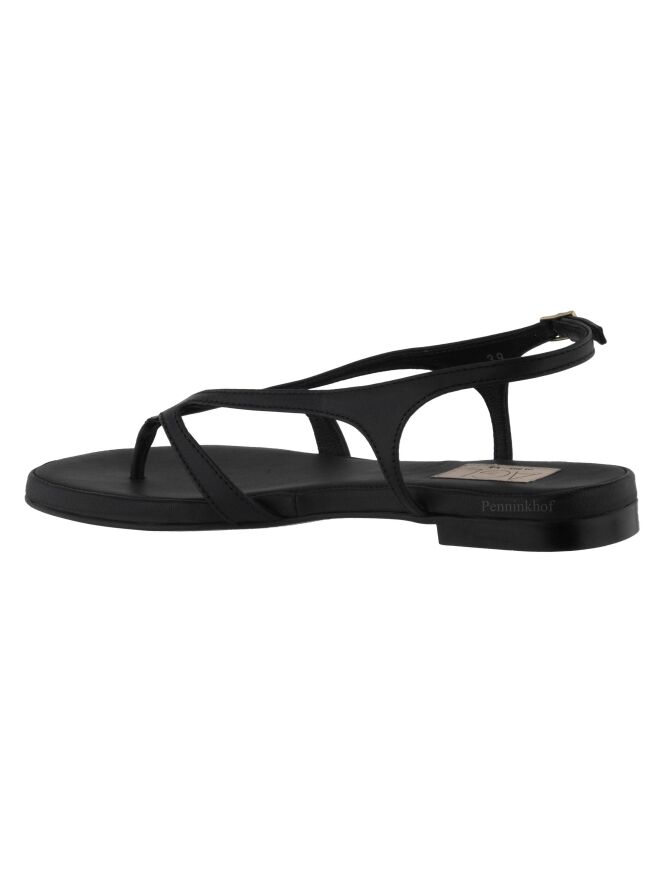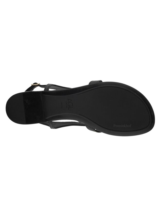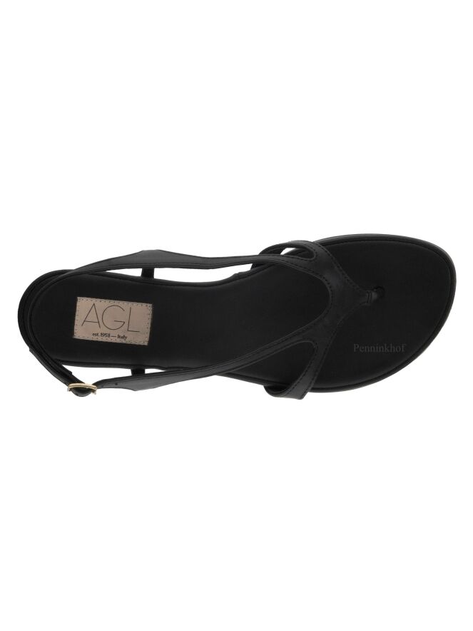 Sandale plate de la marque AGL, en cuir de couleur noire. La bride réglable de fermeture au niveau du talon entoure le pied jusqu'à la pointe à l'orteil.
