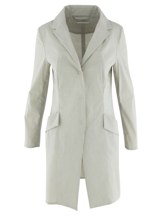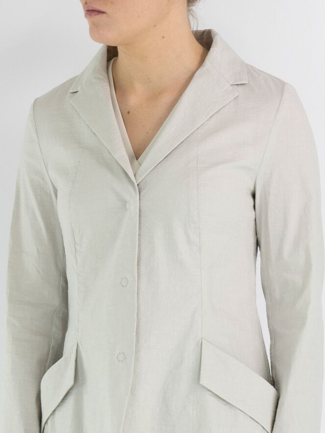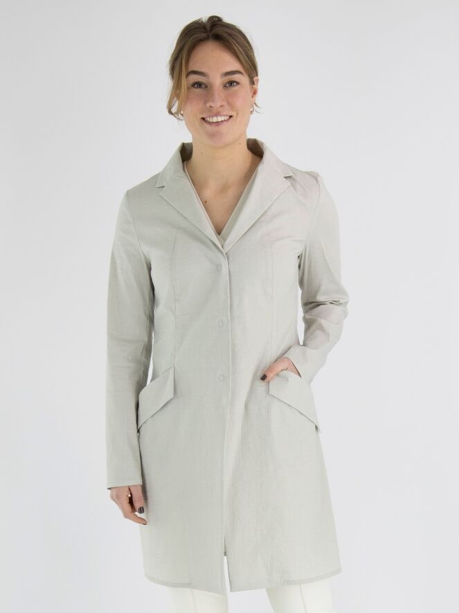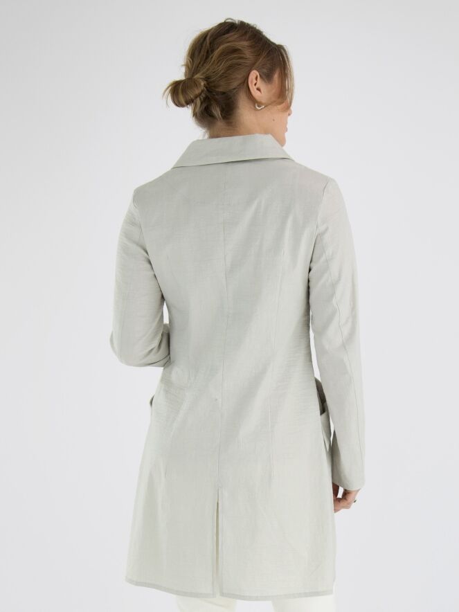 Un long blazer d'Annette Görtz de couleur sable. Le tissu est légèrement froncé et le blazer se ferme par trois boutons. Les poches fendues au niveau de la taille sont largement retroussées. En bas, une fente est pratiquée dans le dos. Ce blazer n'est pas doublé et peut être lavé à 30 degrés.
