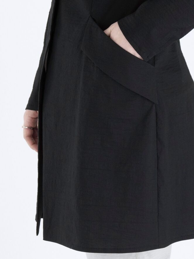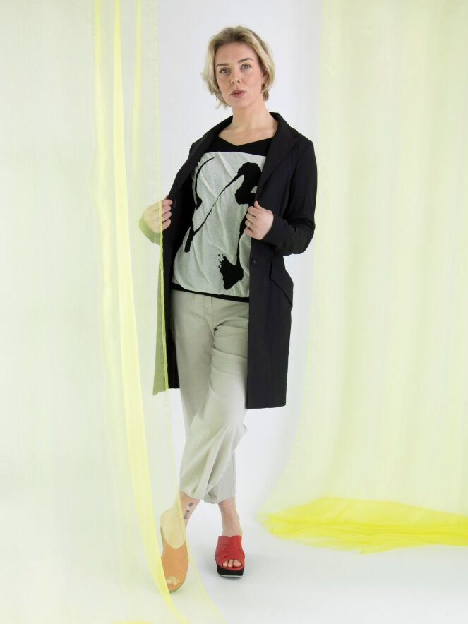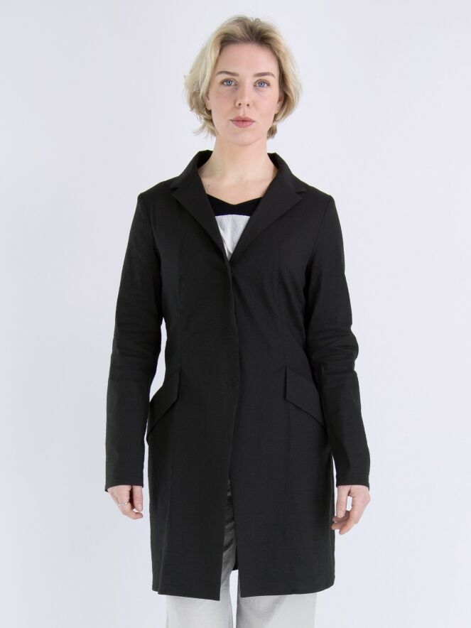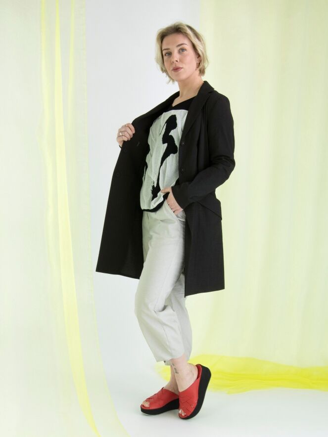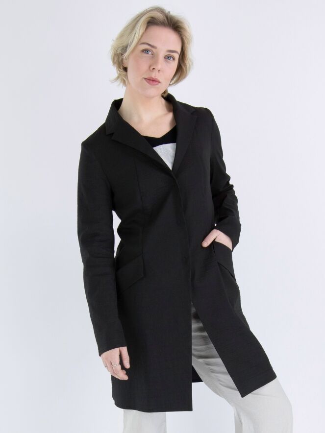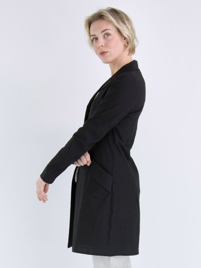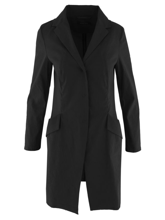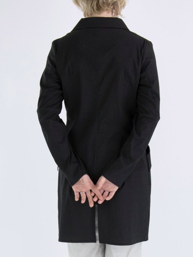 Un blazer long d'Annette Görtz en noir. Le tissu est légèrement froncé et le blazer se ferme par trois boutons. Les poches fendues au niveau de la taille sont largement retroussées. En bas, il y a une fente au dos. Ce blazer n'est pas doublé et peut être lavé à 30 degrés.