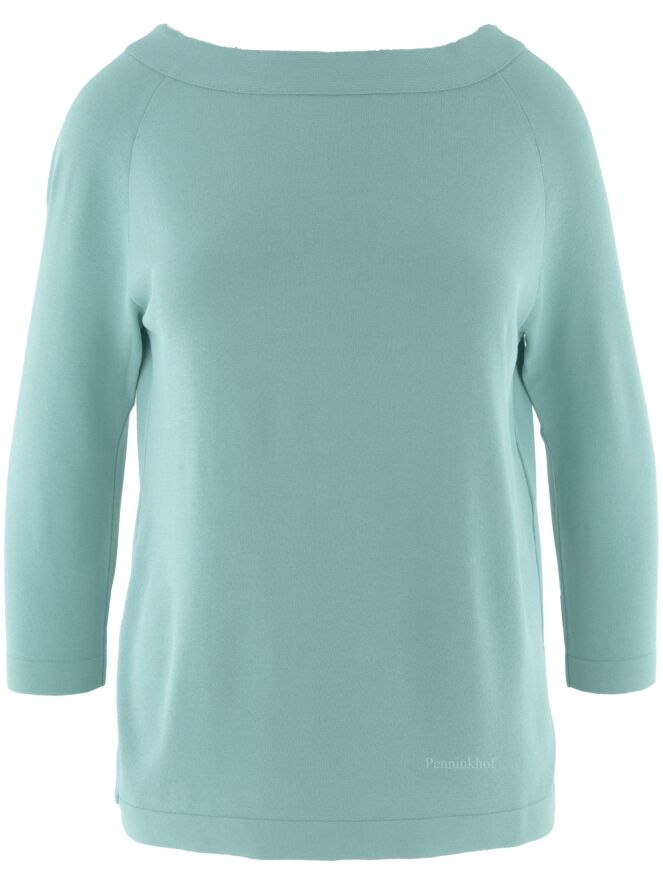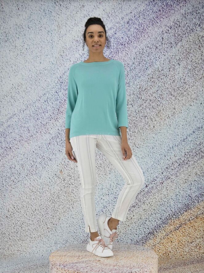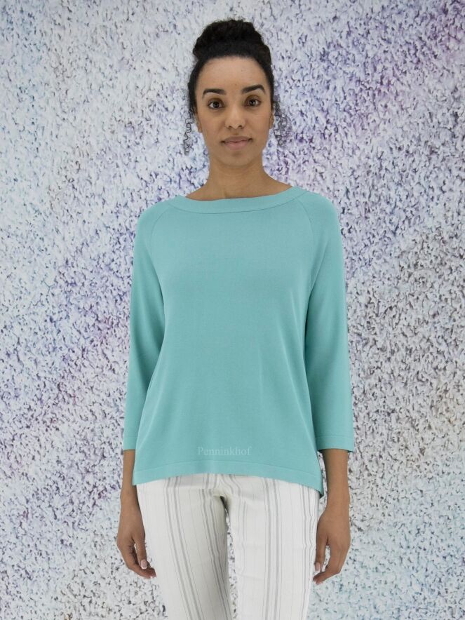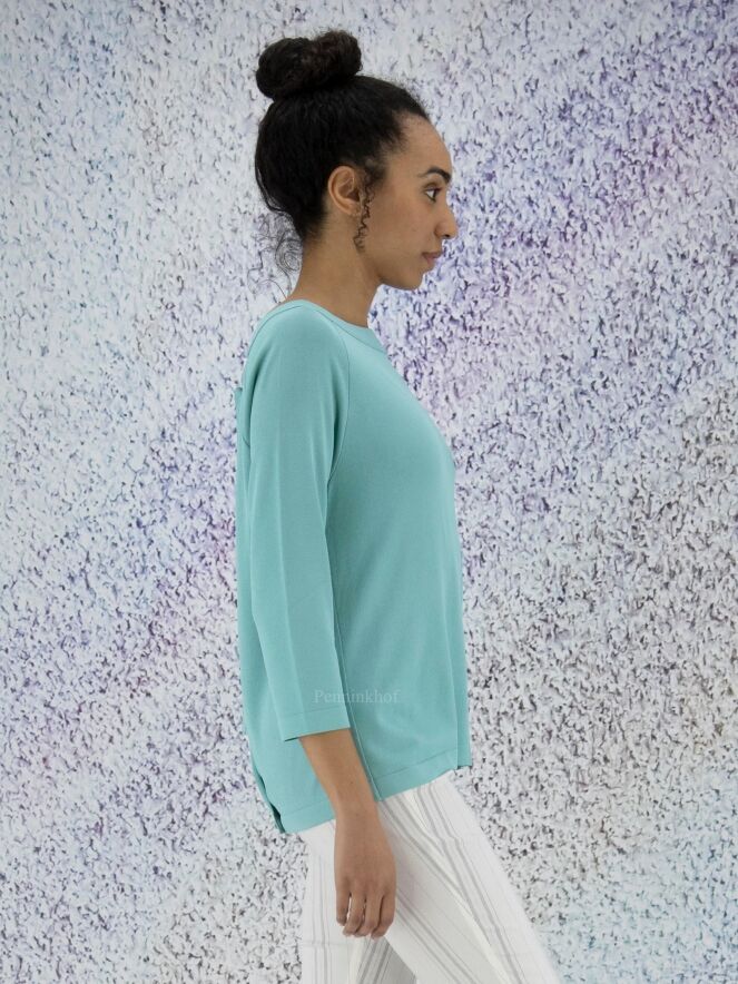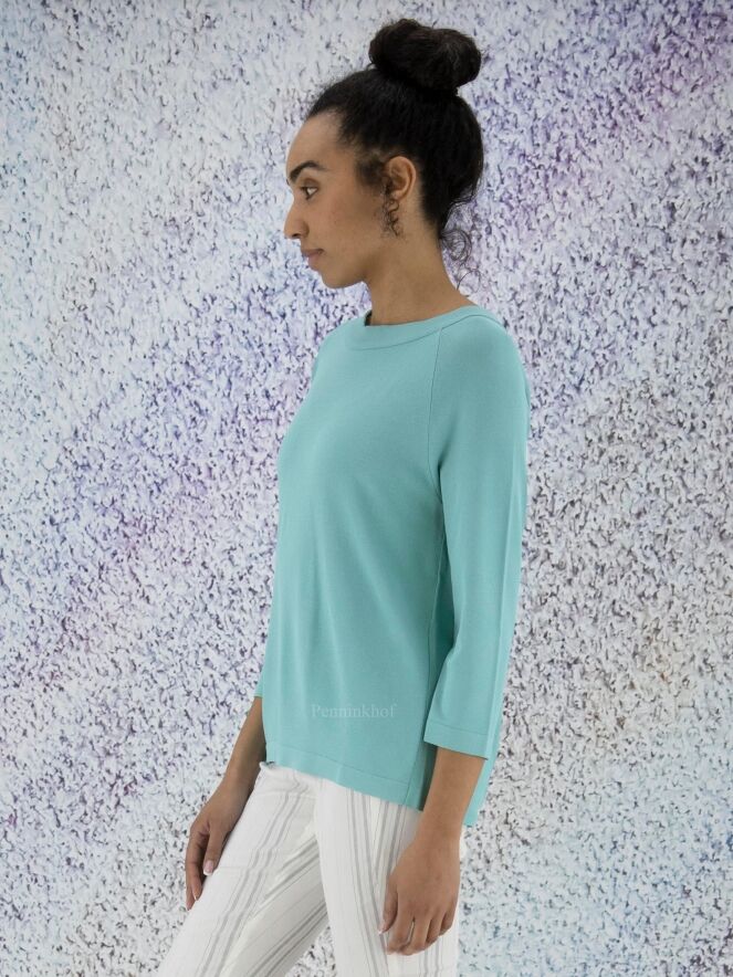 Tee-shirt de la marque Annette Görtz, de couleur turquoise. Il présente une large encolure bateau et des manches mi-longues. Un chevauchement courbe à fermeture à boutons en bas et à l'encolure agrémente le dos. Lavage à la main.