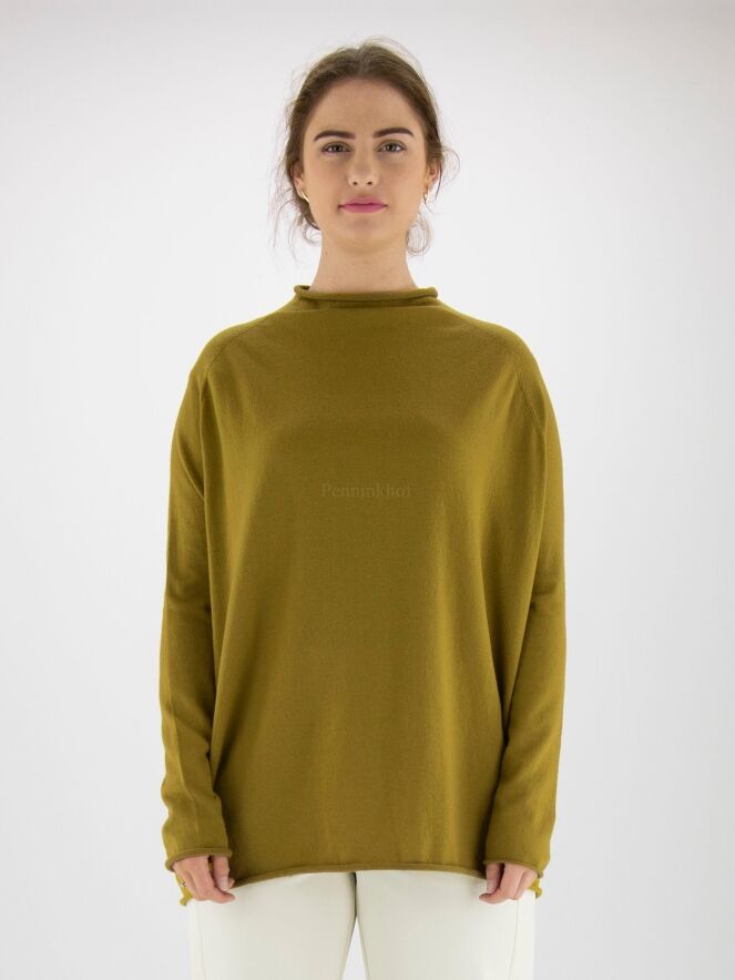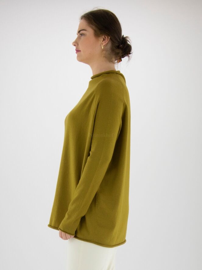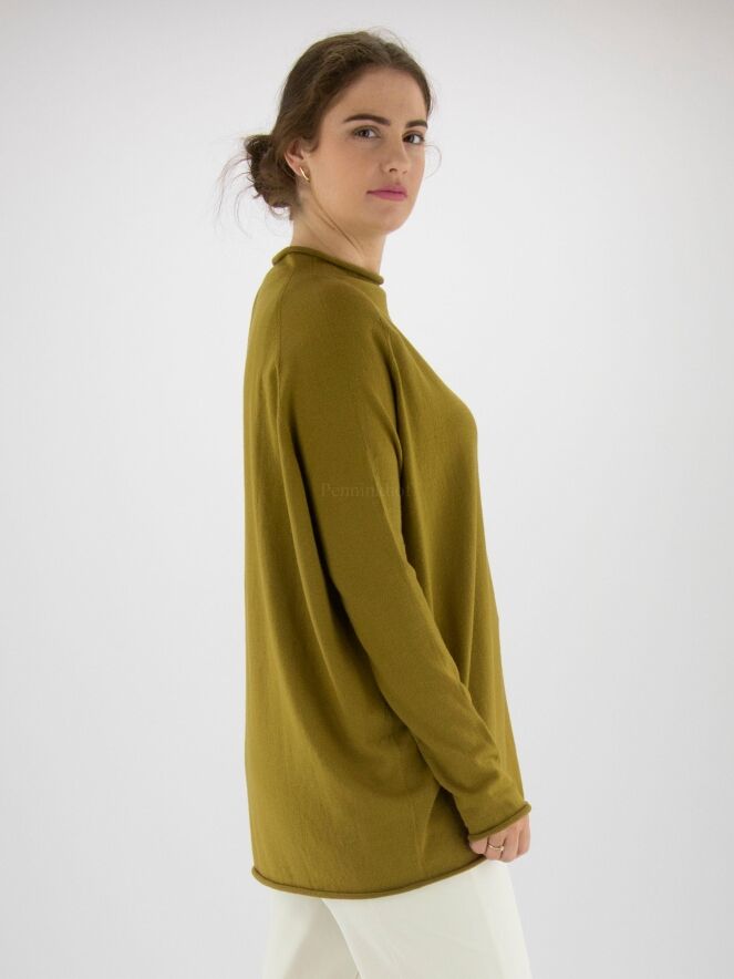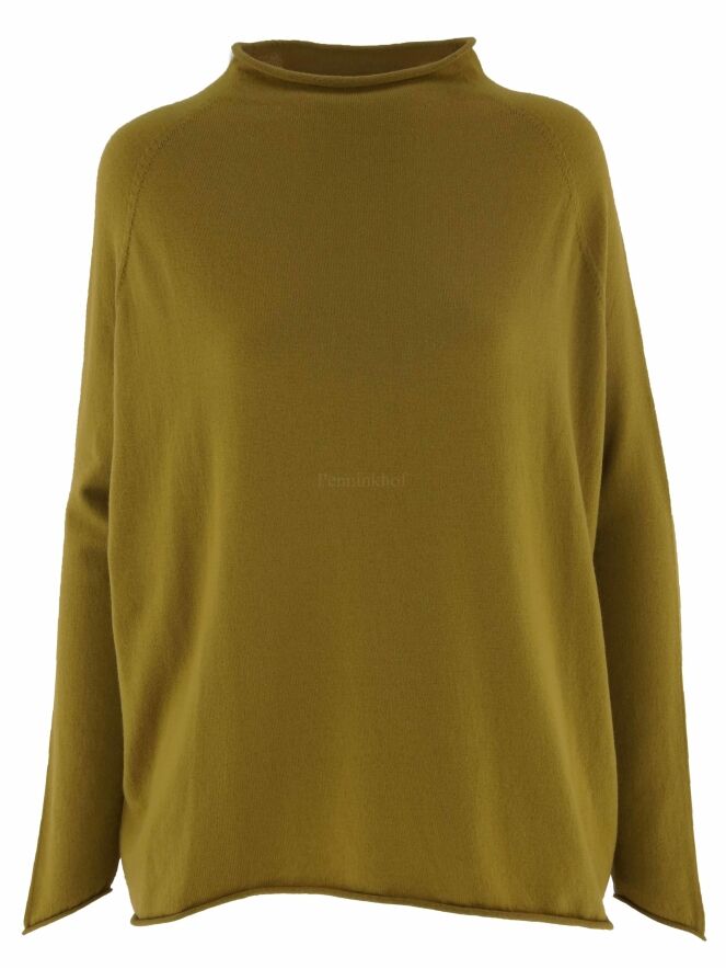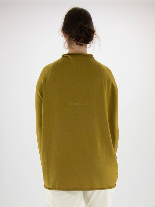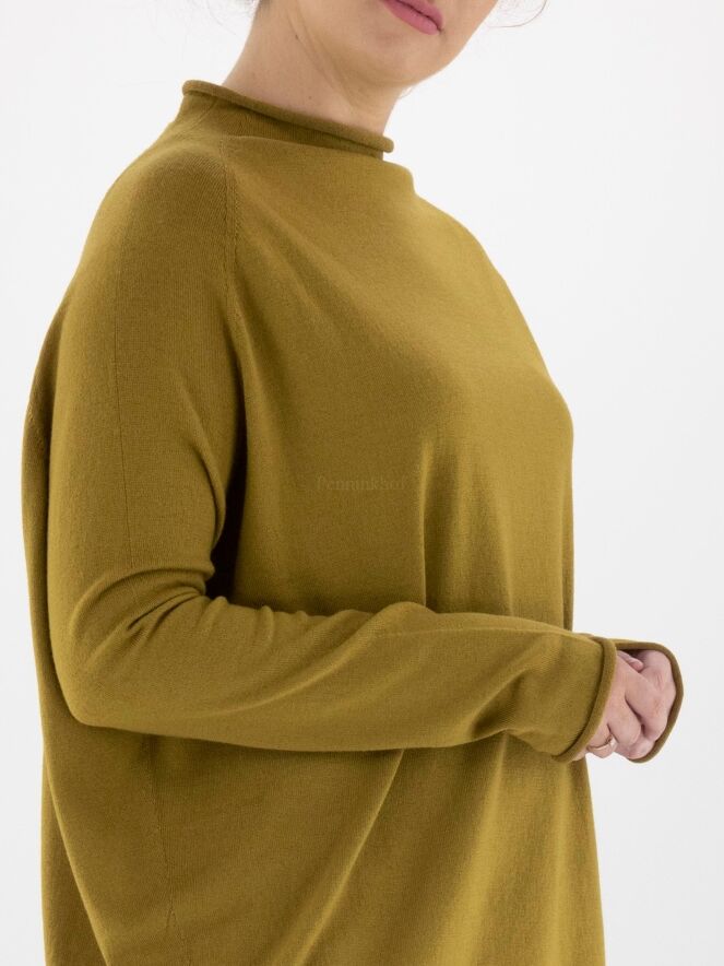 Pull luxueux et spacieux d'Annette Görtz en jaune ocre. Le bord du col rond, l'extrémité des manches et le bas sont froncés. Ce pull peut être lavé à la main.