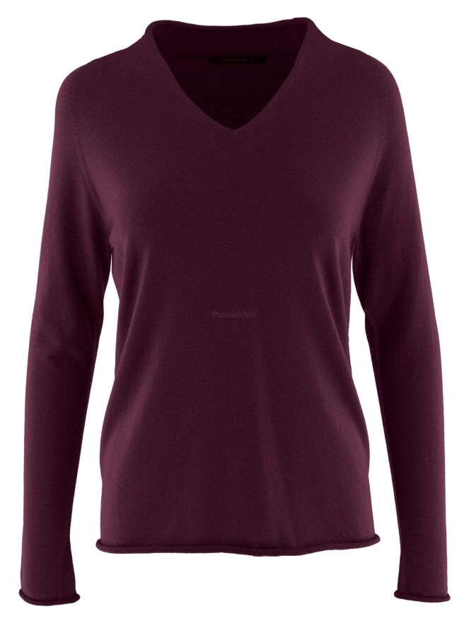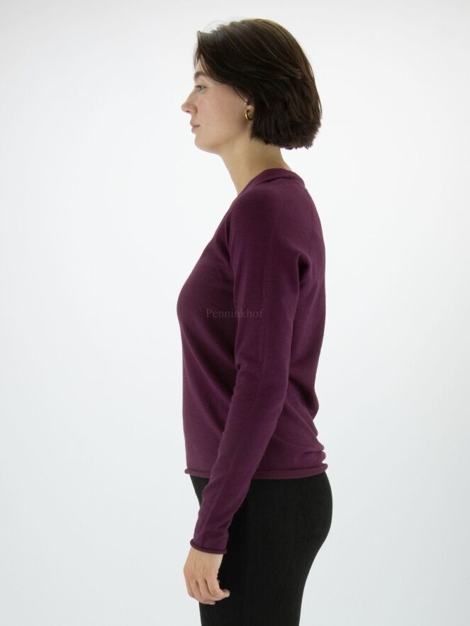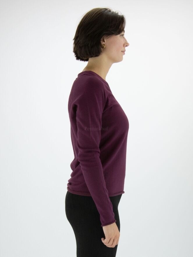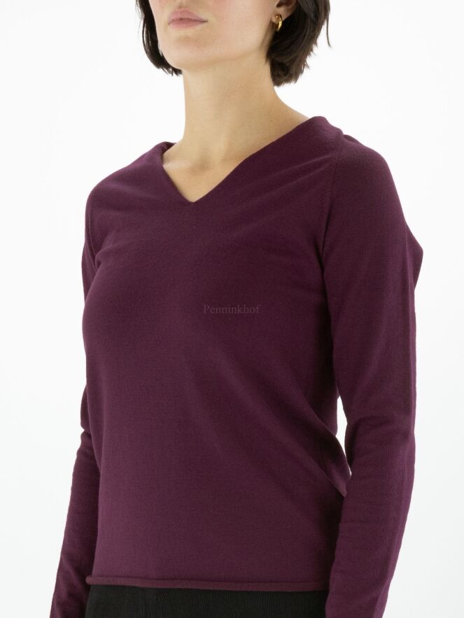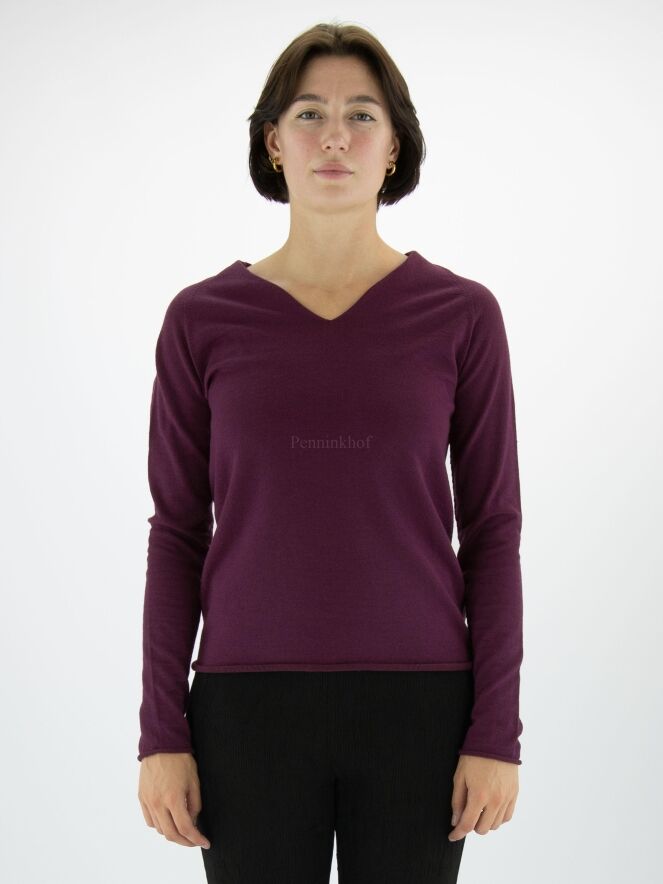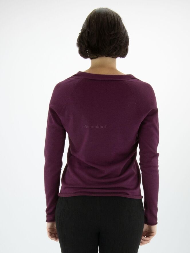 Pull d'Annette Görtz de couleur violette. Le pull a un col en V et le bord du bas avec les extrémités des manches longues est volanté. Ce pull peut être lavé à la main.