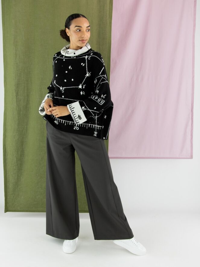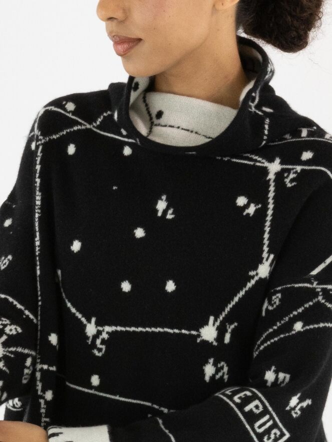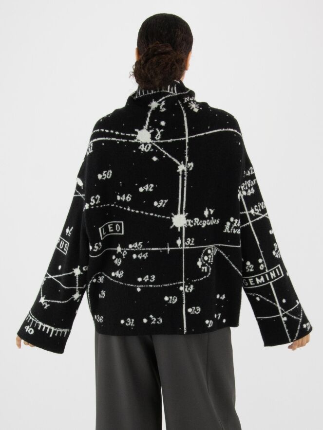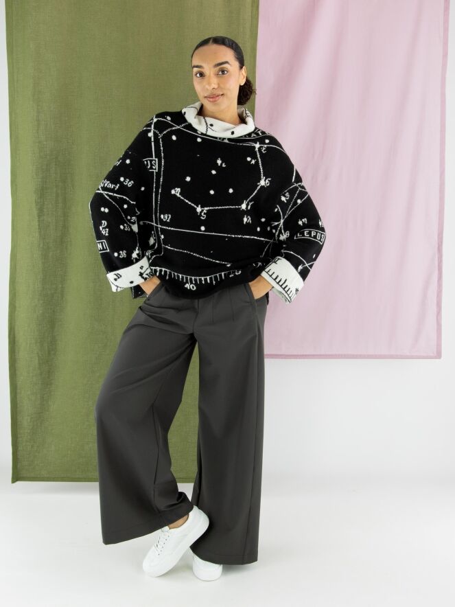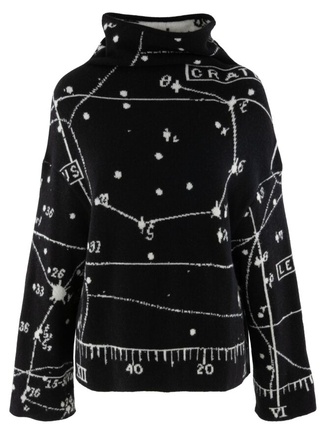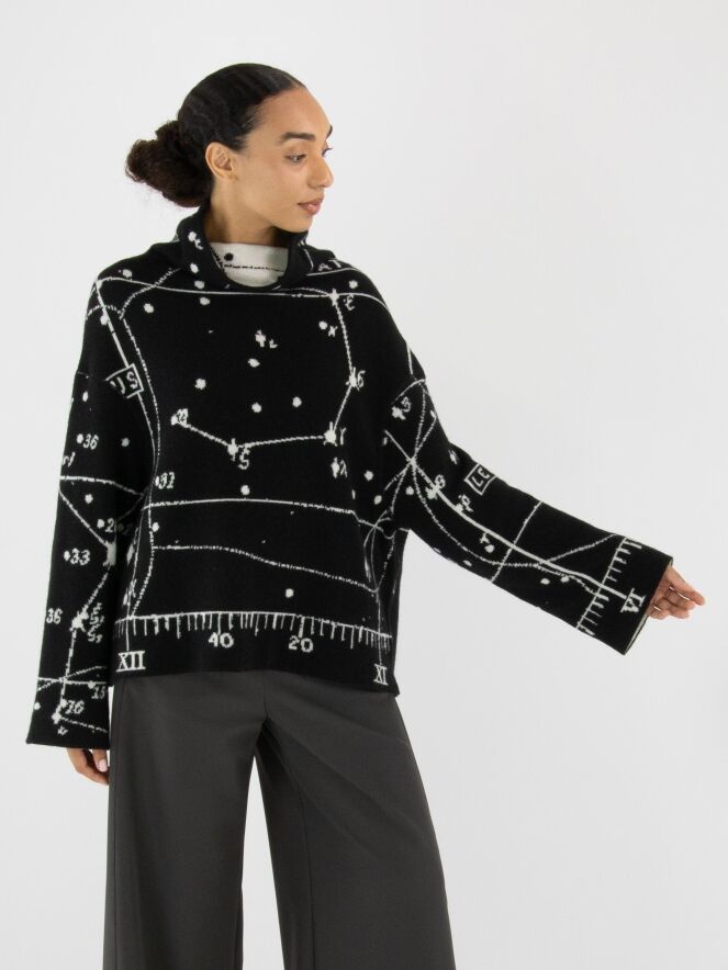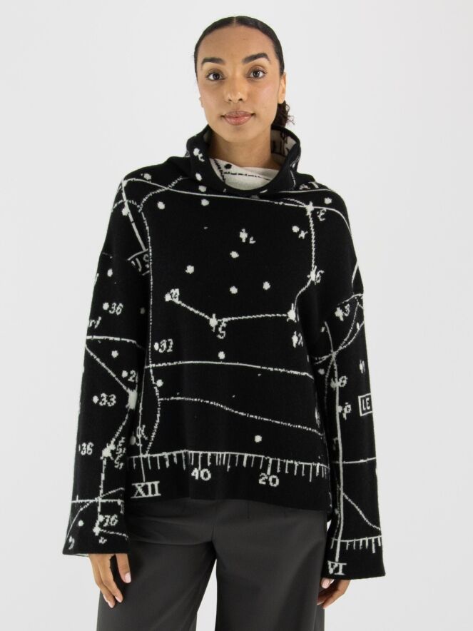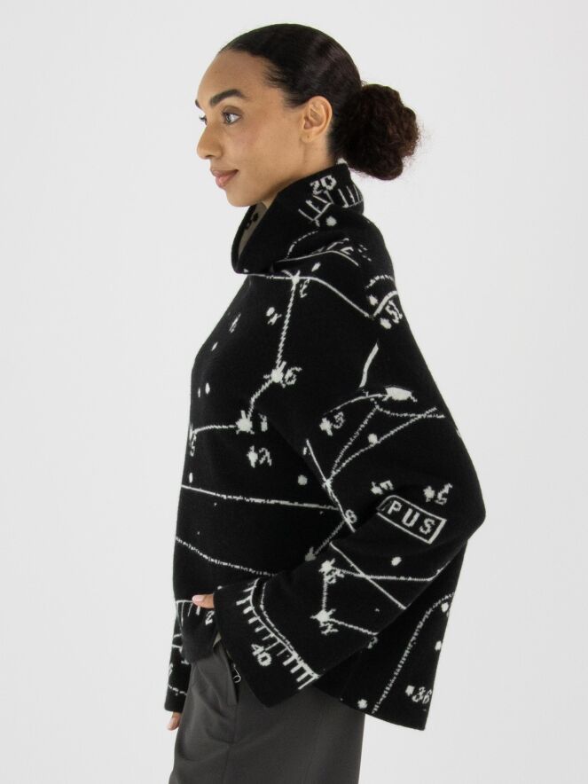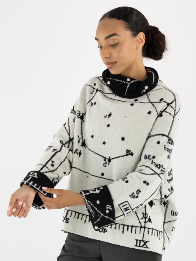 Un pull réversible ample et luxueux d’Annette Görtz avec un imprimé graphique noir et blanc cassé. Le pull est doté d’un col roulé souple. Le côté réversible présente le motif en blanc avec du noir. Ce pull doit être lavé à la main.