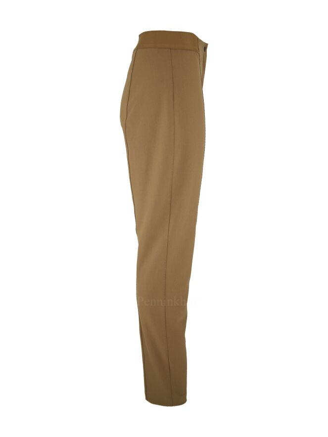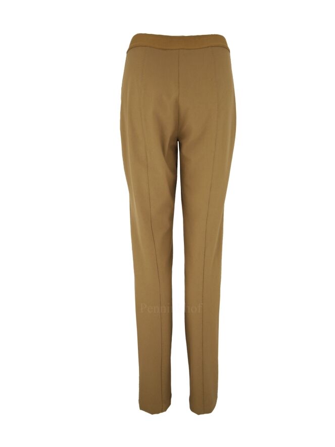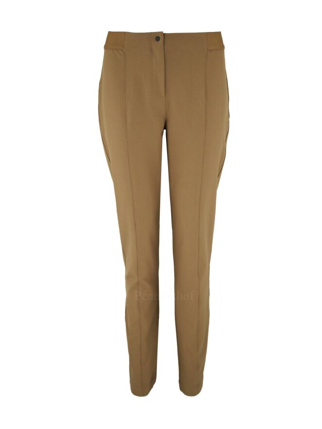 Pantalon de luxe à tissu élastique de couleur camel, de la marque Annette Görtz. Une bande élastique cognac est présente sur les côtés et dans le dos au niveau de la taille. Le milieu des jambes est orné d'une piqûre décorative sur toute sa hauteur. Lavage à 30 degrés.