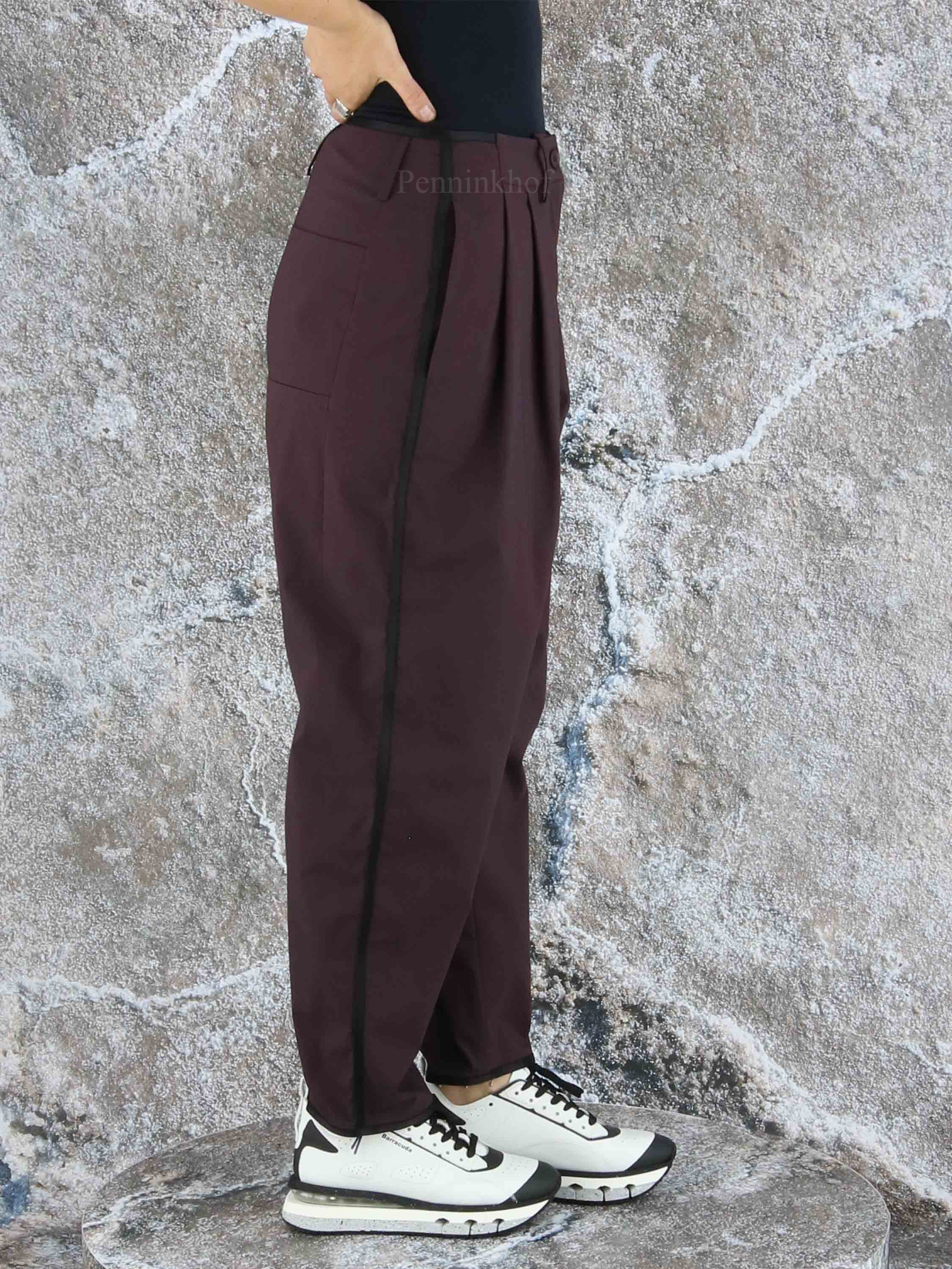 Pantalon large taille haute de la marque Annette Görtz, de couleur lie de vin. Il présente de larges plis. Poches latérales fendues et plaquées à l'arrière. Lavage à 30 degrés.