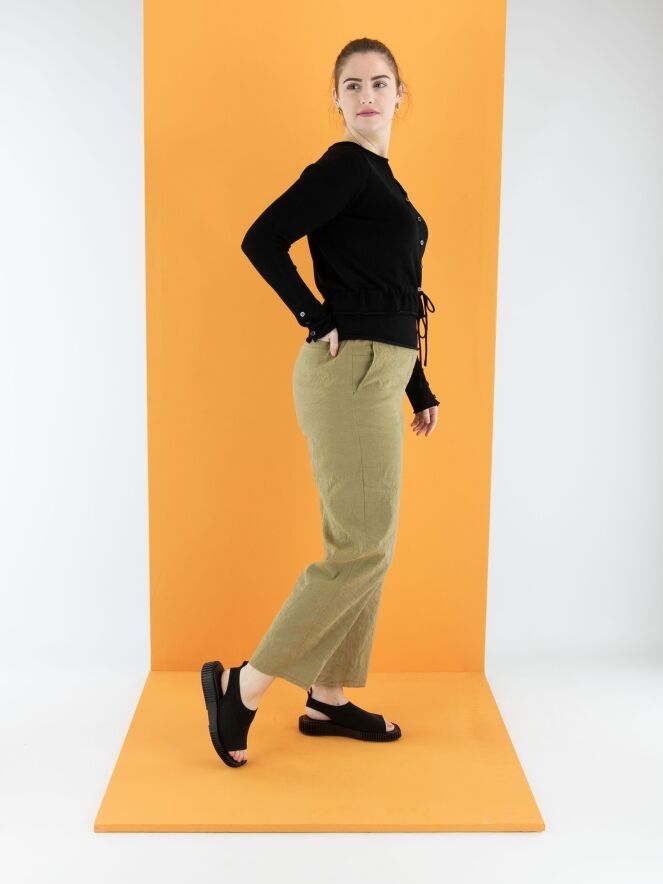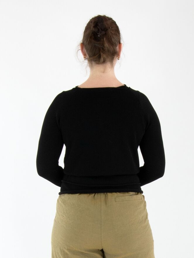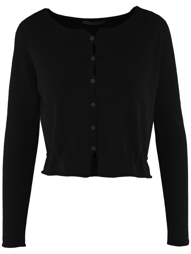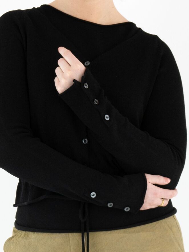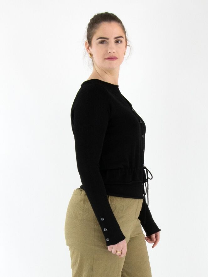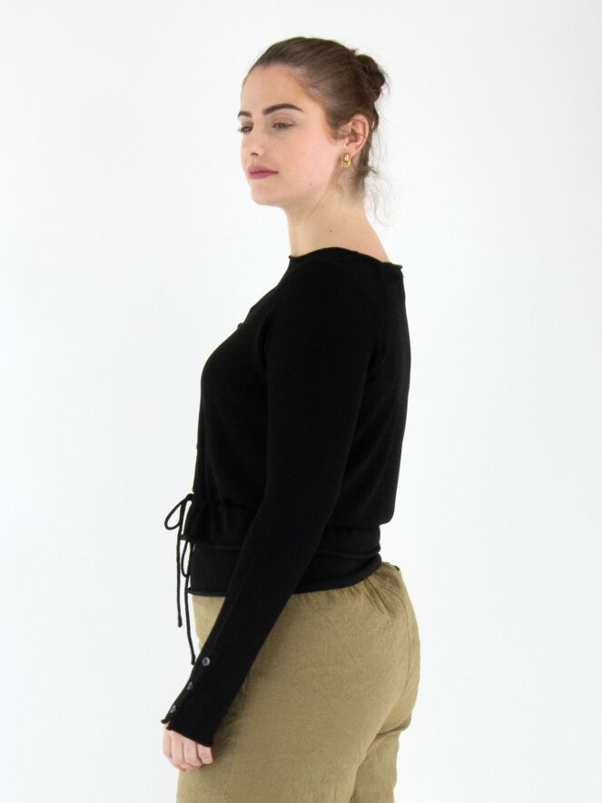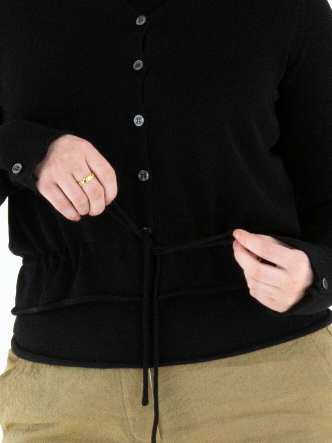 Un gilet court d'Annette Görtz en noir. Ce gilet présente une large encolure ronde et une fermeture boutonnée. À cinq centimètres au-dessus de l’ourlet, un cordon dans une couture tunnel permet de créer un effet plissé. Ce gilet doit être lavé à la main.