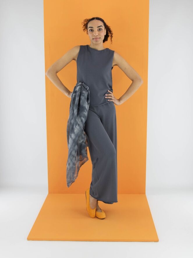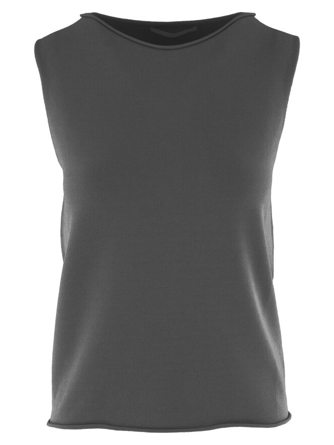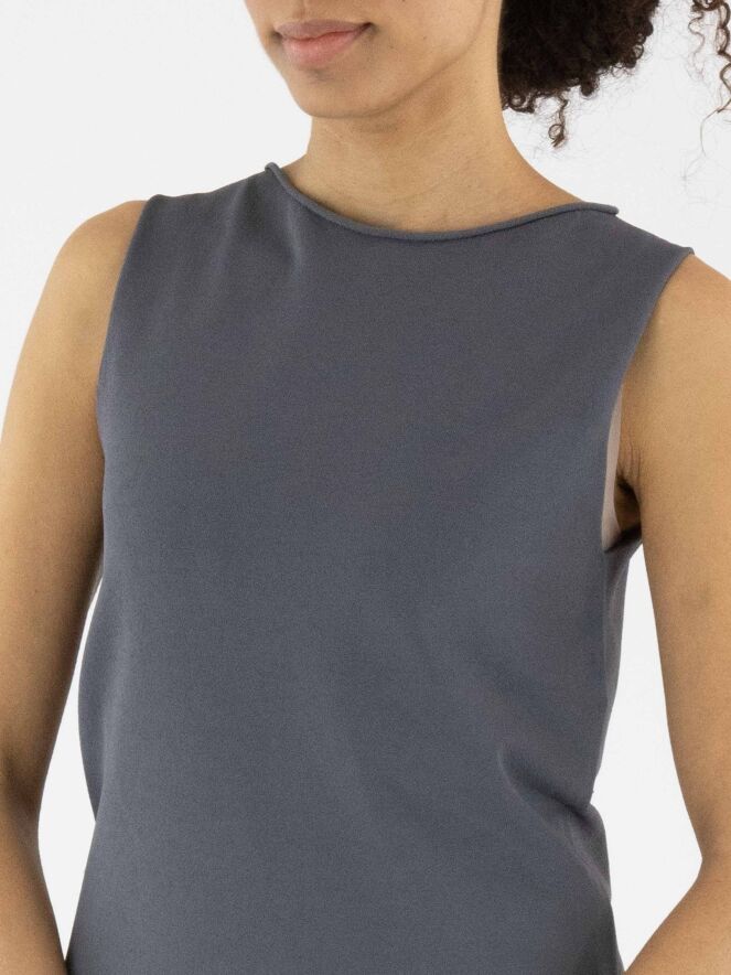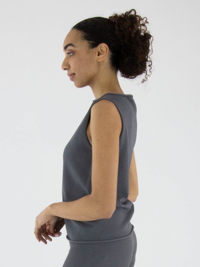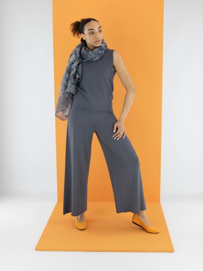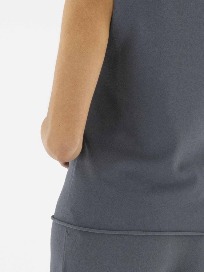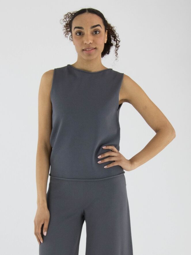 Un top d'Annette Görtz en gris. L'encolure ronde et le bas du top sont finement froncés. Ce top peut être lavé à 30 degrés.