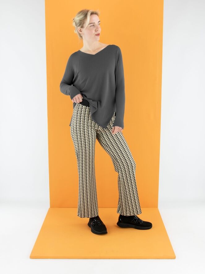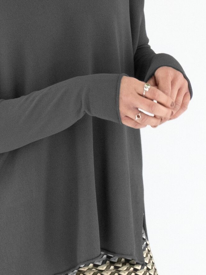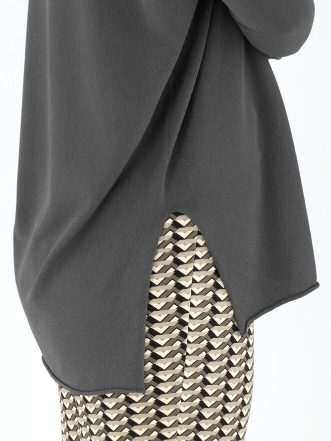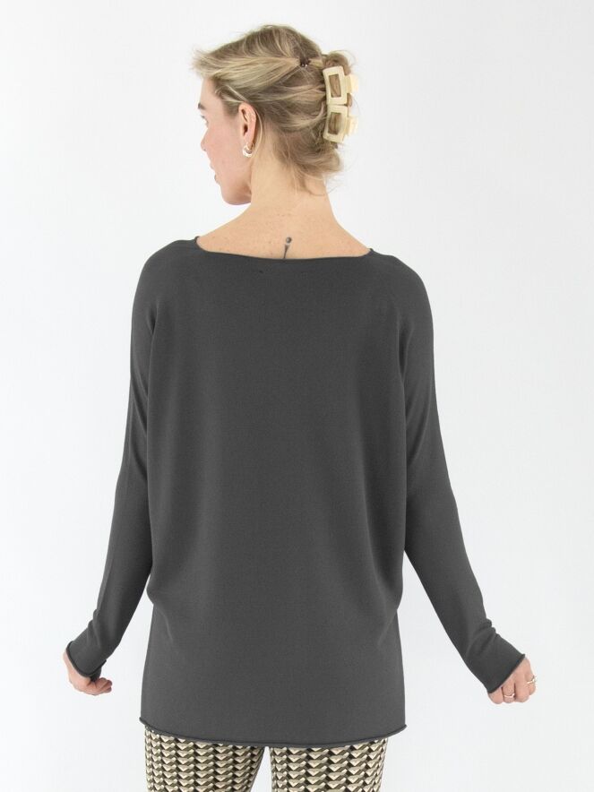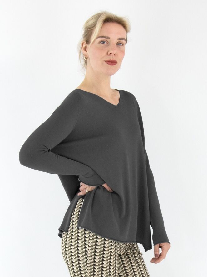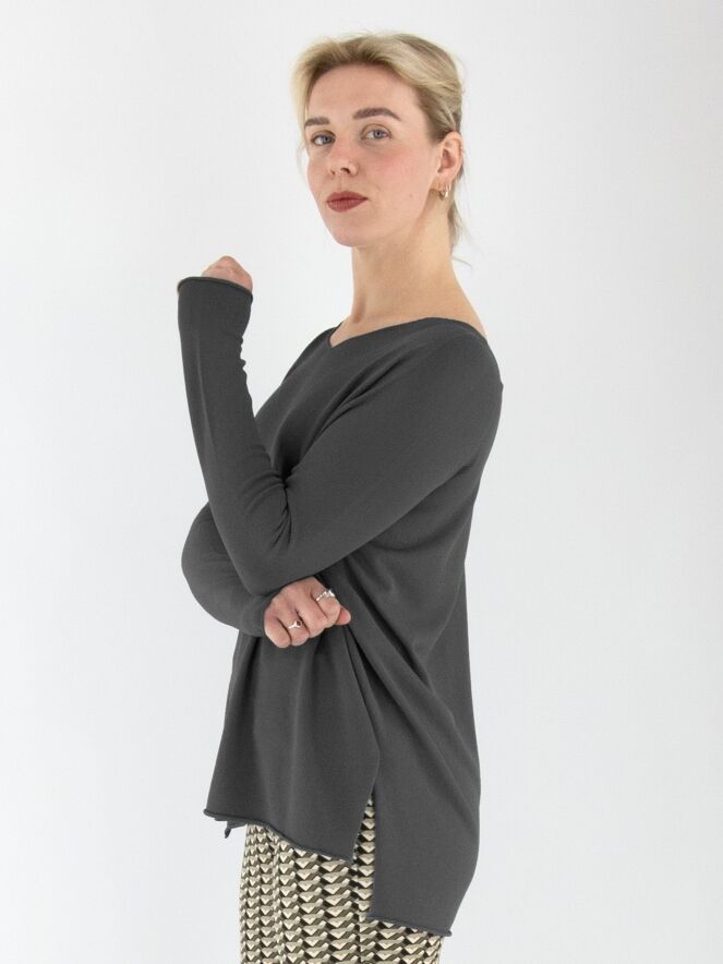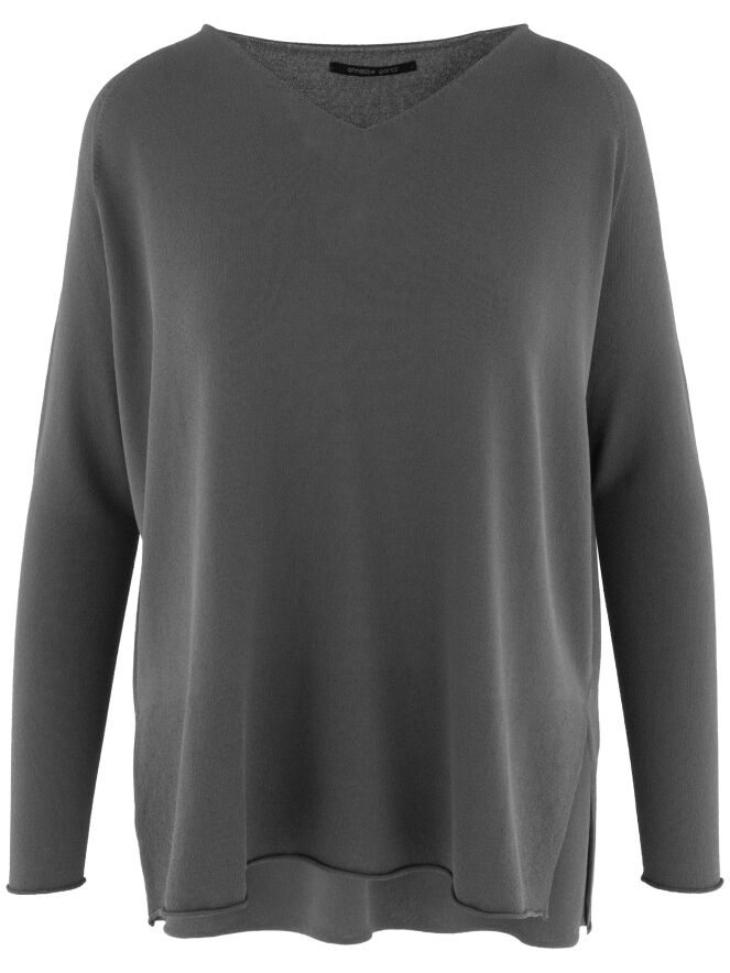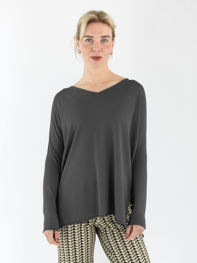 Un pull luxueux en fine maille d'Annette Görtz en gris foncé. Ce pull présente un col en V et de profondes fentes sur les deux côtés en bas. Ce pull doit être lavé à la main.