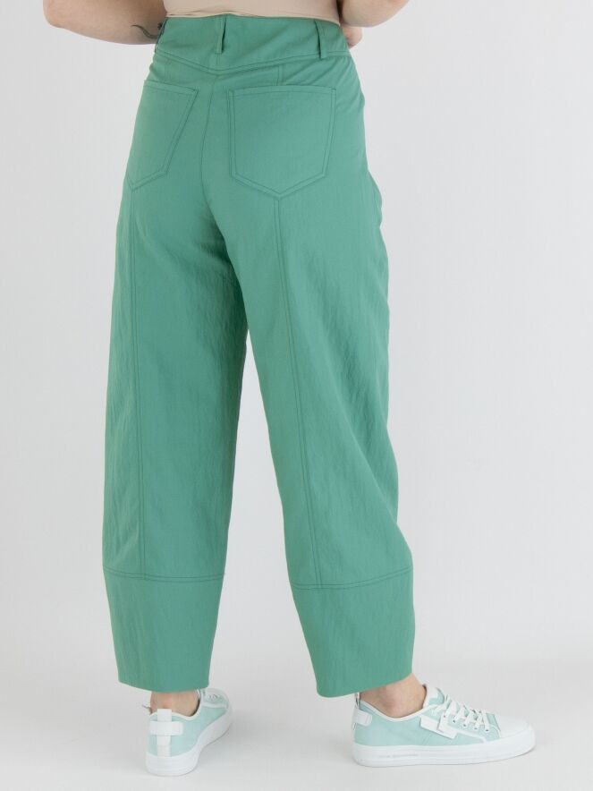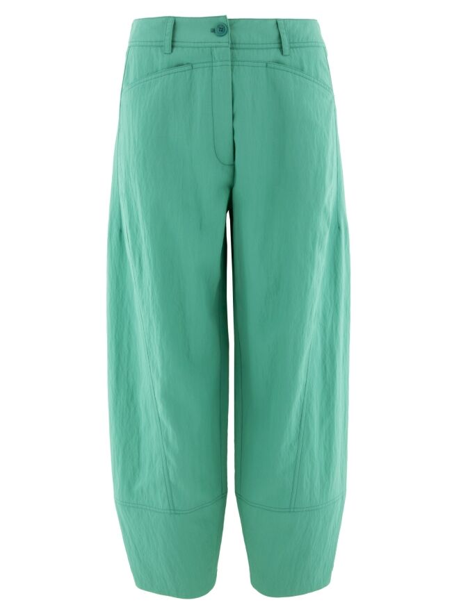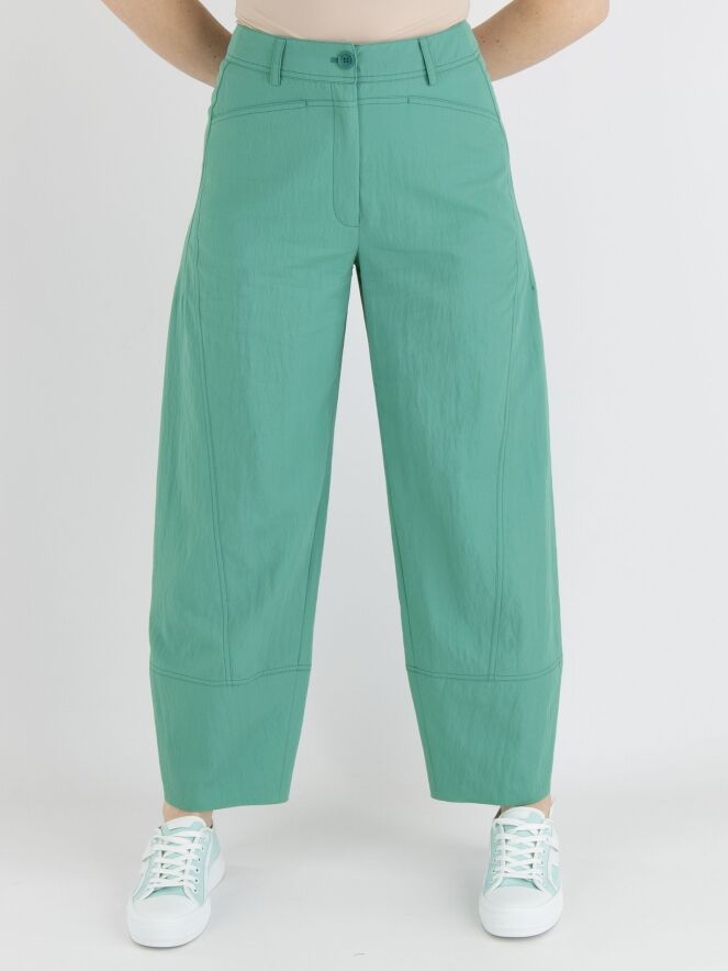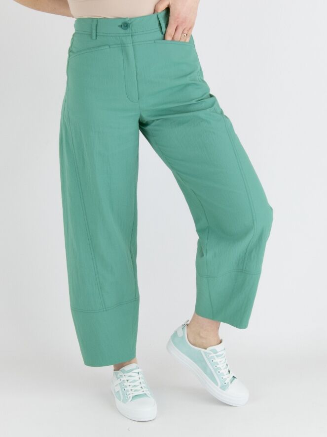 Un pantalon d'Annette Görtz dans un tissu légèrement froissé de couleur turquoise. Le pantalon a des jambes larges et des poches sous la taille. Ce pantalon peut être lavé à 30 degrés.