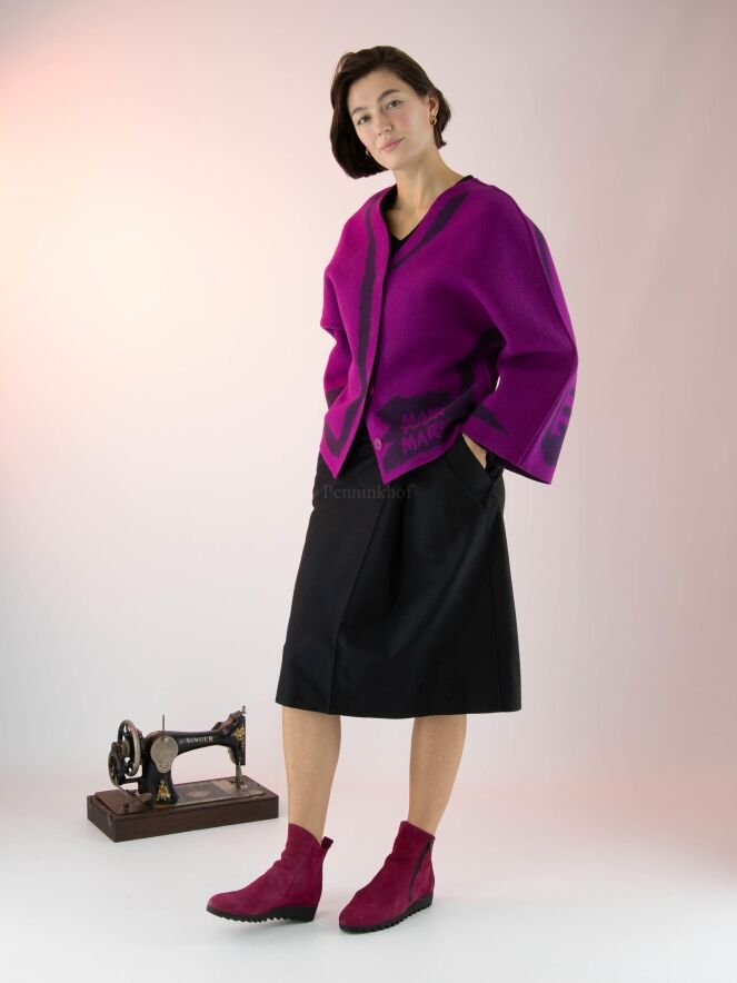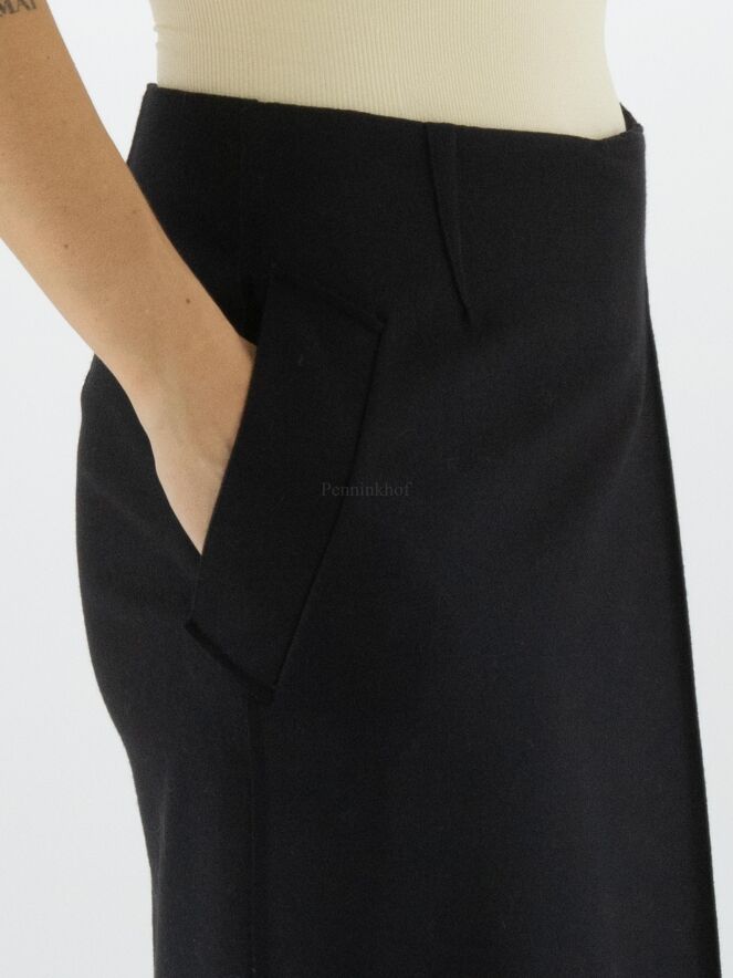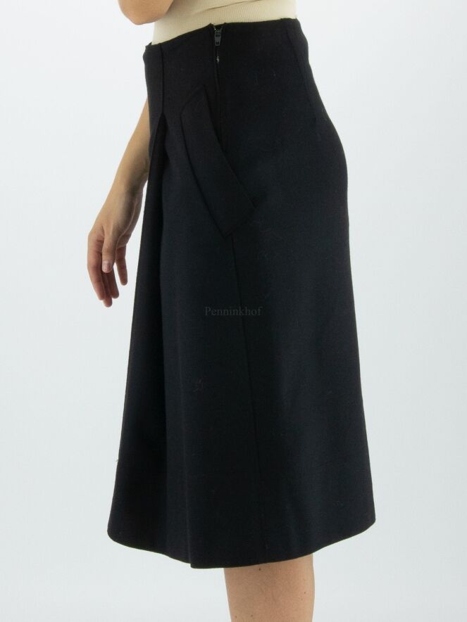 Jupe d'Annette Görtz en laine bouillie de couleur noire. Sur le devant, il y a un pli d'aisance à gauche du centre. La jupe a des poches fendues et ne doit pas être lavée.