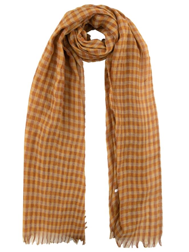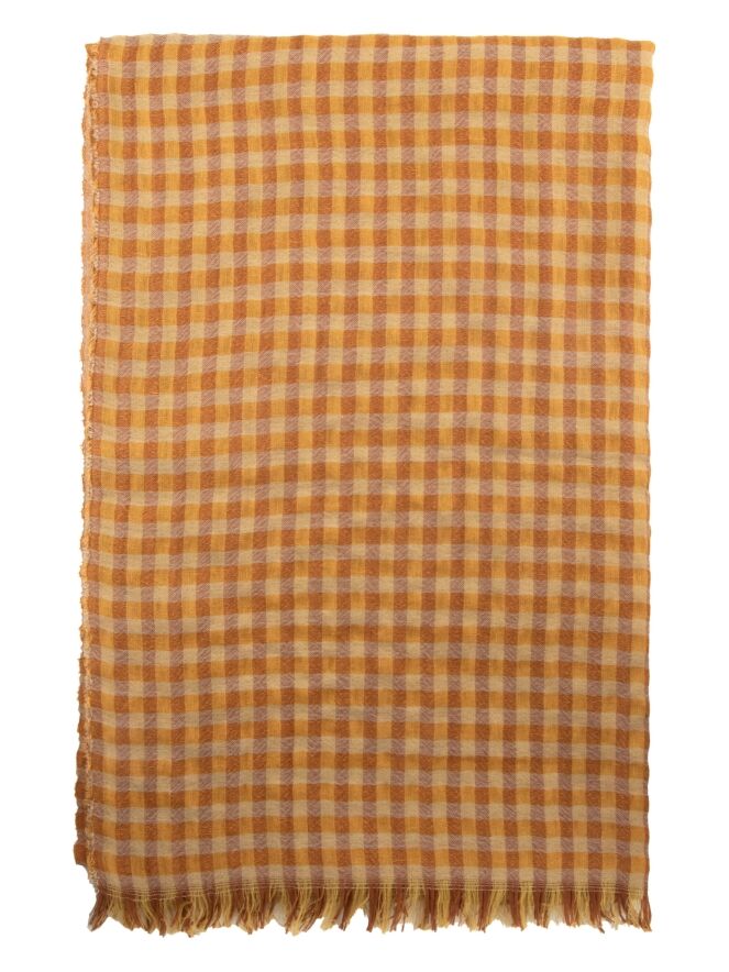 Un châle luxueux et légèrement transparent d’Annette Görtz avec un motif à carreaux dans plusieurs nuances d’orange et de beige. Les bords du châle sont finement effilochés. Ce châle peut être lavé à la main.