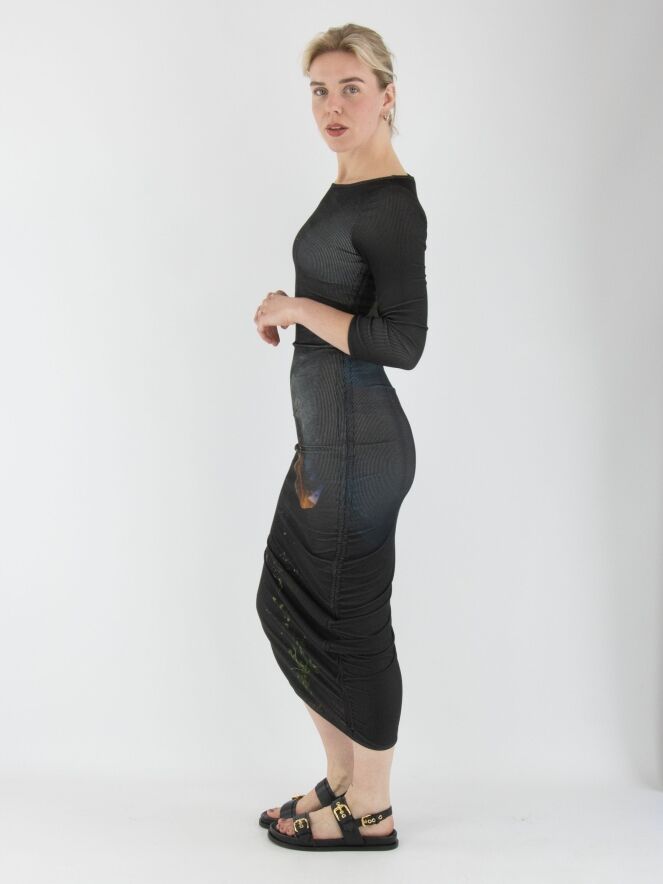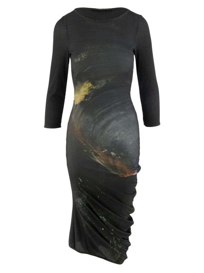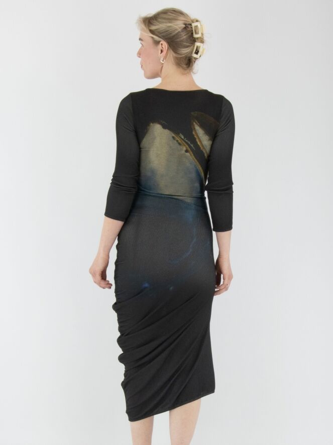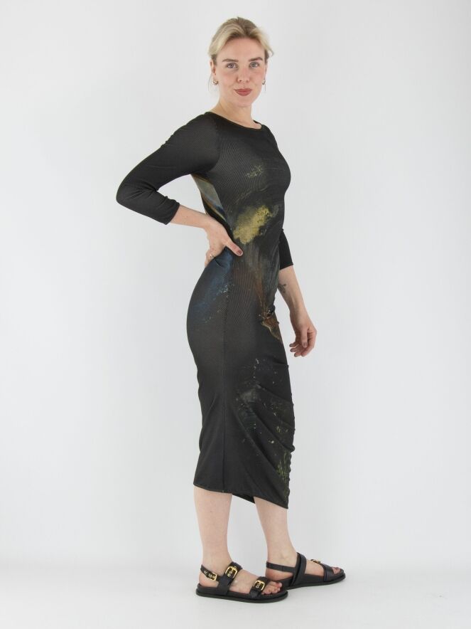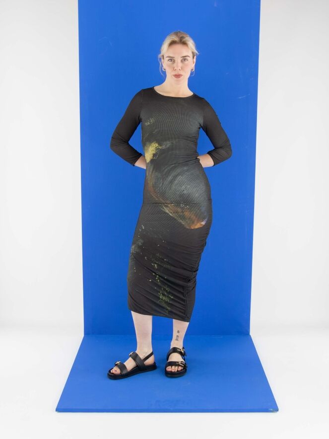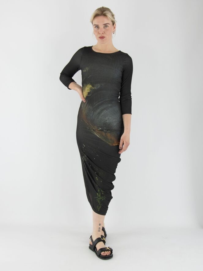 Une robe d’Annette Görtz avec un imprimé graphique, où le jaune est la couleur dominante sur un fond anthracite. Le tissu est finement côtelé et élastique. Le long de la couture du côté droit, un cordon inséré dans une finition tunnel crée de délicats plis le long de la couture. La robe a des manches mi-longues et une encolure ronde. Cette robe peut être lavée à 30 degrés.