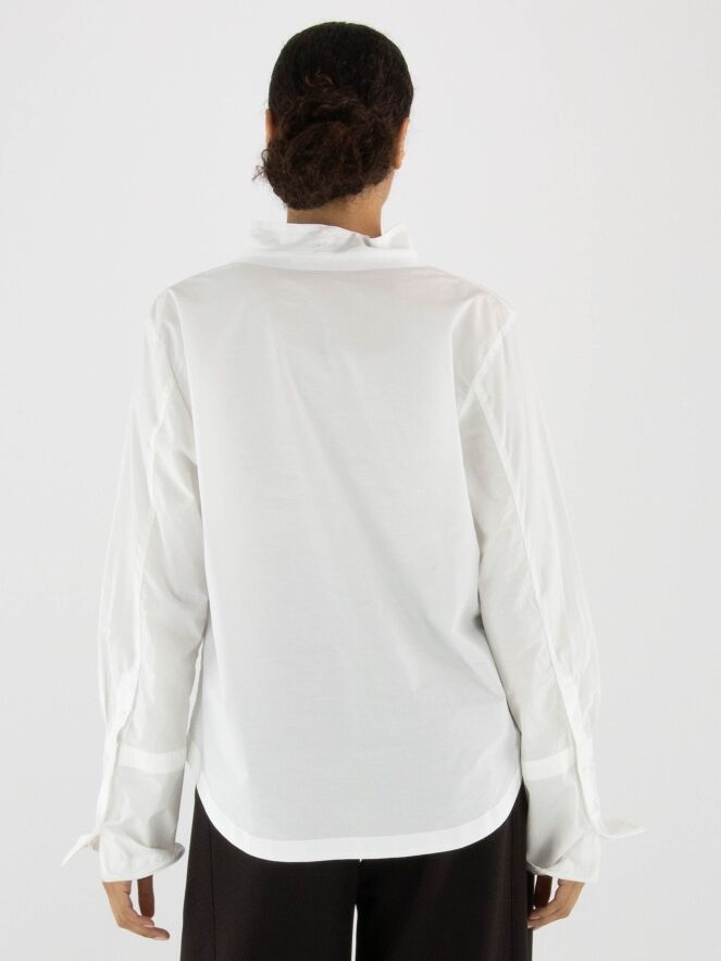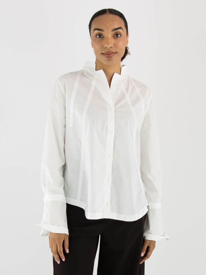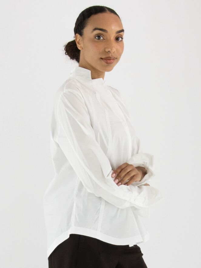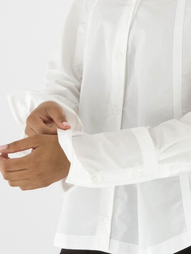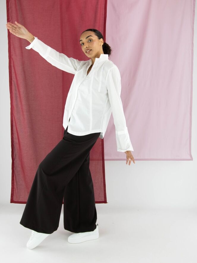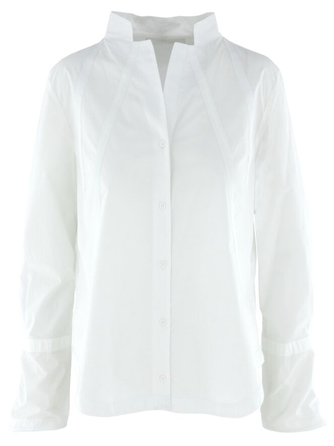 Une blouse Annette Görtz de couleur blanche. Depuis les épaules et l’encolure, de larges bandes finement côtelées descendent en diagonale. Un fil plastique rigide et flexible est intégré dans les poignets des manches longues. Cette blouse peut être lavée à 30 degrés.