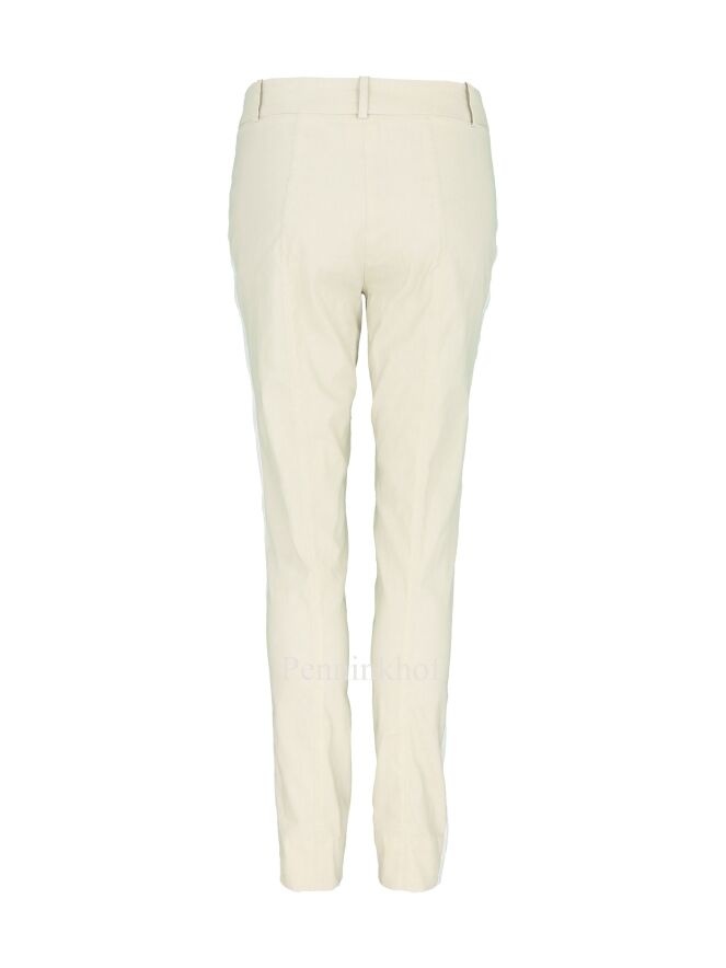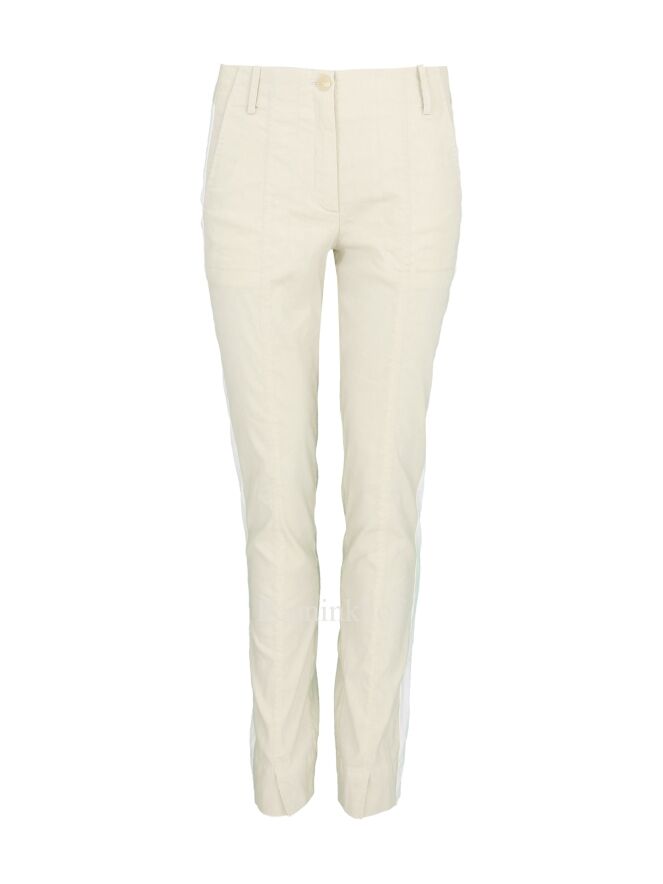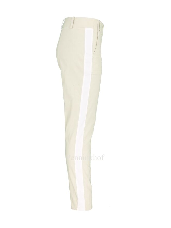 Pantalon de la marque Annette Görtz, de couleur beige. Il est orné d'une large bande blanche sur toute la hauteur du côté de la jambe. Le pantalon présente une petite fente avant au bas de la jambe et des poches latérales. Lavage à 30 degrés.